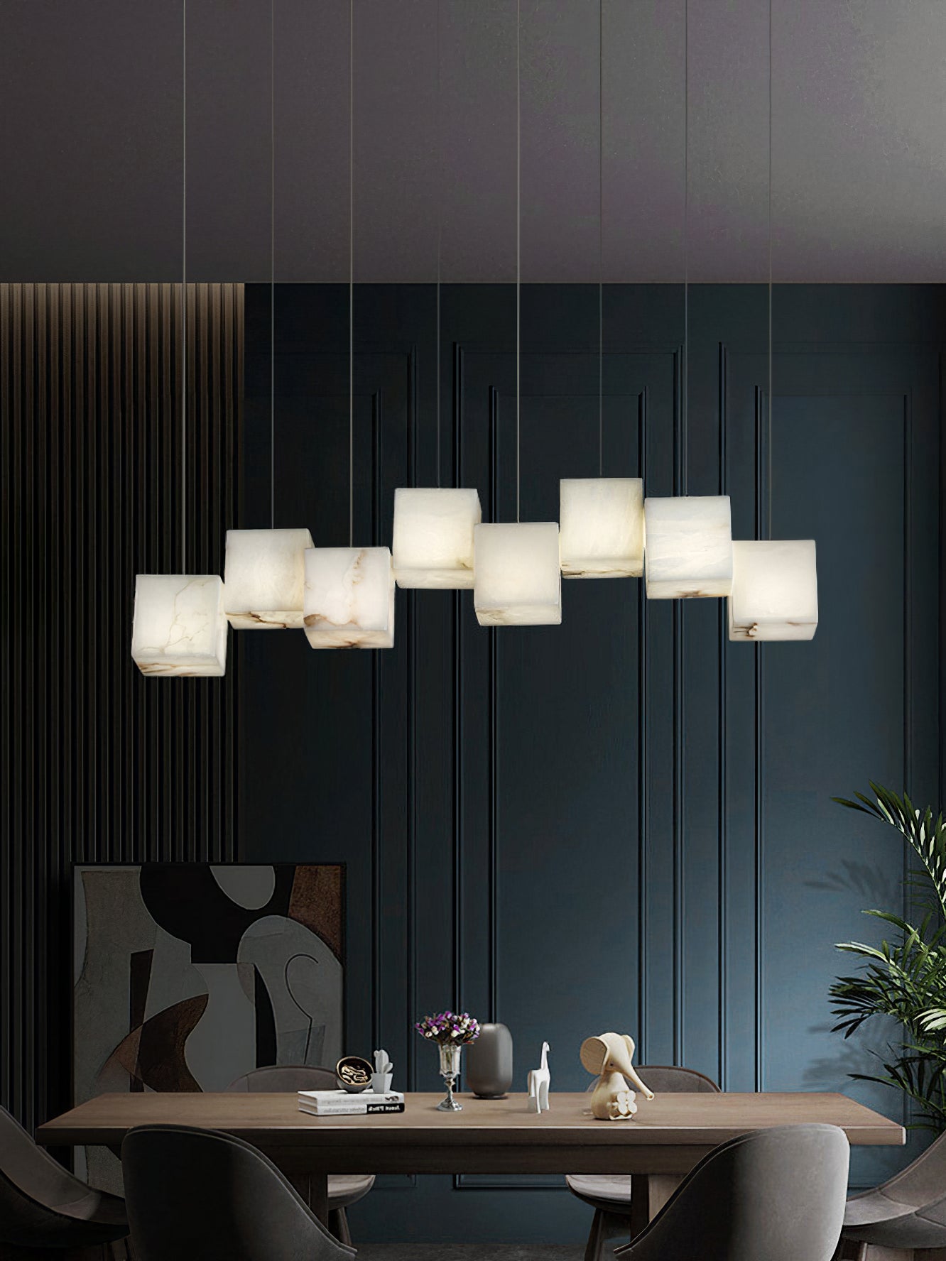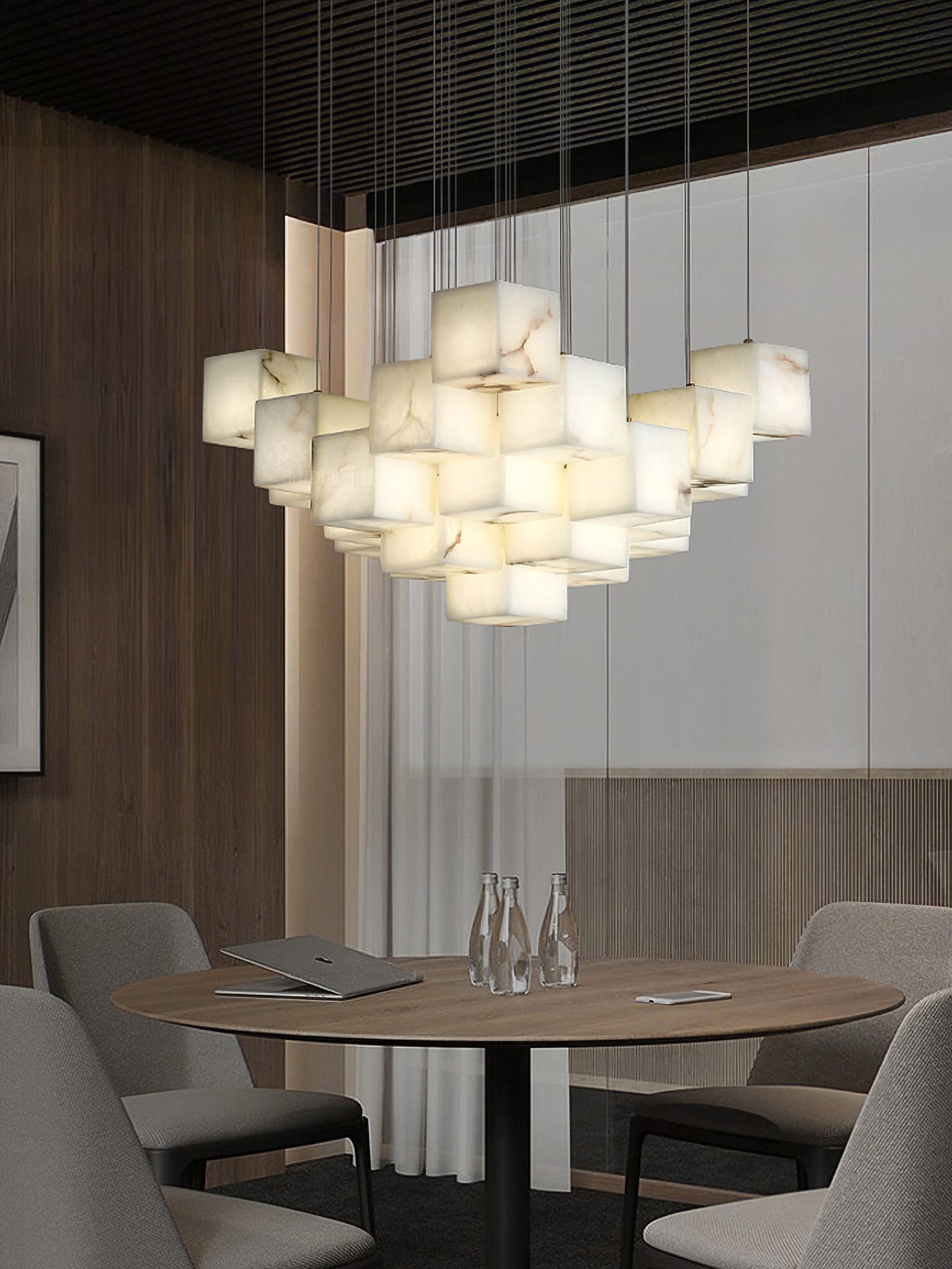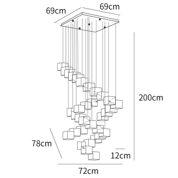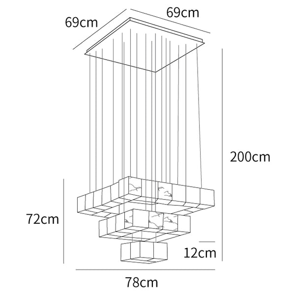 Tämän riippuvalaisimen varjostin on rakennettu yhdistämällä useita laatikoita, ja kunkin laatikon kokoon ja sijoitukseen on kiinnitetty erityistä huomiota. Tämä johtaa ainutlaatuiseen kolmiulotteisuuden ja tasojen tunteeseen. Monilaatikkorakenne antaa Alabaster Box -riippuvalaisimelle modernin ja taiteellisen ulkonäön ja tarjoaa samalla poikkeuksellisia valotehosteita.