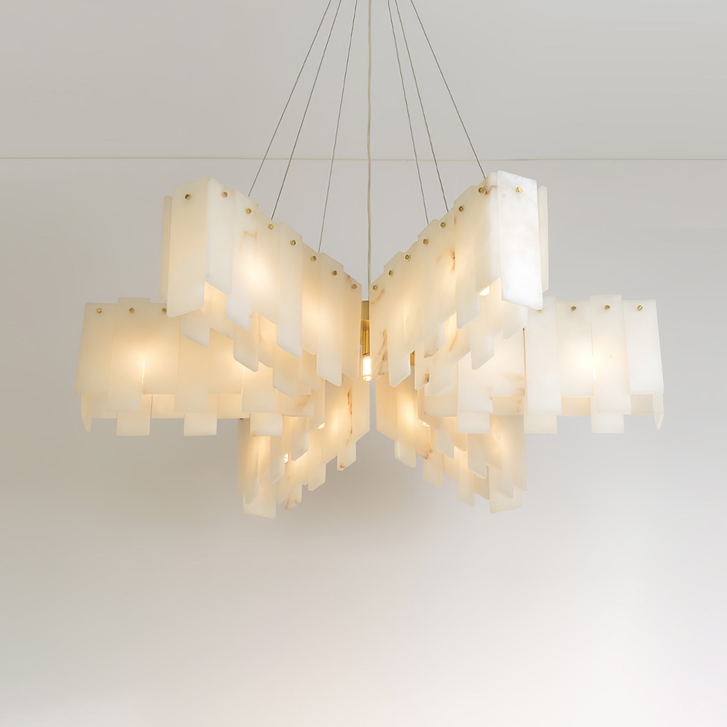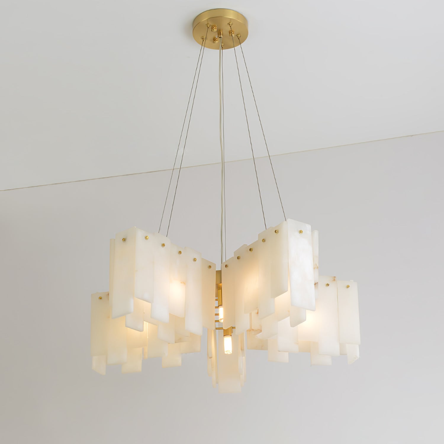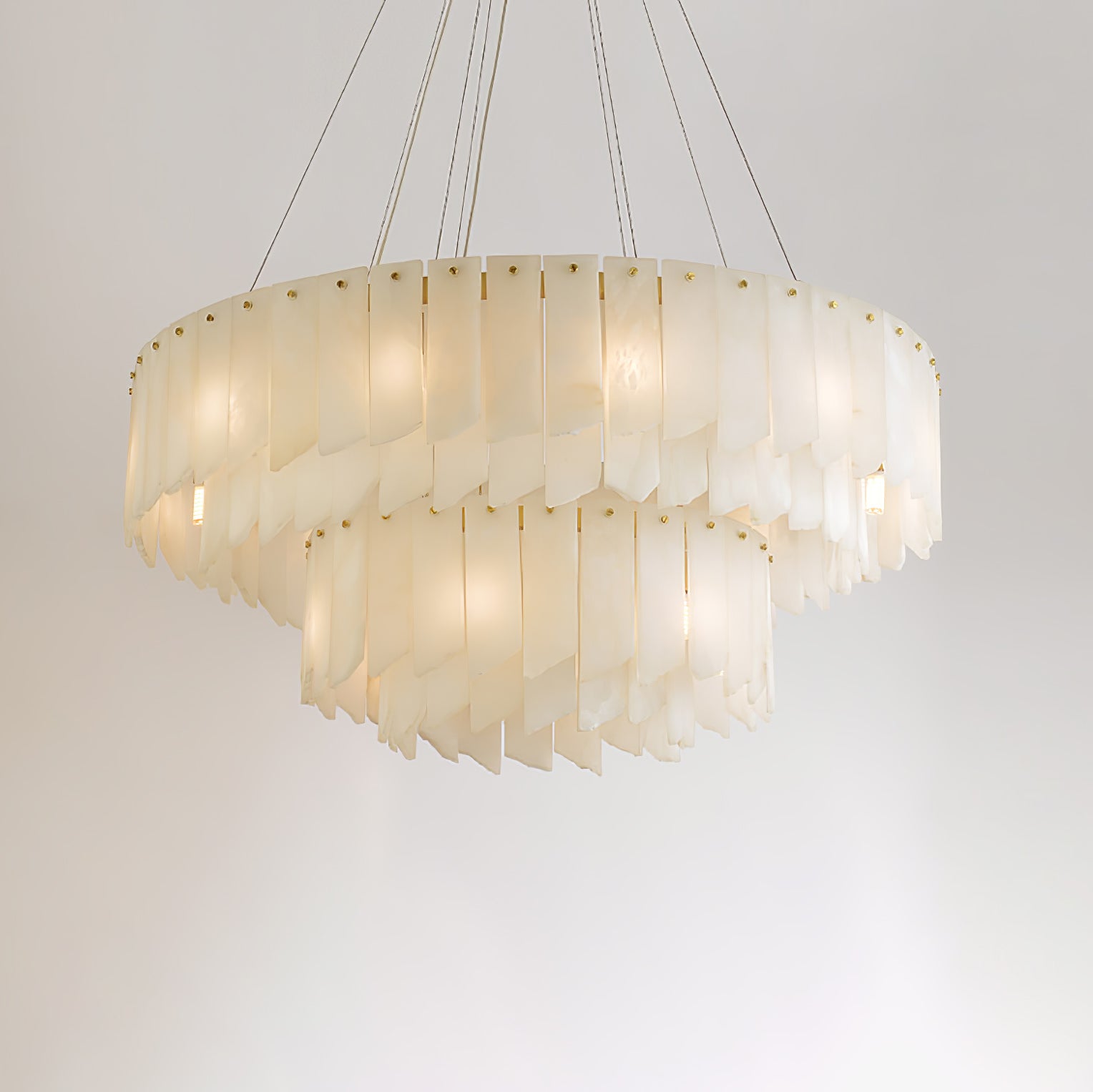 The Alabaster Cascade Tired Chandelier on upea näyttely käsityötaidosta ja ylellisestä suunnittelusta. Tämä kattokruunu on ripustettu kauniisti messinkiseen katokseen, ja siinä on kerroksia ylellisiä alabasteripaneeleja, jotka laskeutuvat porrastetusti luoden henkeäsalpaavan lämpimän valon kaskadin.