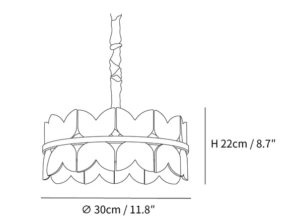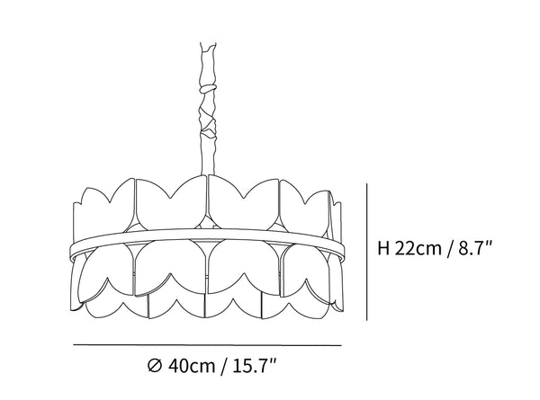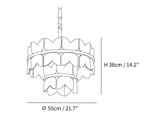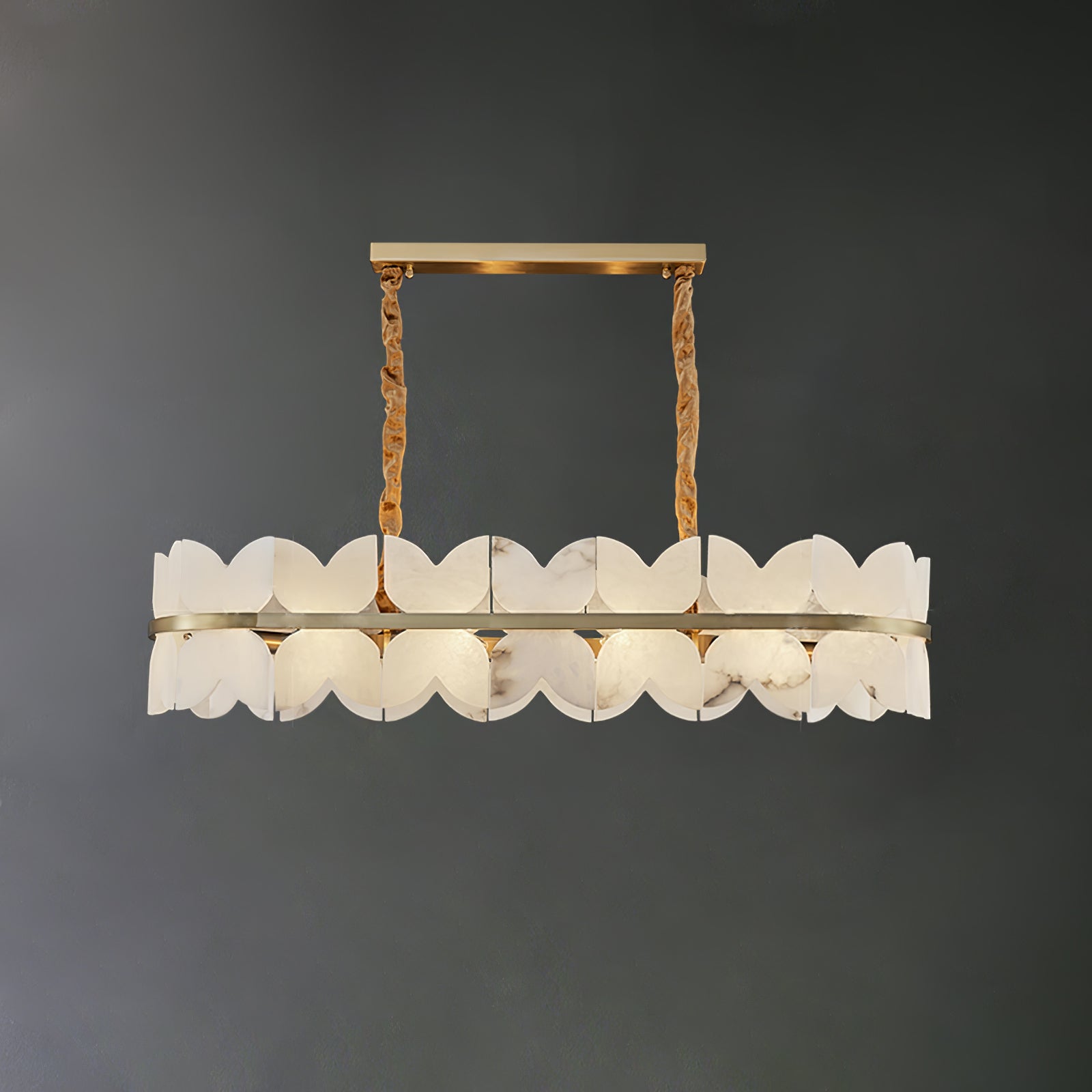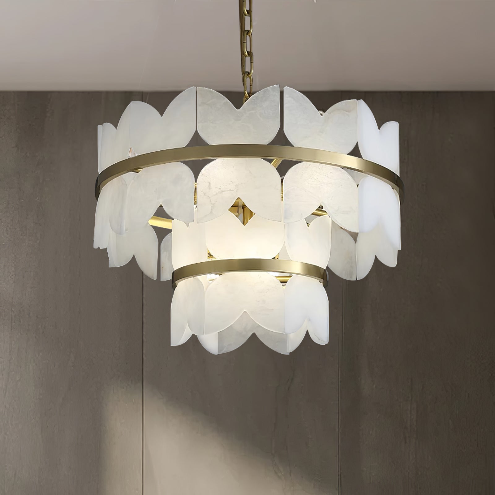 Jokainen alabasterikappale on asetettu asiantuntevasti pyöreän messinkikehyksen sisään, mikä lisää nykyaikaista kosketusta eteeriseen muotoiluun. Tuloksena on moderni mutta ajaton kattokruunu, joka kelluu kauniisti yläpuolella ja tarjoaa hienostuneen ilmeen ja ympäristön valaistuksen lähteen.