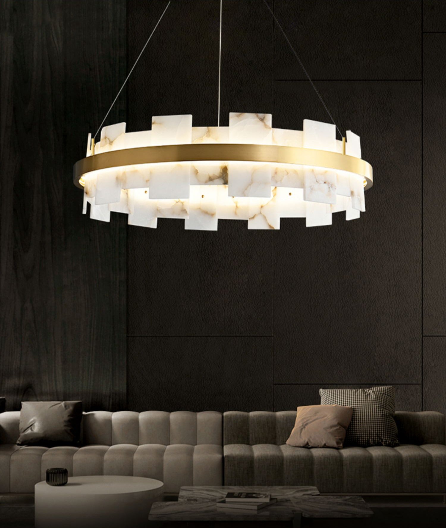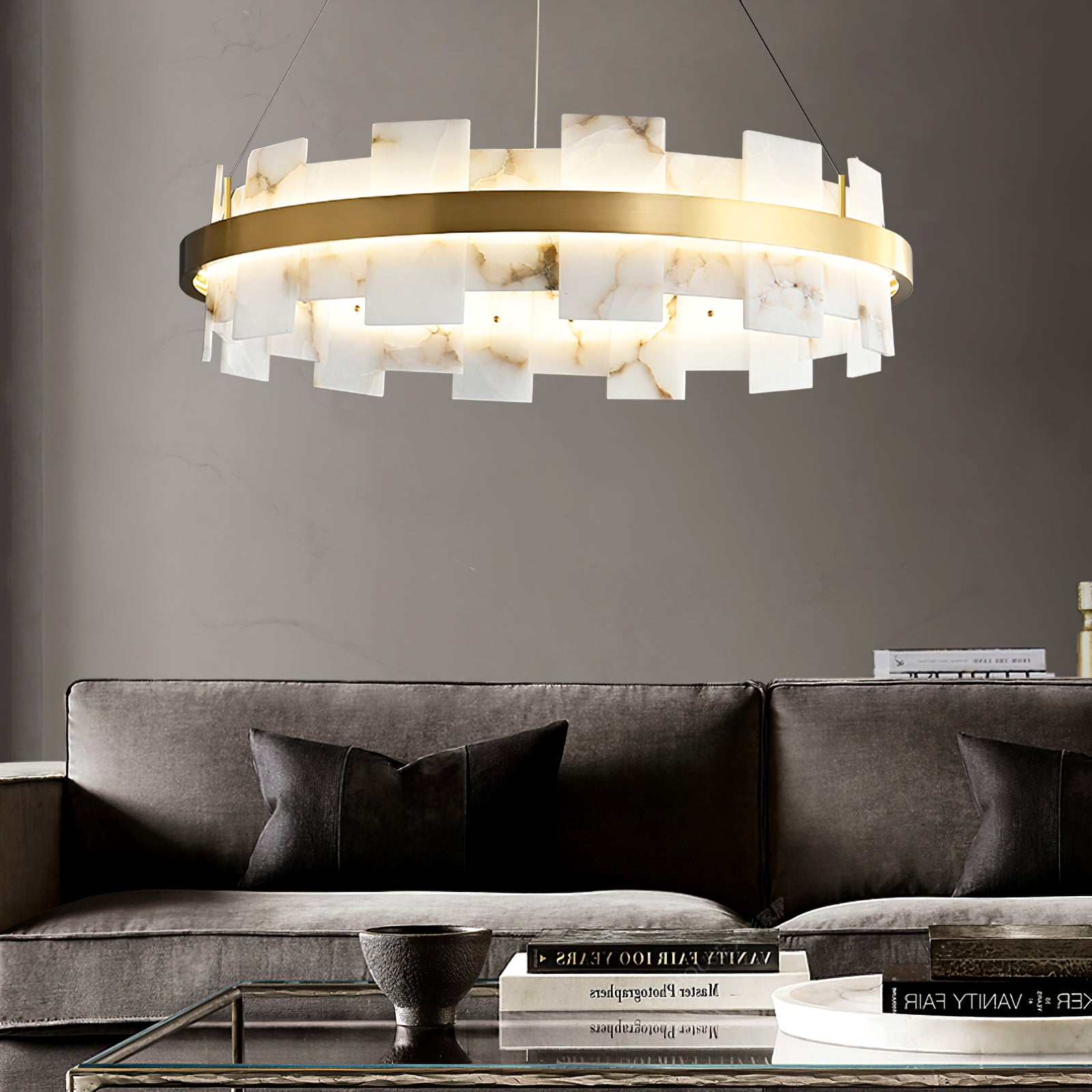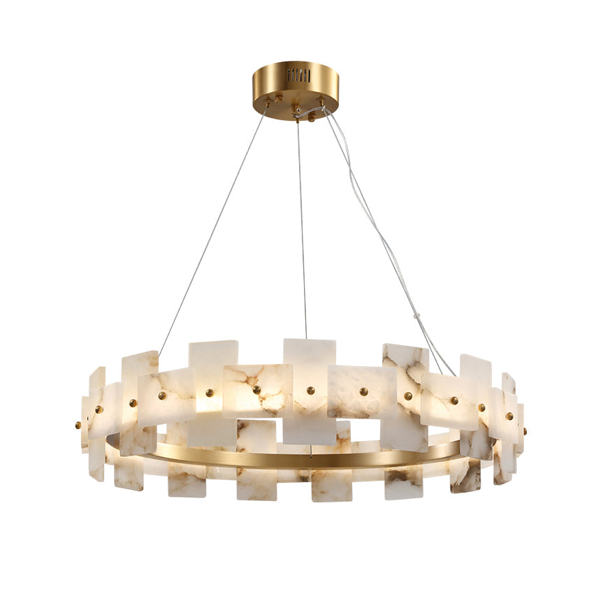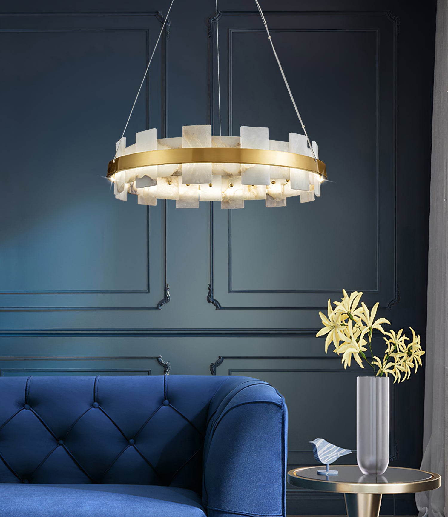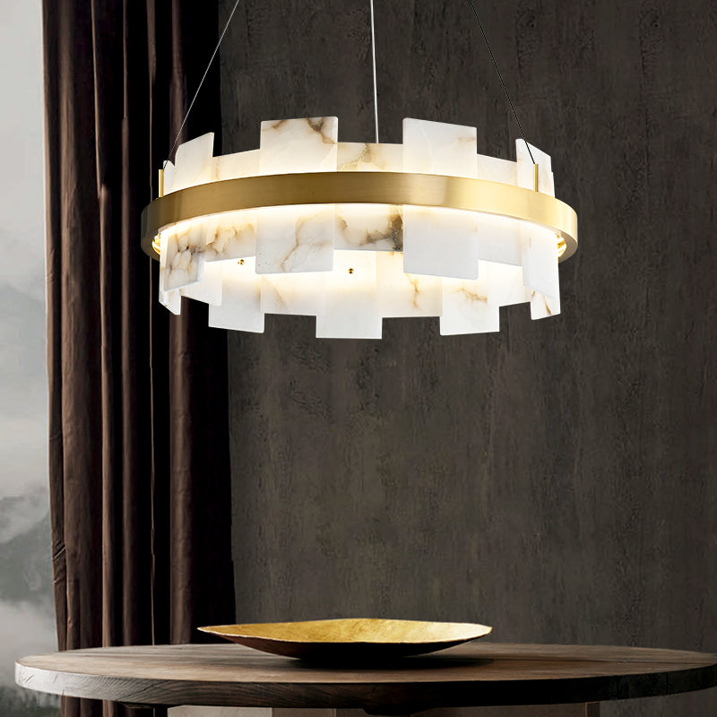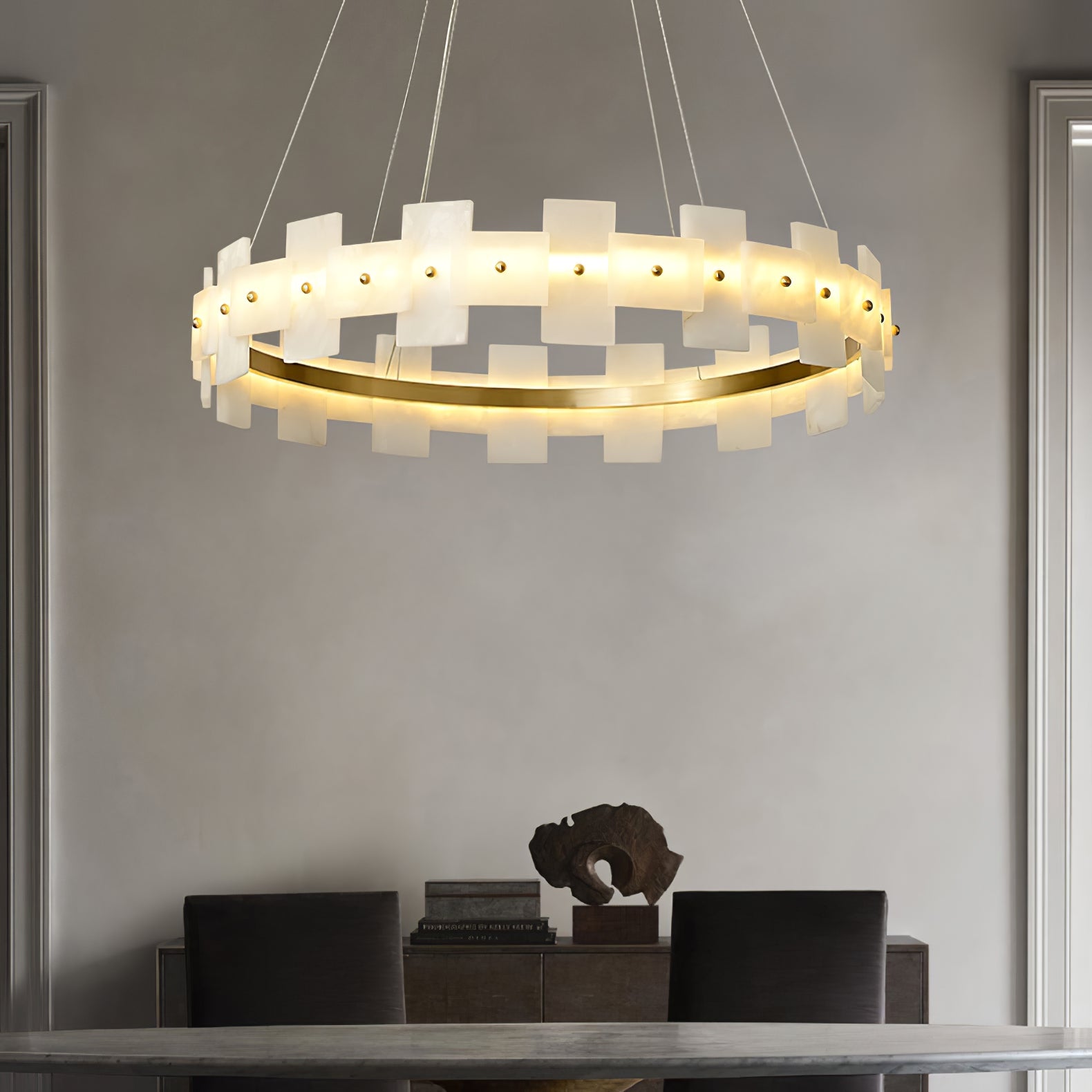 Esittele nykyaikainen sisustuselementti eteiseen tai ruokasaliin tällä ihastuttavalla Halo-kattokruunulla. Antiikkimessinkiviimeistelyssä alabasteripaneelit on asennettu pystysuoraan rengaskehykseen varjostamaan jokainen valo. Tämä kattokruunu yhdistää luonnollisia ja nykyaikaisia aiheita, ja se on täydellinen rentoon hienostuneisuuteen.