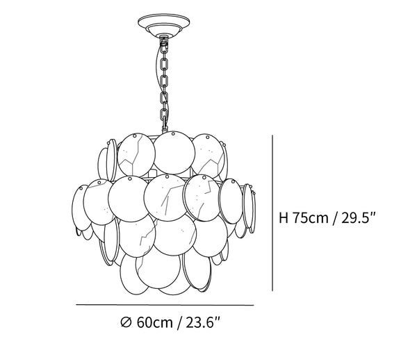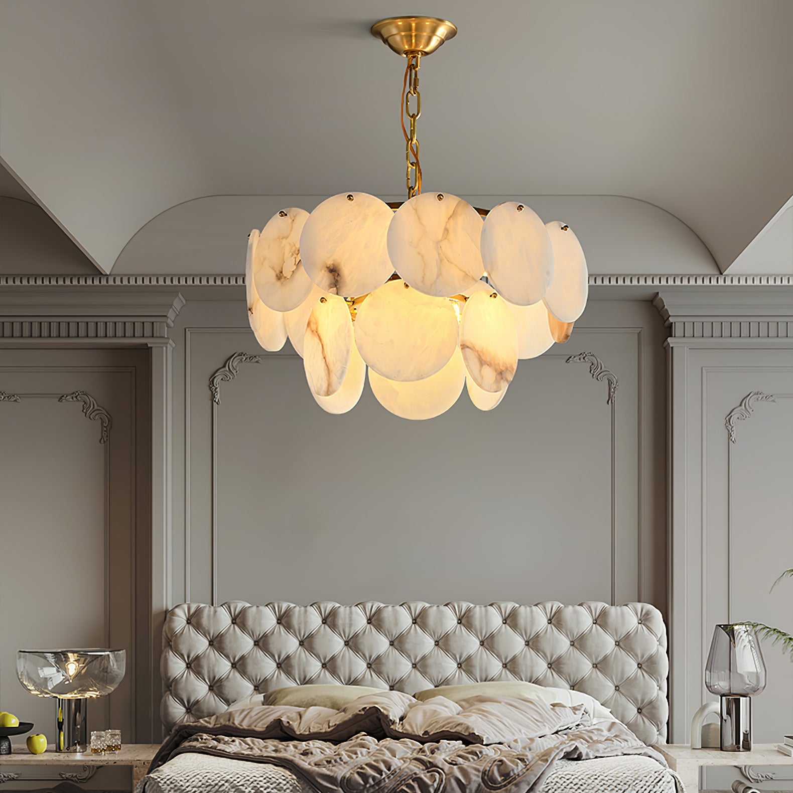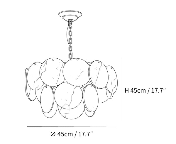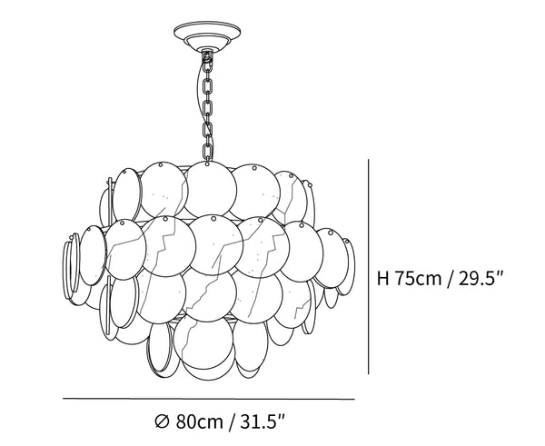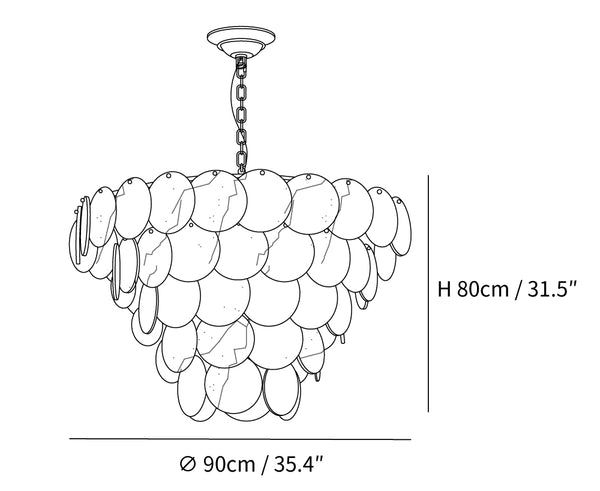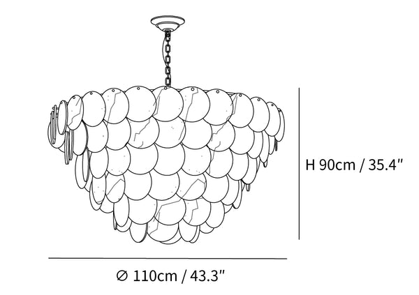 4 kerrosta Koko: Halkaisija 80cm x K 75cm / ∅ 31,5″ x K 29,5″ 5 kerrosta Koko: Halkaisija 90 cm x K 80 cm / ∅ 35,4″ x K 31,5″ 6 kerrosta Koko: Halkaisija 110cm x K 90cm / ∅ 43,3″ x K 35,4″ Tiedot Materiaali: alabasteri, messinki. Valonlähde: LED- tai Edison-lamppu. Valonlähteen perustyyppi: E14. Jännite: AC 110-240 V. Runkopinnat: messinki. Shade Finish: White. Asennus: kattoon. Kosteudenkestävyys: IP 20 Kosteusluokitus käytettäväksi kylpyhuoneissa, keittiöissä ja katetuissa ulkotiloissa. Ympäristö: Sisätiloissa Johdot: kiinteä. Ohjaus: Yhteensopiva tavallisen seinäkytkimen kanssa (ei mukana). Kytkin: Tämä kytkin pitää kytkeä ulkoiseen seinävalokytkimeen, mahdollistaa hallitun sähkönsyötön. 11,8″ Säädettävä riippukorkeus ketju, jota voidaan pidentää tarpeen mukaan. Certification: UL, ETL ja CE, SAA listattu.