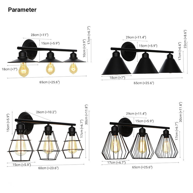 - Teolliseen tyyliin perustuva Alessio Black Vanity -seinävalaisin on yksinkertainen mutta hienostunut muotoilu. Siinä on suora ja siinä on kolme valoa, jotka sopivat täydellisesti moderniin tai vintage-tyyliin.