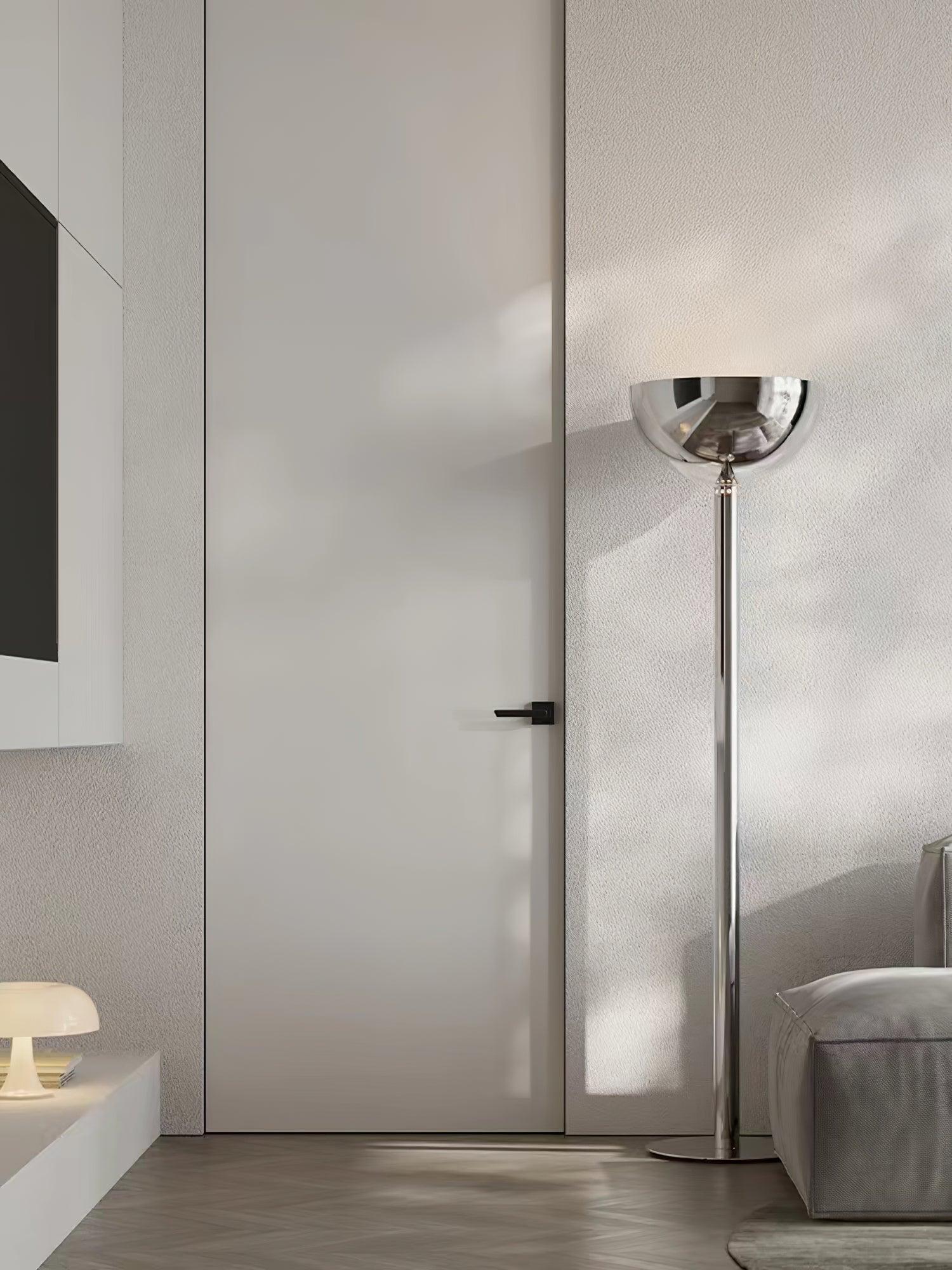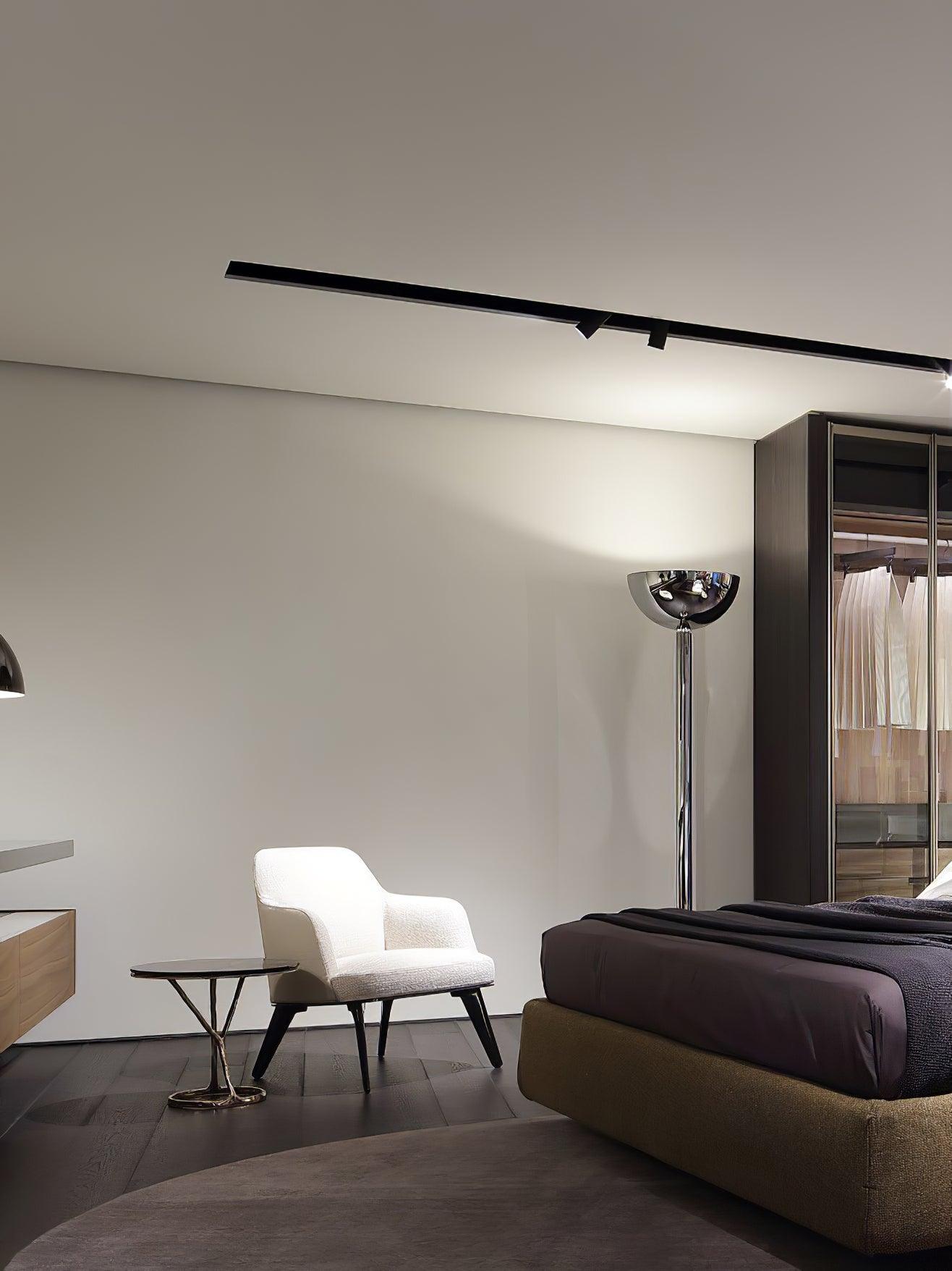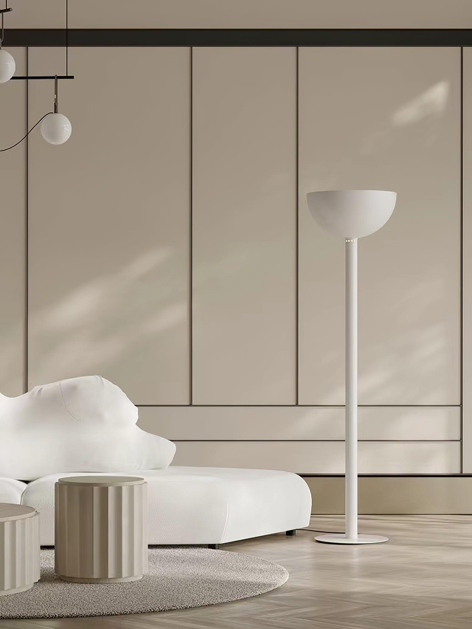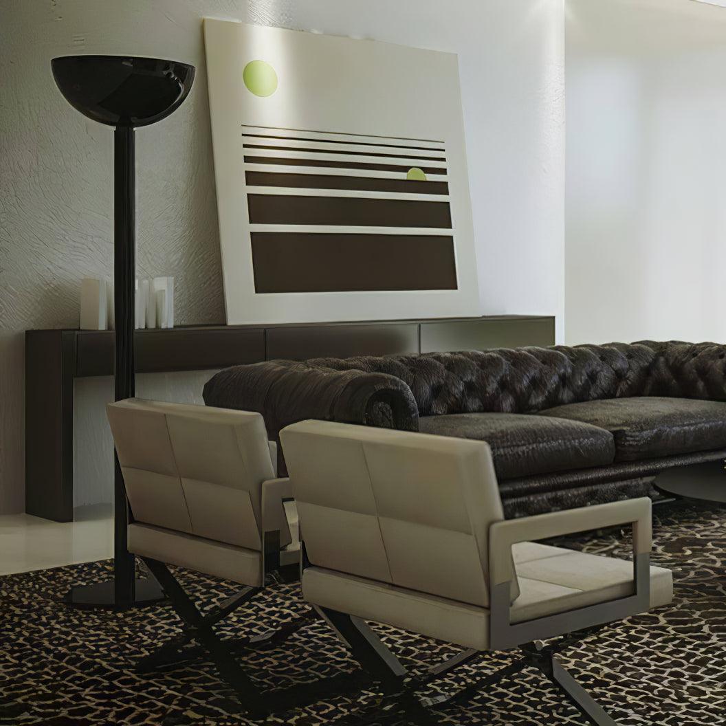 Lattiavalaisin kromatulla rakenteella. Hajotin kromattua, mustaa tai valkoista metallia. Lineaariset tai kaarevat valotangot kromatusta tai mustakromatusta teräksestä ja puoliympyrän muotoiset varjostimet opaalinvalkoisesta lasista. Ylävalon tulvakeilojen jakautuminen.