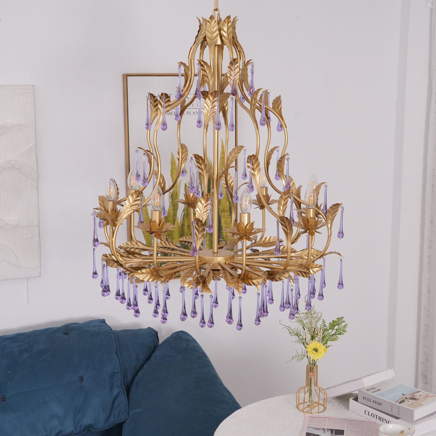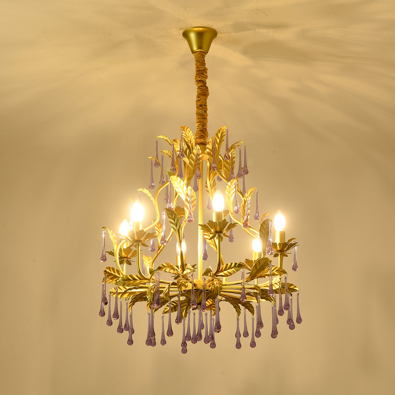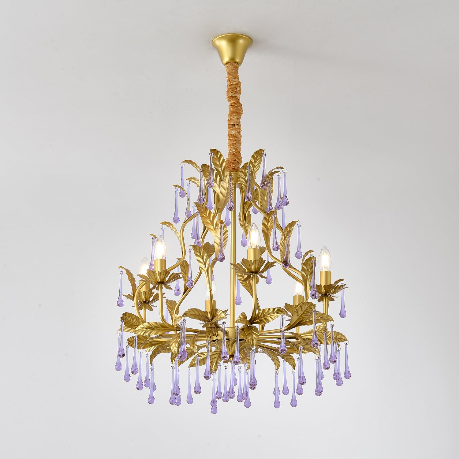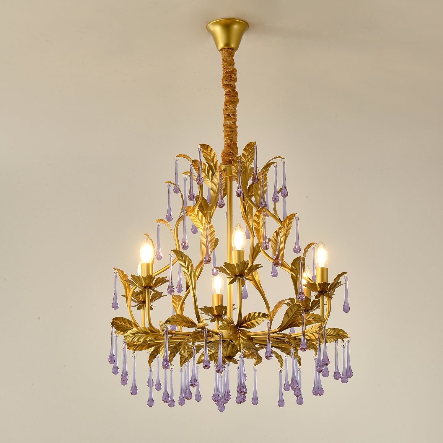 Tässä upeassa kattokruunussa on ainutlaatuinen muotoilu, ja siinä yhdistyvät säteilevät violetit kiteet kullanvärisiin lehtiin. Purppuraiset kristalliriipukset hohtavat loistavasti ja huokuvat eleganssia ja hienostuneisuutta, jota täydentävät monimutkaisen yksityiskohtaiset kultaiset lehdet. Luonnosta inspiraation saaneet kultaiset lehdet lisäävät ripauksen ylellisyyttä koko esineeseen. Yleinen muotoilu ei vain huokuu ylellisyyttä, vaan myös integroituu saumattomasti moderniin kodin sisustukseen ja toimii erottuvana ominaisuutena missä tahansa tilassa.