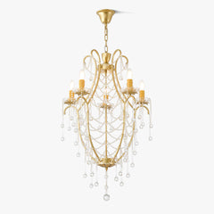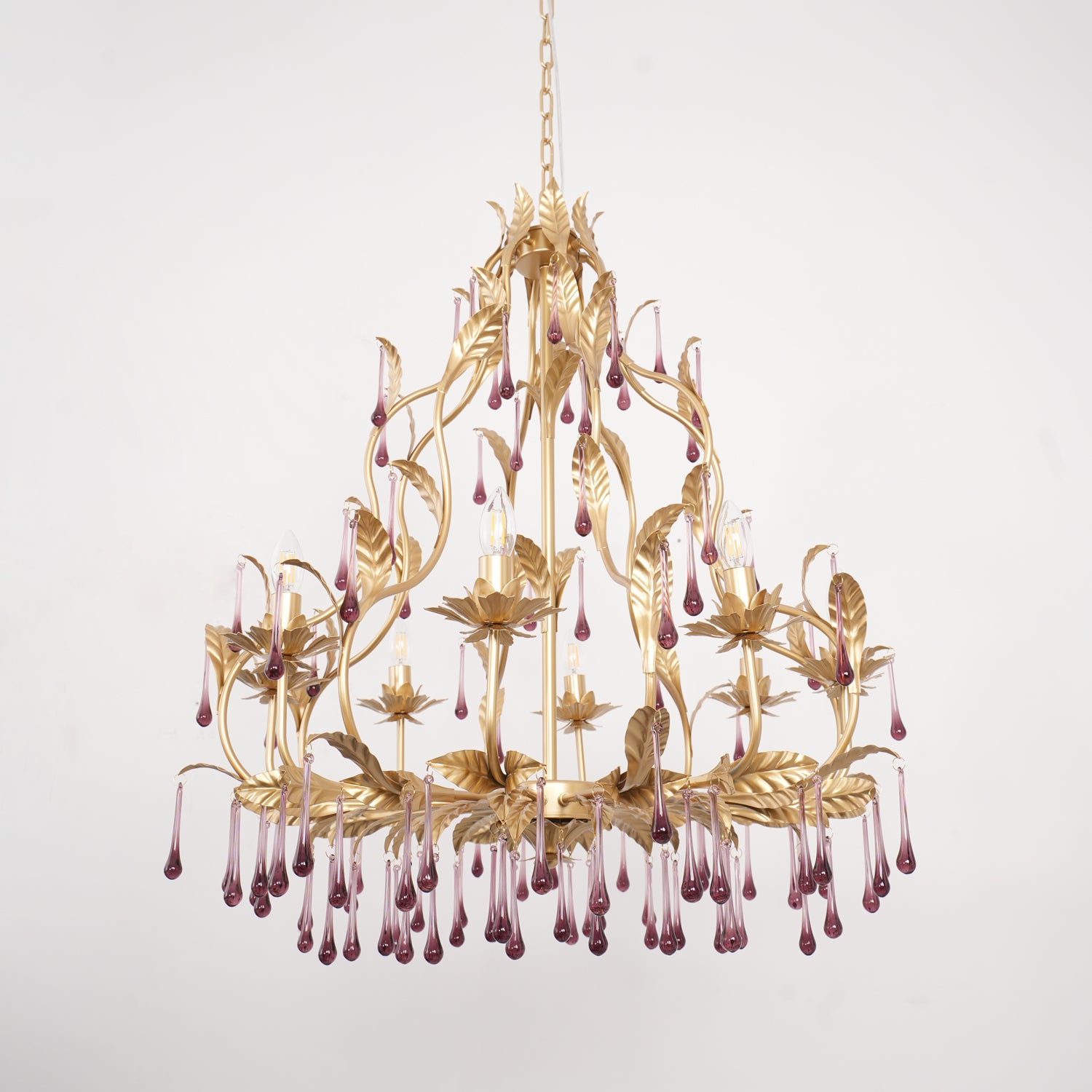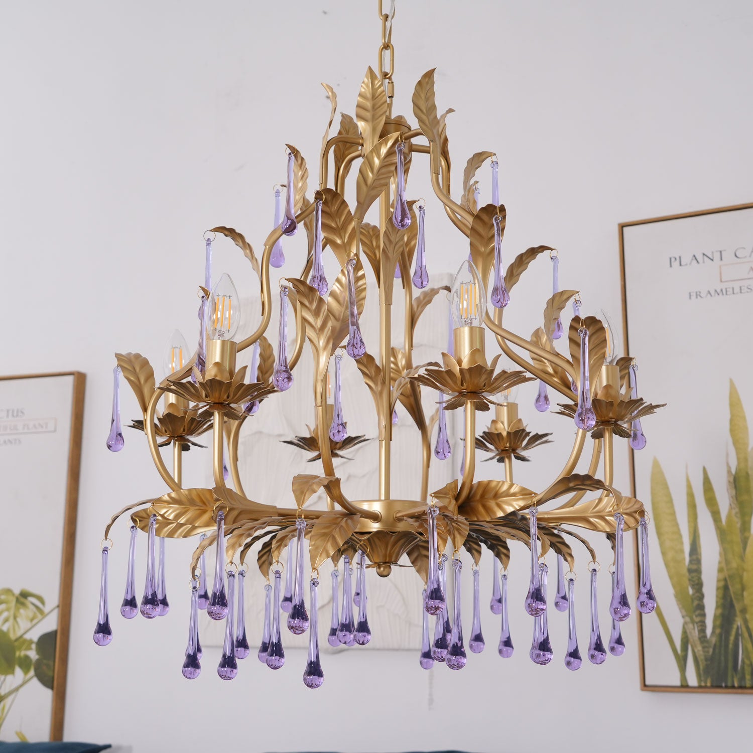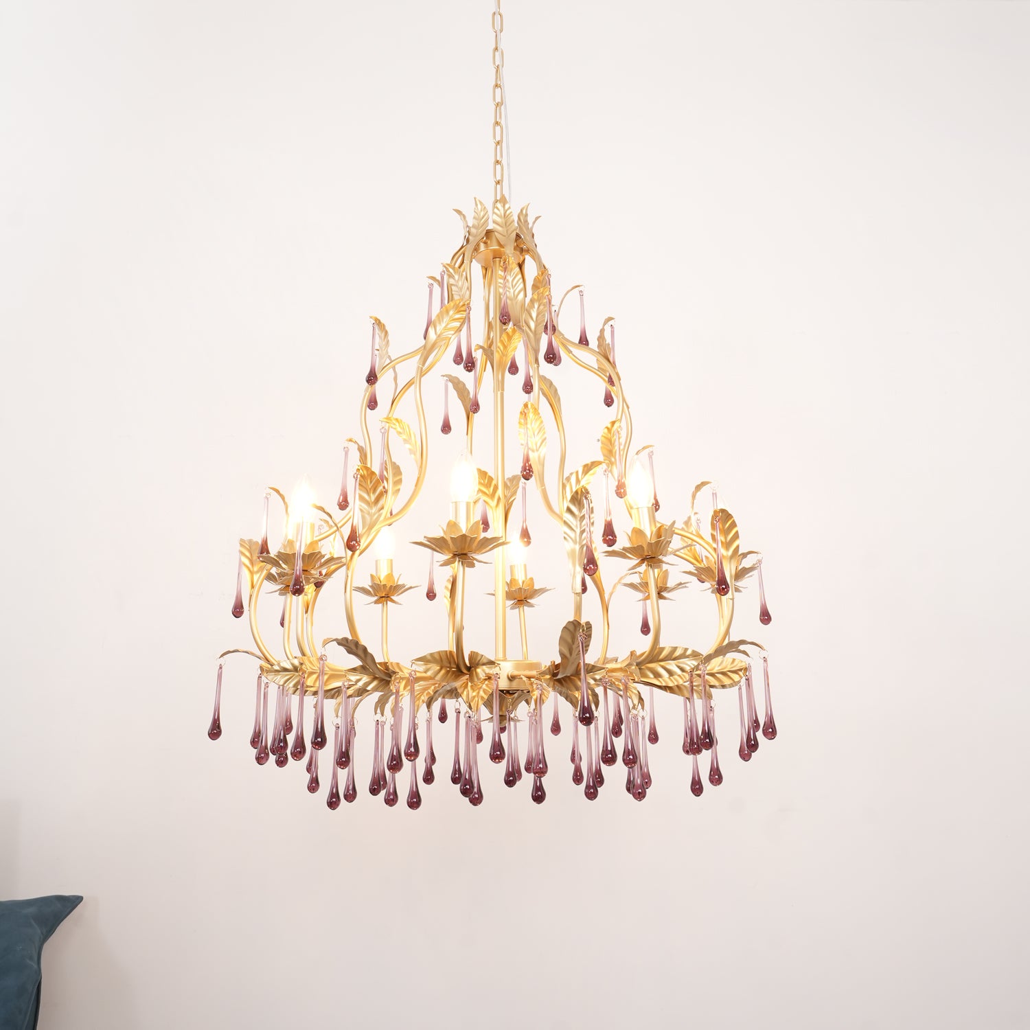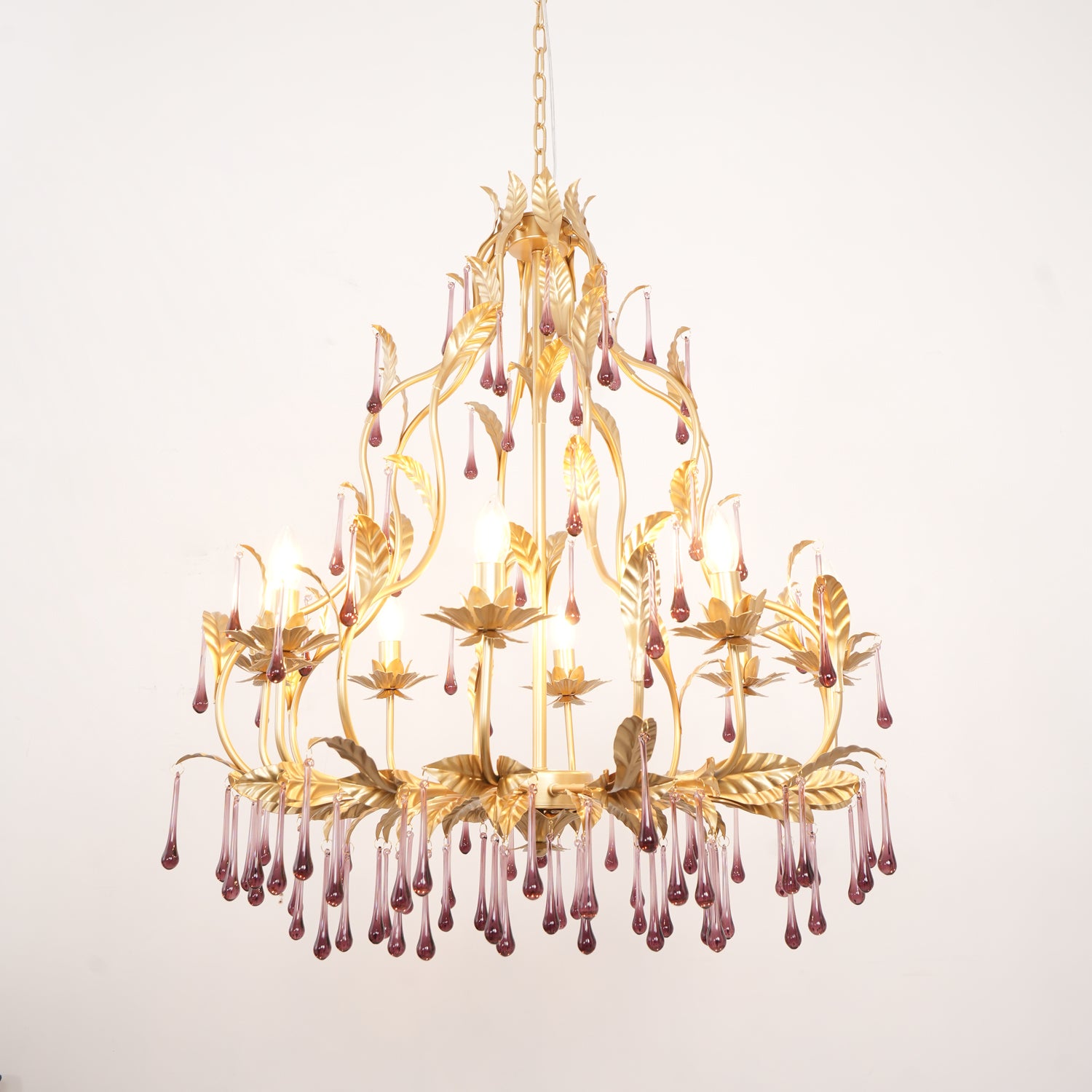 Tässä upeassa kattokruunussa on ainutlaatuinen muotoilu, ja siinä yhdistyvät säteilevät violetit kiteet kullanvärisiin lehtiin. Purppuraiset kristalliriipukset hohtavat loistavasti ja huokuvat eleganssia ja hienostuneisuutta, jota täydentävät monimutkaisen yksityiskohtaiset kultaiset lehdet. Luonnosta inspiraation saaneet kultaiset lehdet lisäävät ripauksen ylellisyyttä koko esineeseen. Yleinen muotoilu ei vain huokuu ylellisyyttä, vaan myös integroituu saumattomasti moderniin kodin sisustukseen ja toimii erottuvana ominaisuutena missä tahansa tilassa.