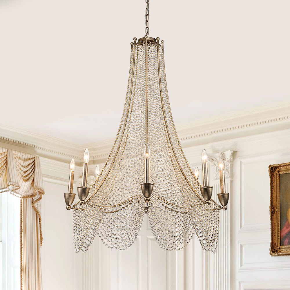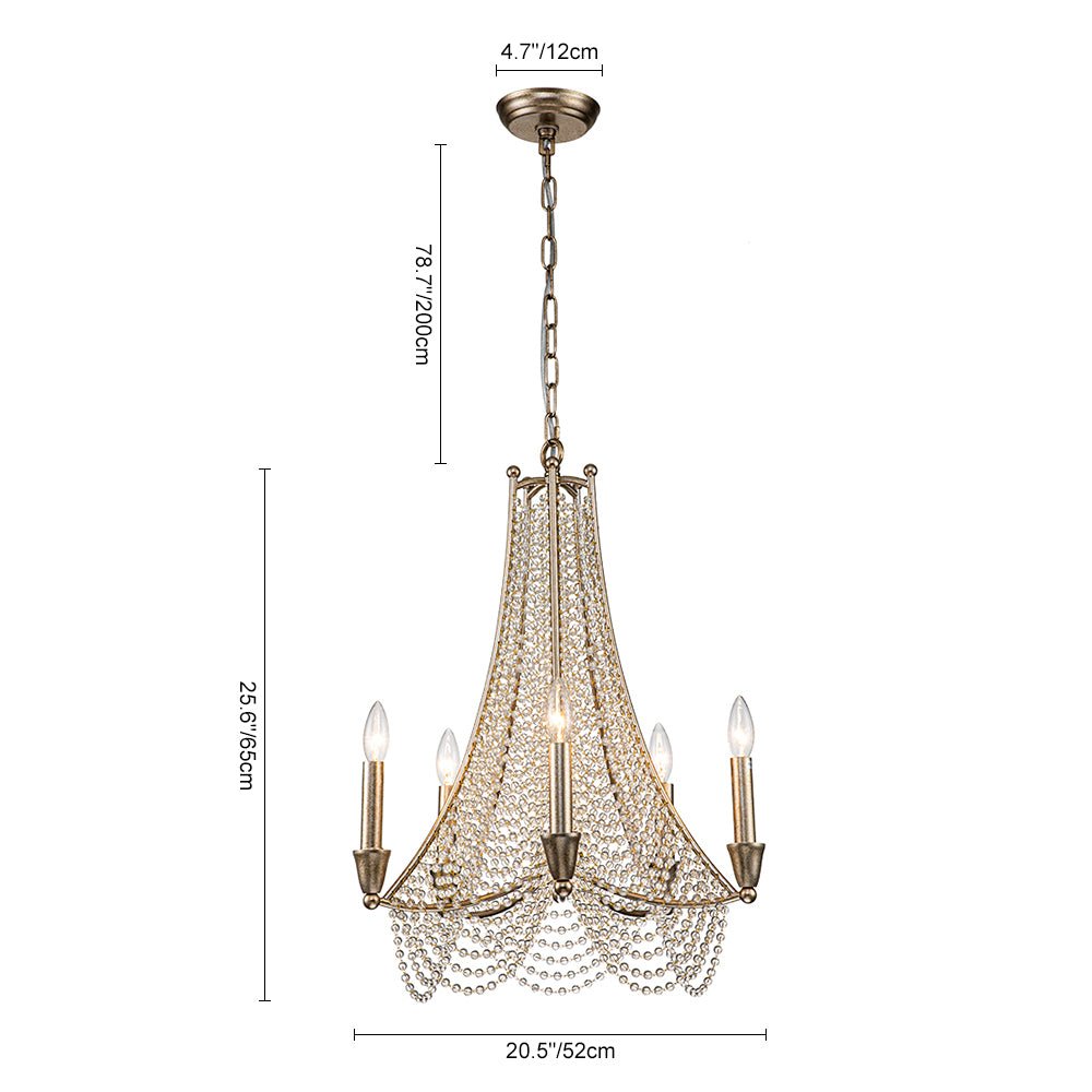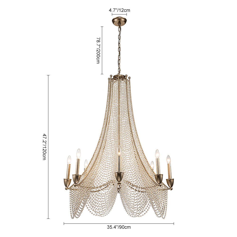Tässä kristallikruunussa on kristallihelmillä koristeltu verho, joka verhoutuu tyylikkäästi antiikkiviimeistelyn empirekehyksen päälle, mikä herättää romantiikkaa ja loistoa. E12 kynttelikköpolttimoilla (ei sisälly) varustettuja viisi tai kahdeksan kynttelikkömäistä kantaa täydentävät tämän kristallihelmi-impeerien kattokruunun tyylikästä perinteistä ilmettä. Kun kirkkaat kristallihelmet valaistaan, ne kimaltelevat ja korostavat minkä tahansa huoneen tyyliä. Tämä kynttilätyylinen empire-kattokruunu on täydellinen glamouria lisäämään olohuoneeseen, eteiseen, ruokasaliin, makuuhuoneeseen tai eteiseen.Tiedot