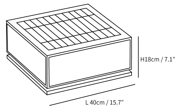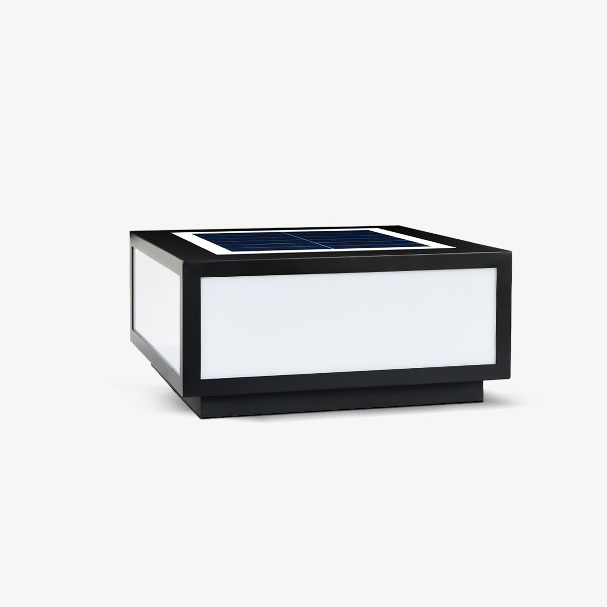 Aurinkovoimalla toimiva versio Koko: P 40 cm x L 40 cm x K 18 cm / P 15,7″ x L 15,7 x K 7,1″ Tiedot Materiaalit: ruostumaton teräs, akryyli. Valonlähde: Integroitu LED (LED-valot on rakennettu valaisimeen, eikä niitä voi vaihtaa). Kelvin-alue: lämmin valo (3000K), neutraali valo (4000K), viileä valo (6000K). Jännite: AC 110–240 V (langallinen versio) / DC 3,2 V (aurinkovoimalla toimiva versio). Kosteudenkestävyys: IP 65 kosteudenkestävä luokka, vedenpitävä, ei saa upottaa veteen. Ympäristö: Ulkona. Käyttöpaikat: nurmikot, huvilat, käytävät, käytävät, puutarhat, puistot jne. Viimeistelyt: mustavalkoinen. Ohjaus: Yhteensopiva yleisten painokytkimien kanssa (ei sisälly). Certification: UL, ETL ja CE, SAA luettelossa.
