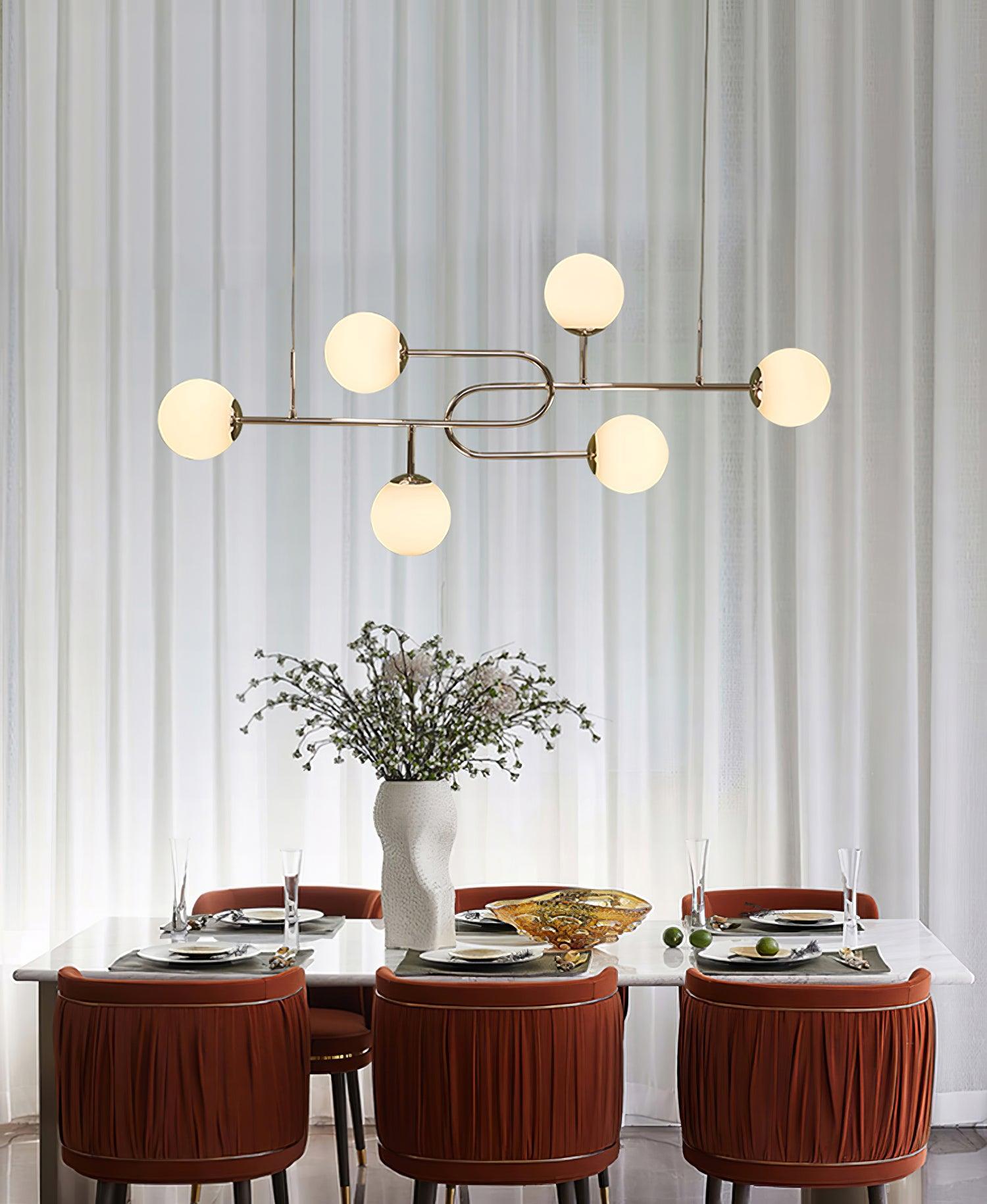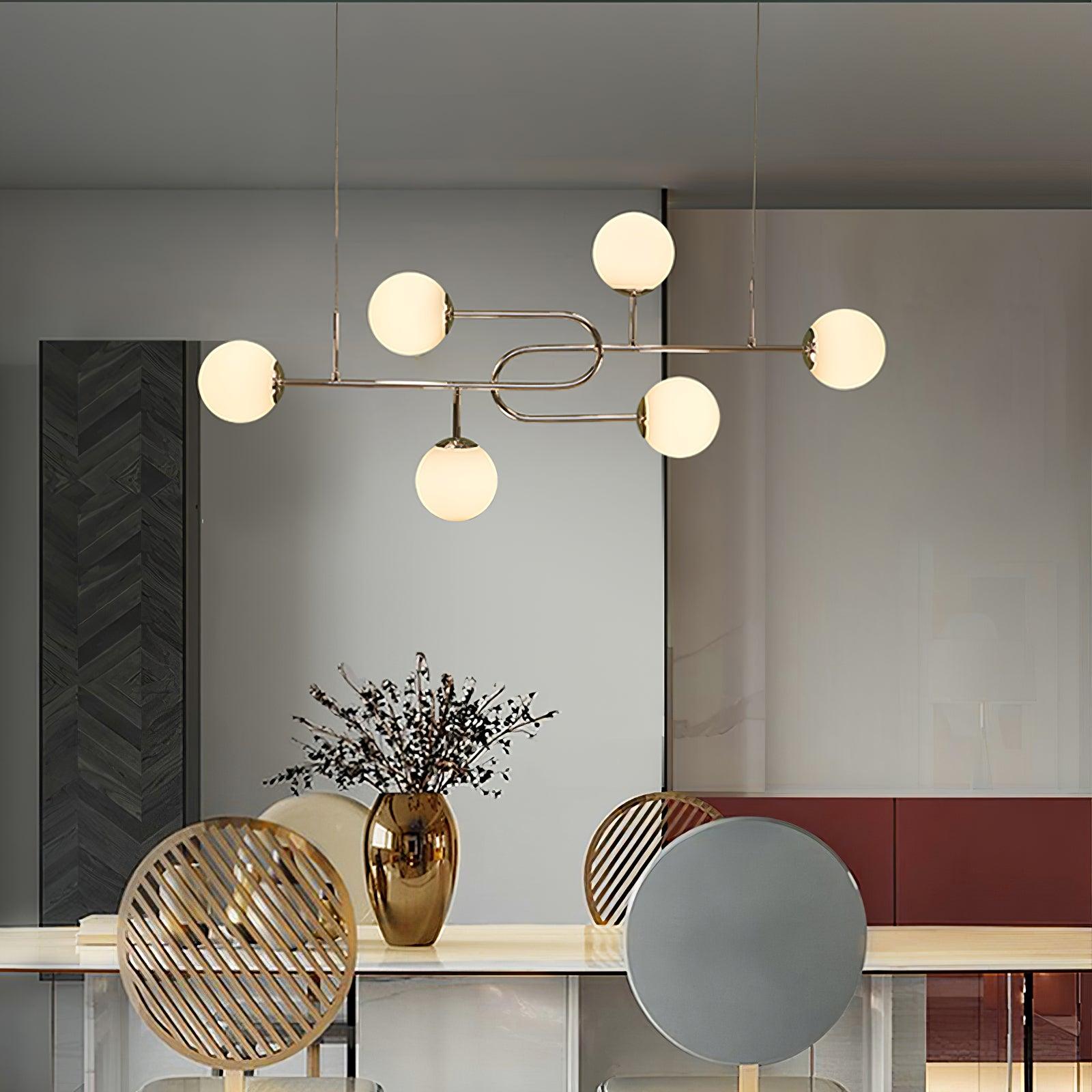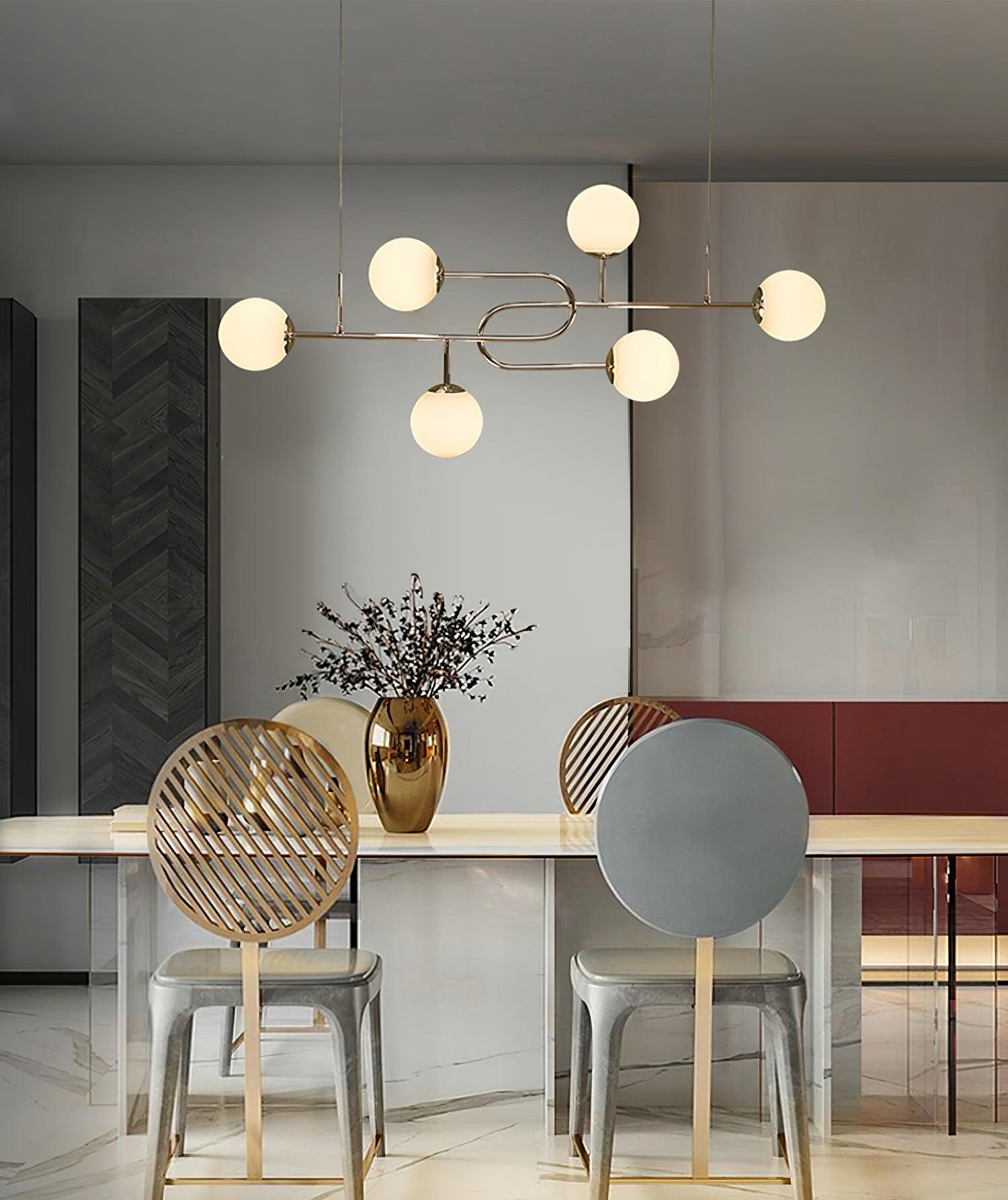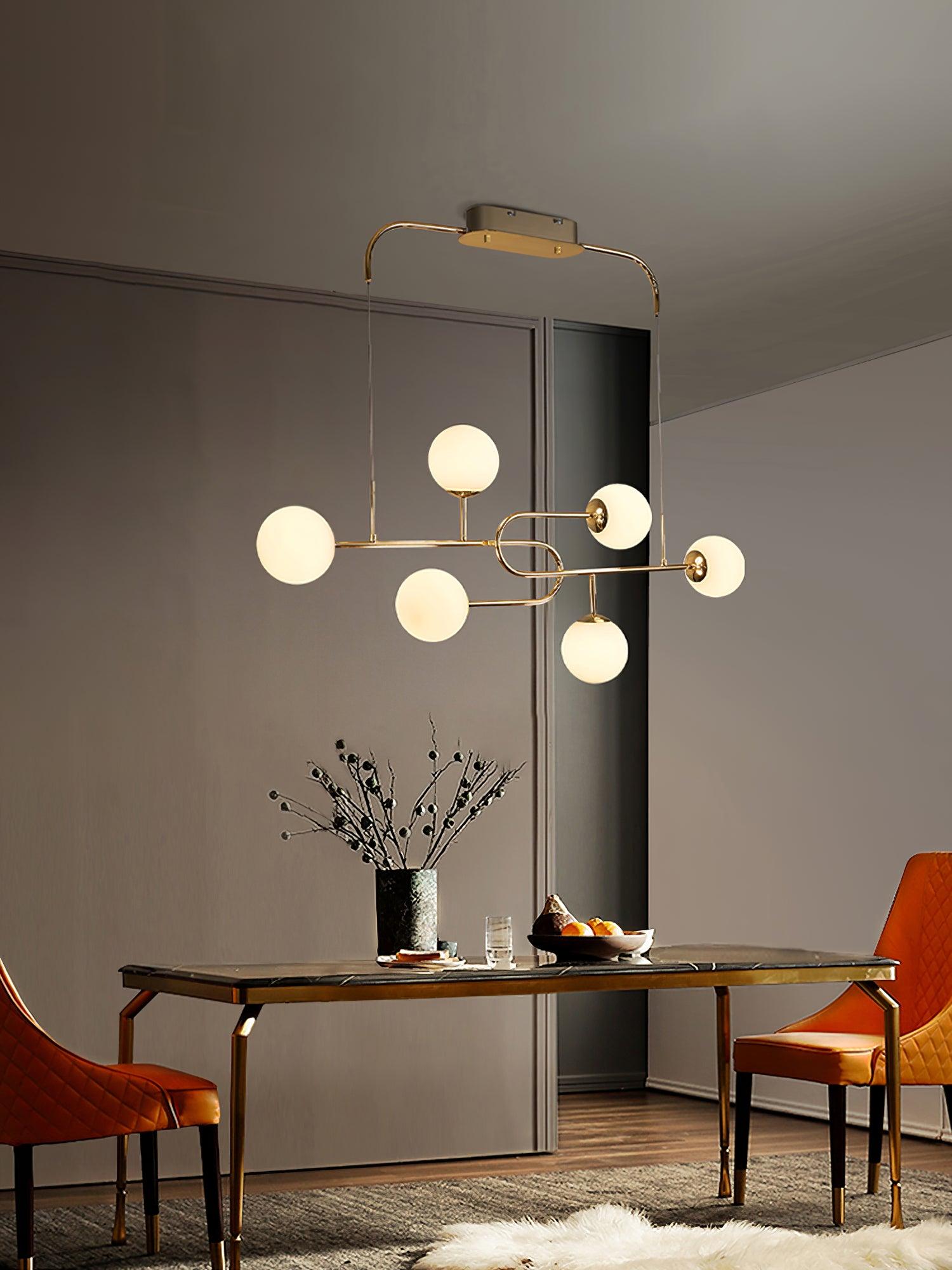 Arc Globe Escalante -kattokruunun vahvat kultaviivat taipuvat sisään ja ulos avaruudesta liikkuen vaivattomasti yksinkertaisuuden ja koristeellisuuden välillä. Pyöreät ja kuutioiset rautaliittimet täydentävät valaisimien rakenteita ja lisäävät runsasta materiaalikontrastia lampun runkoon. Kokoelman teollinen ja graafinen estetiikka on täynnä vaikutteita perinteisistä kiinalaisista näytöistä Memphis-liikkeeseen.