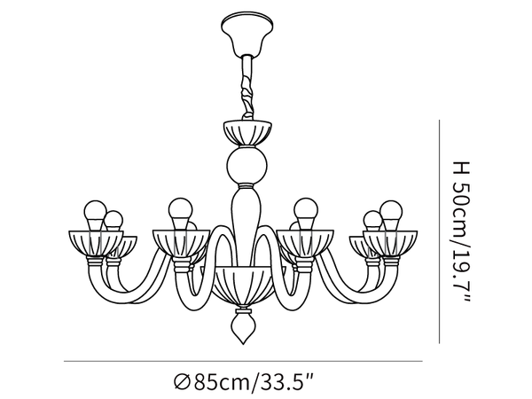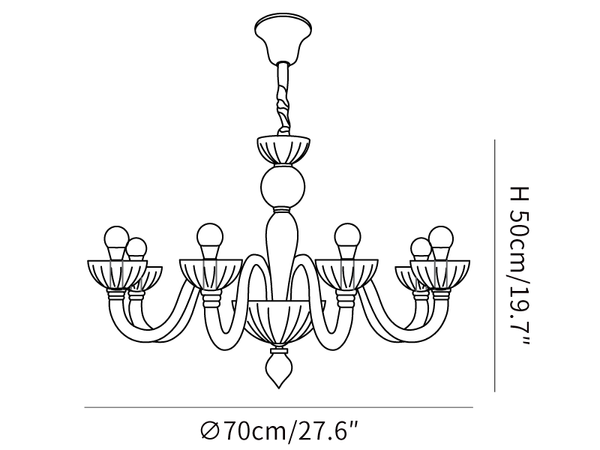 Asiantuntevasti valmistettu Muranon lasin muinaisella tekniikalla, Ares Murano Glass -kattokruunu on todellinen mestariteos. Lasinvalmistajien käsintehty kappale on koristeltu tyylikkäillä käsintehdyillä yksityiskohdilla, mikä tekee siitä upean lisäyksen mihin tahansa huoneeseen. Korosta tilaasi tällä ainutlaatuisella ja ajattomalla kattokruunulla.