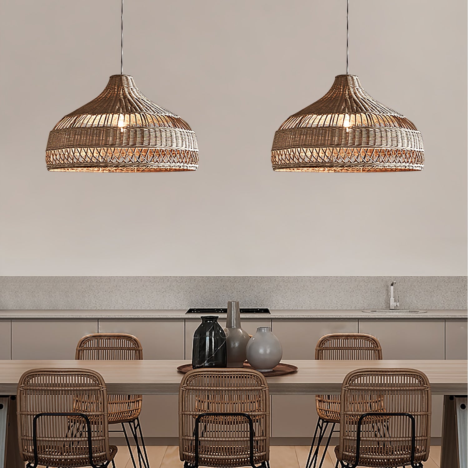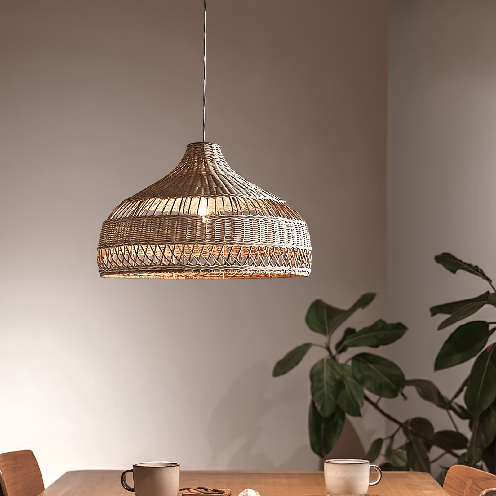 Artisanal Rattan Dome Pendant on kauniisti käsintehty valaisin, joka tuo ripauksen perinteistä käsityötä nykyaikaiseen kotiin. Tässä riippuvalaisimessa on kupolin muotoinen muotoilu, joka on kudottu hienosti luonnollisesta rottinkista, mikä luo kappaleen, jossa on yhtä paljon estetiikkaa kuin valaistusta. Yksityiskohtaiset kuviot ja kudokset eivät ainoastaan mahdollista upeaa valon ja varjon leikkiä, vaan myös esittelevät sen luomisen takana olevaa taitavaa taiteellisuutta. Ihanteellinen tiloihin, joissa pyritään luomaan luonnollinen, maanläheinen tunnelma, tämä riippuvalaisin luo lämpimän, kutsuvan hehkun, joka on täydellinen luomaan kodikkaan tunnelman ruokailutiloihin, olohuoneisiin tai eteisiin. Sen orgaaninen rakenne ja muoto tekevät siitä keskipisteen missä tahansa huoneessa, tarjoten sekä toimivuutta että kiistatonta charmia.