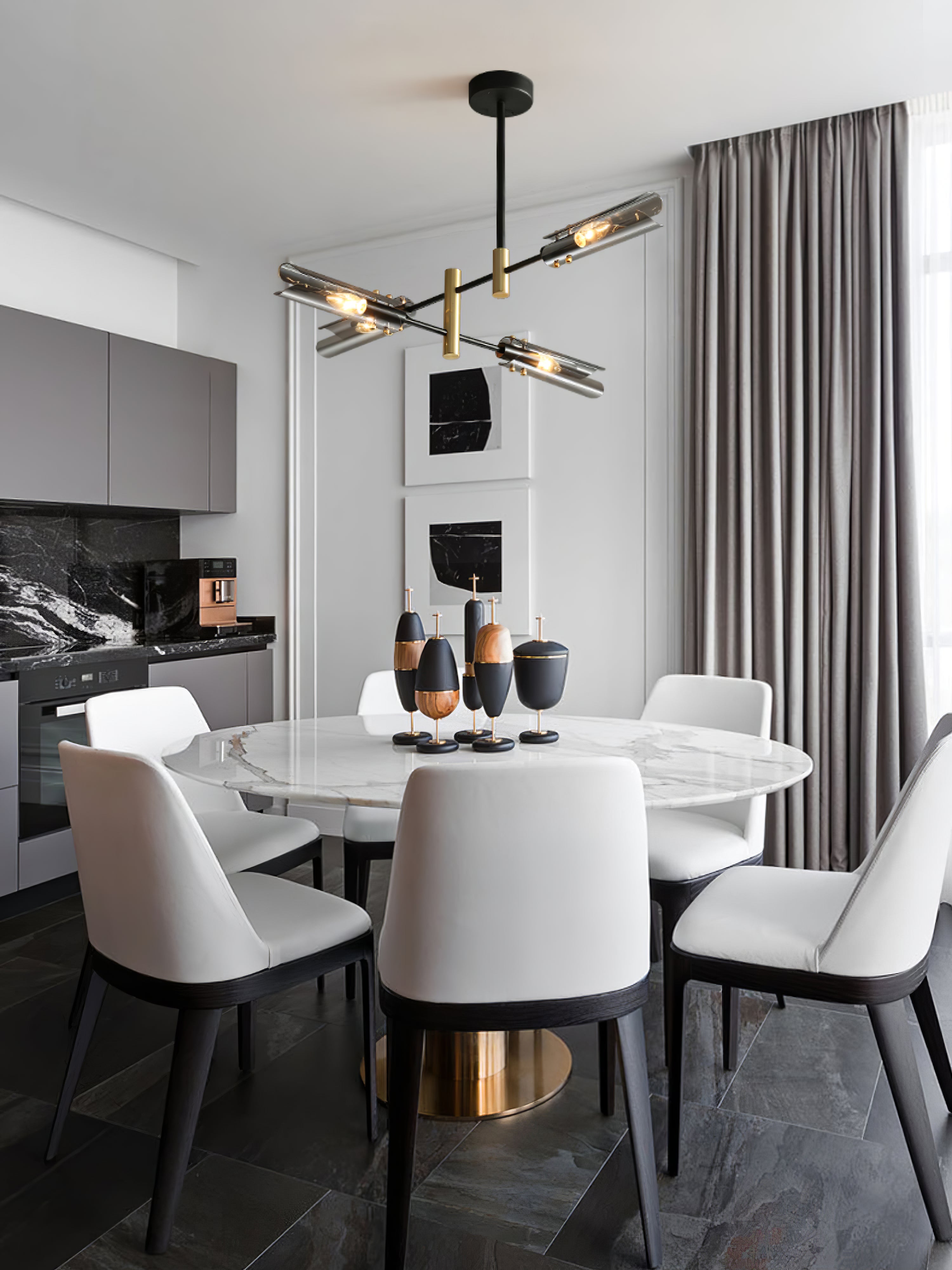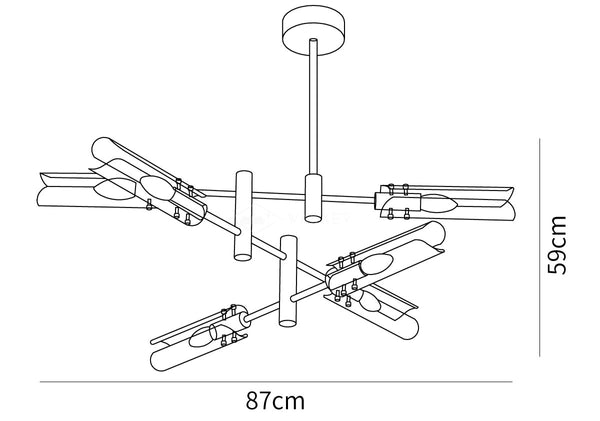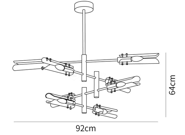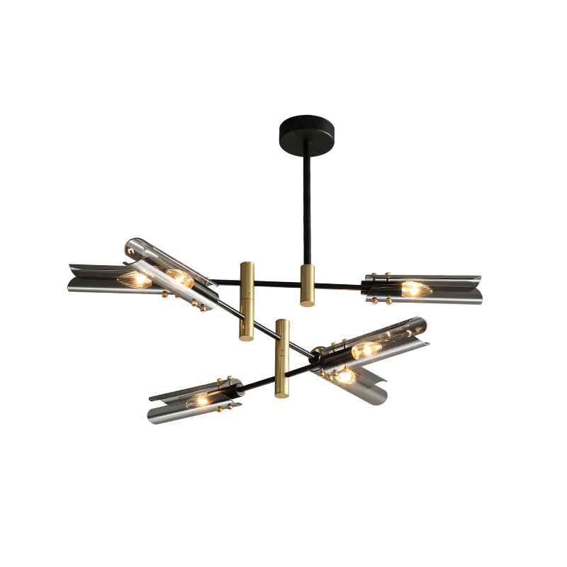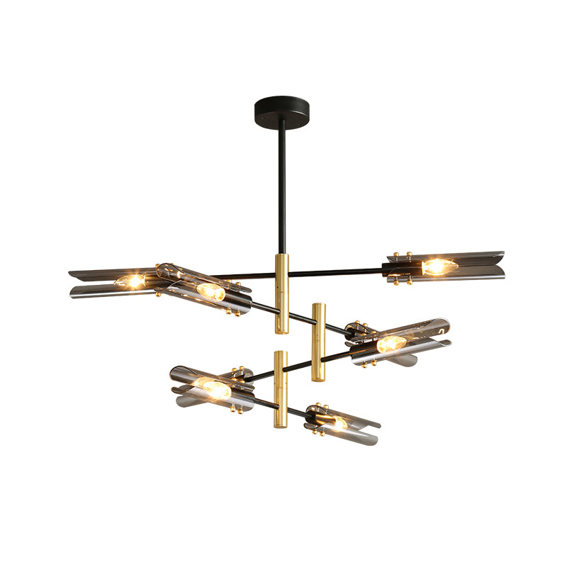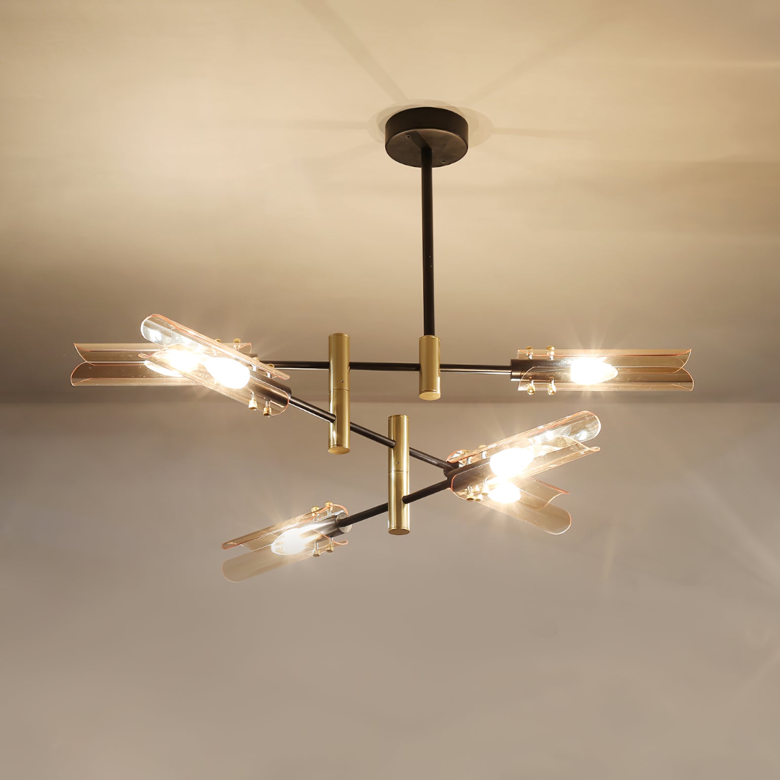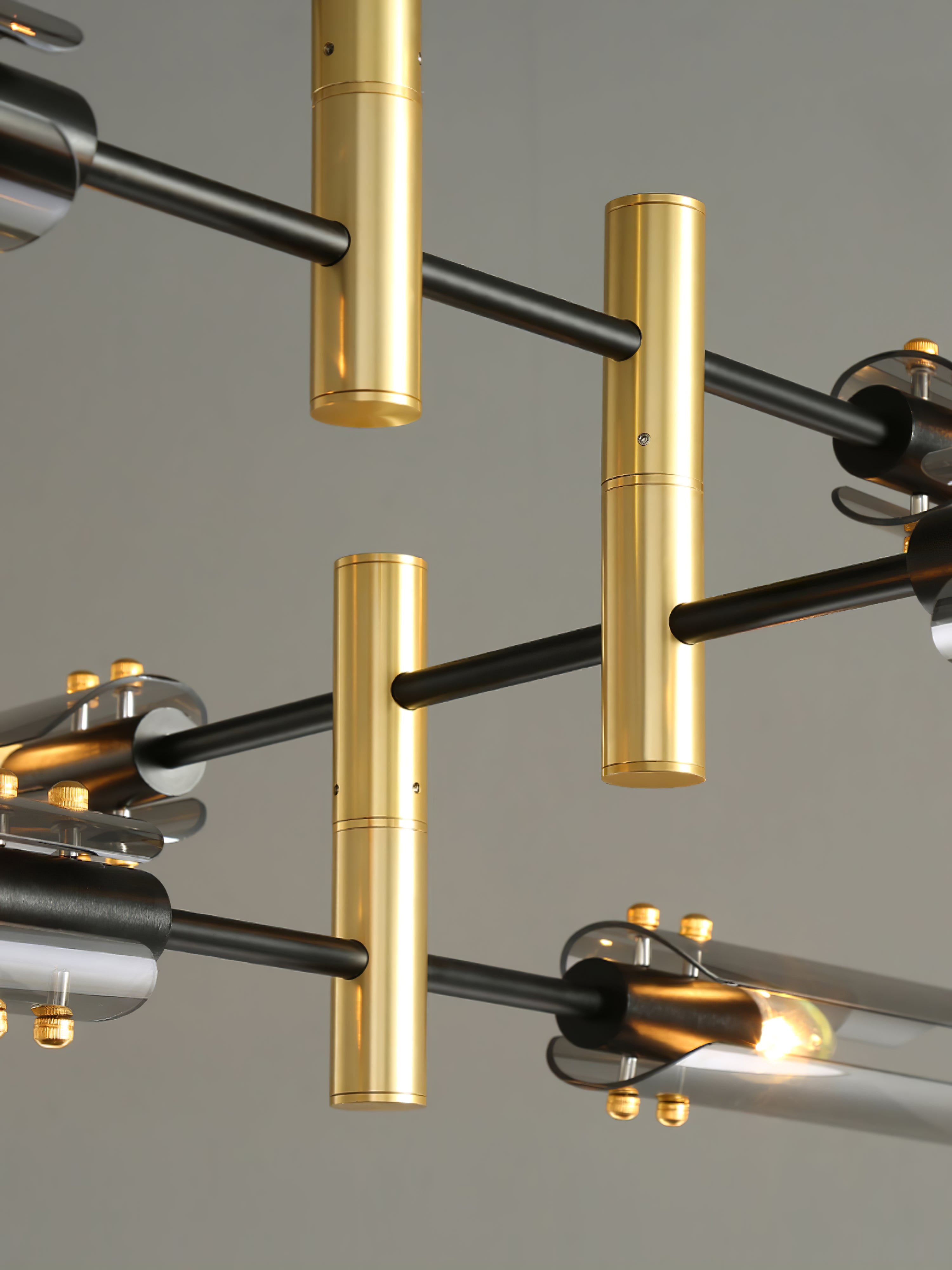 Anna kannanotto malliston Astrid Double Chandelierin avulla, jossa on kuusi lasivarjostusta. Tämän lineaarisen rakenteen kumpaankin päähän on asennettu lamppu. Kehyksessä on vanhentunutta kultaa ja mustaa, mikä täydentää ja täydentää modernia, minimalistista estetiikkaa.