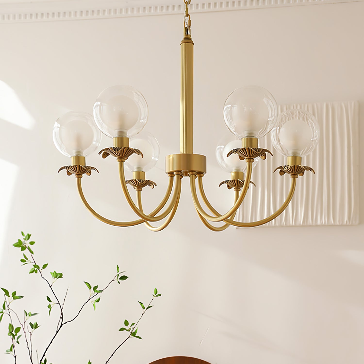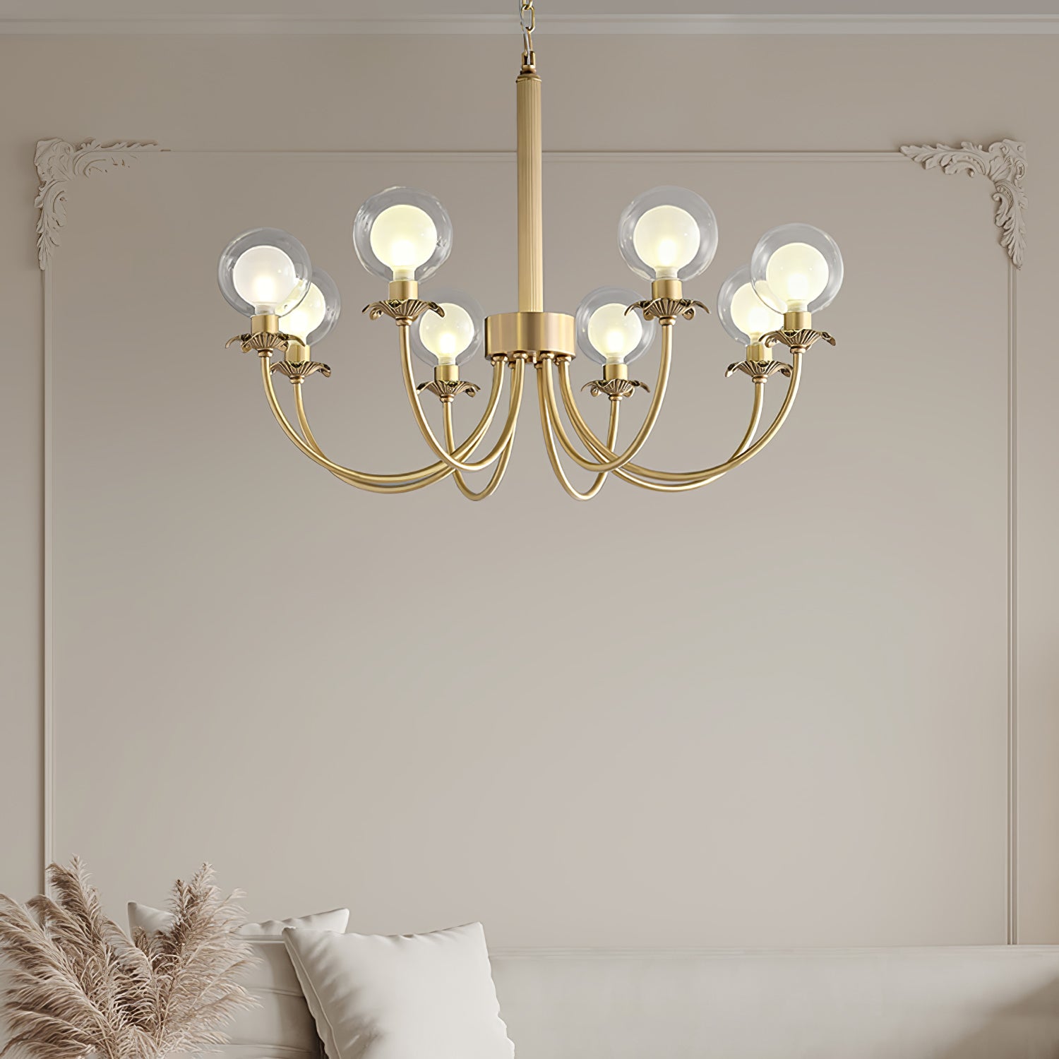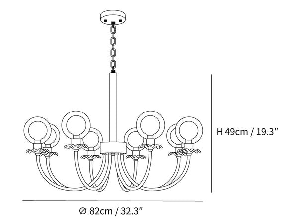 Aureate Radiance Glass -kattokruunu on ylellisyyden ja taiteen ruumiillistuma, joka on suunniteltu nostamaan minkä tahansa tilan loistoksi. Laadukkaasta messingistä valmistetut ja kiiltäväksi kiillotetut tyylikkäät oksat kaareutuvat kauniisti ja pitävät hehkuvat sipulit alkuperäisten lasipallojen päällä. Lasin täydellinen läpinäkyvyys takaa tasaisen valon jakautumisen luoden pehmeän ja säteilevän houkuttelevuuden. Tämä kattokruunu on täydellinen ylellisyyttä tarvitseviin ympäristöihin ja toimii sekä valonlähteenä että silmiinpistävänä keskipisteenä.