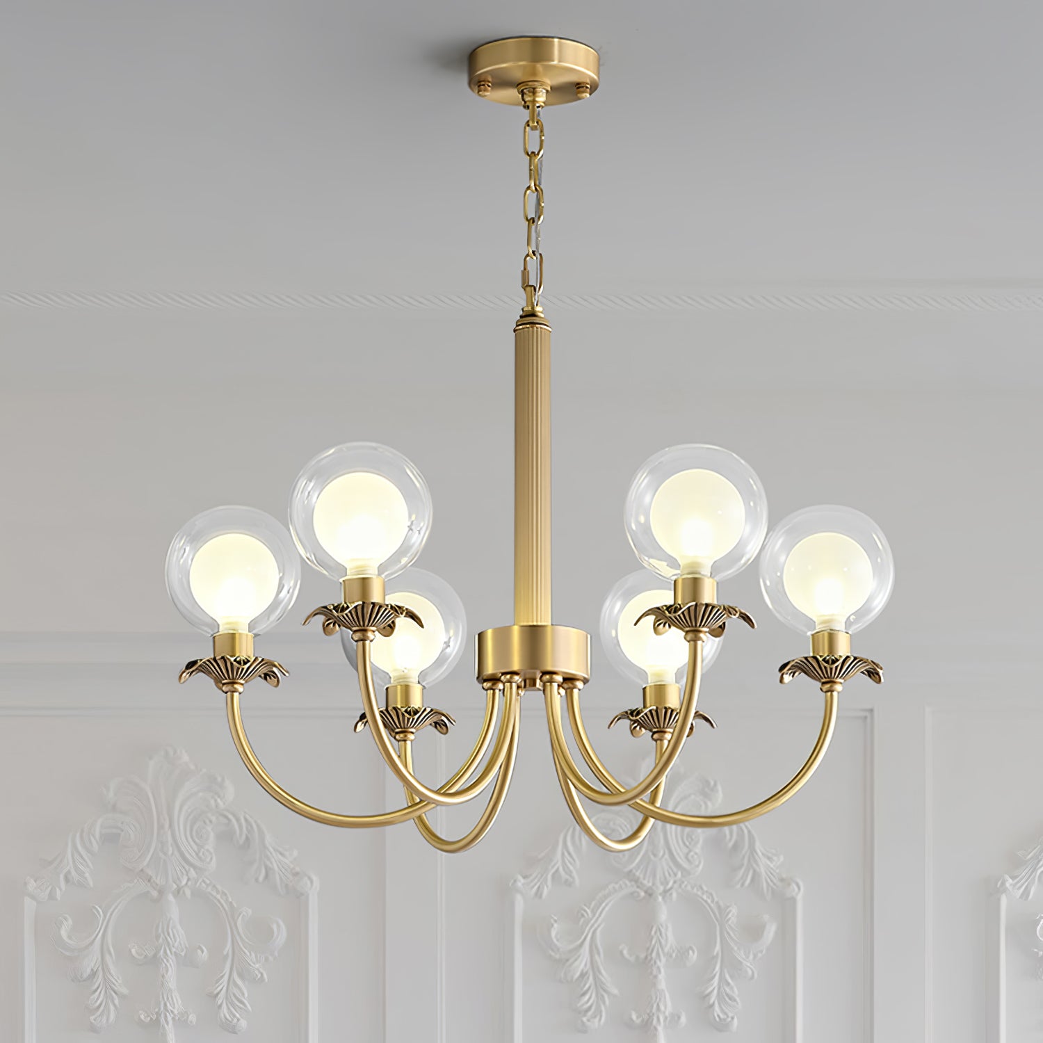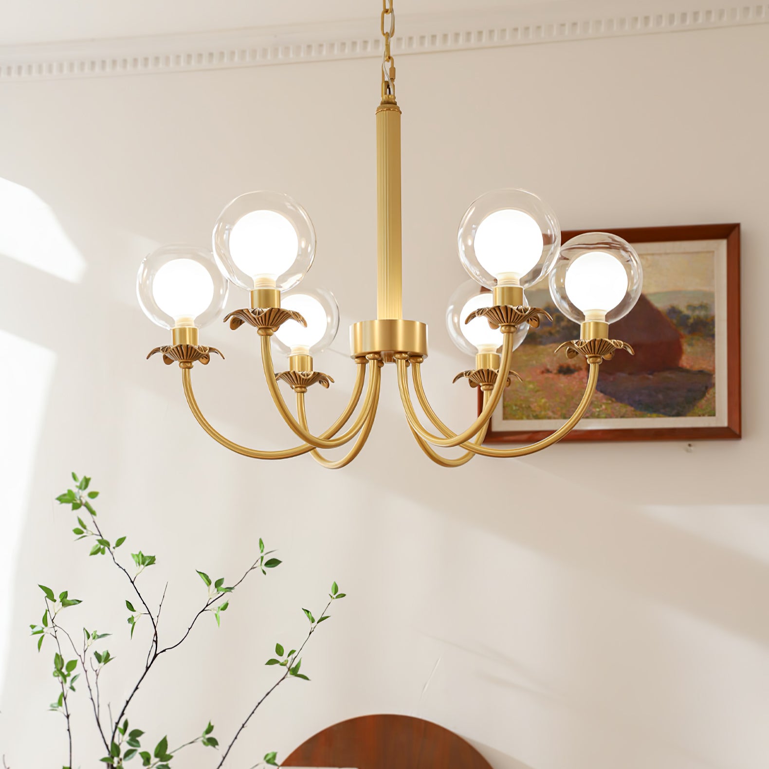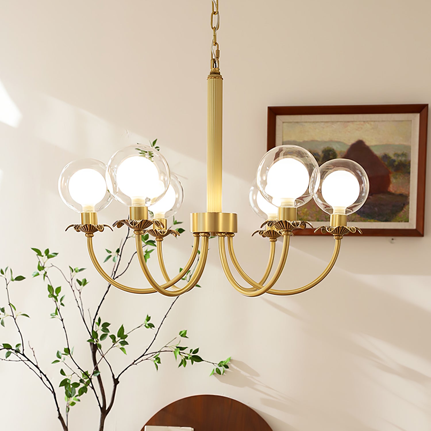 Aureate Radiance Glass -kattokruunu on ylellisyyden ja taiteen ruumiillistuma, joka on suunniteltu nostamaan minkä tahansa tilan loistoksi. Laadukkaasta messingistä valmistetut ja kiiltäväksi kiillotetut tyylikkäät oksat kaareutuvat kauniisti ja pitävät hehkuvat sipulit alkuperäisten lasipallojen päällä. Lasin täydellinen läpinäkyvyys takaa tasaisen valon jakautumisen luoden pehmeän ja säteilevän houkuttelevuuden. Tämä kattokruunu on täydellinen ylellisyyttä tarvitseviin ympäristöihin ja toimii sekä valonlähteenä että silmiinpistävänä keskipisteenä.