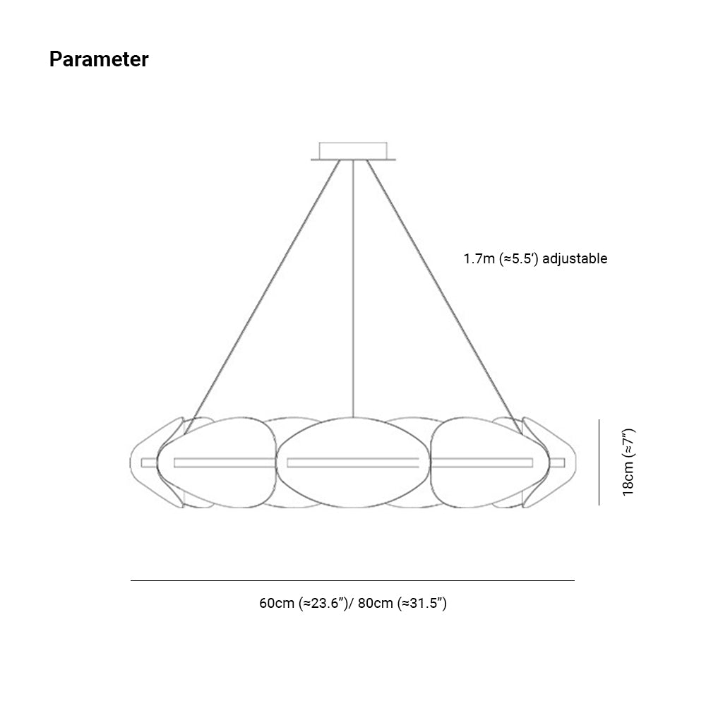 Riippuvalaisin on valmistettu metallista, kun taas lampunvarjostin on valmistettu kristallimateriaalista, jossa metallin vakaus yhdistyy kristallin säteilyyn, mikä tarjoaa erinomaisen valotekstuurin.