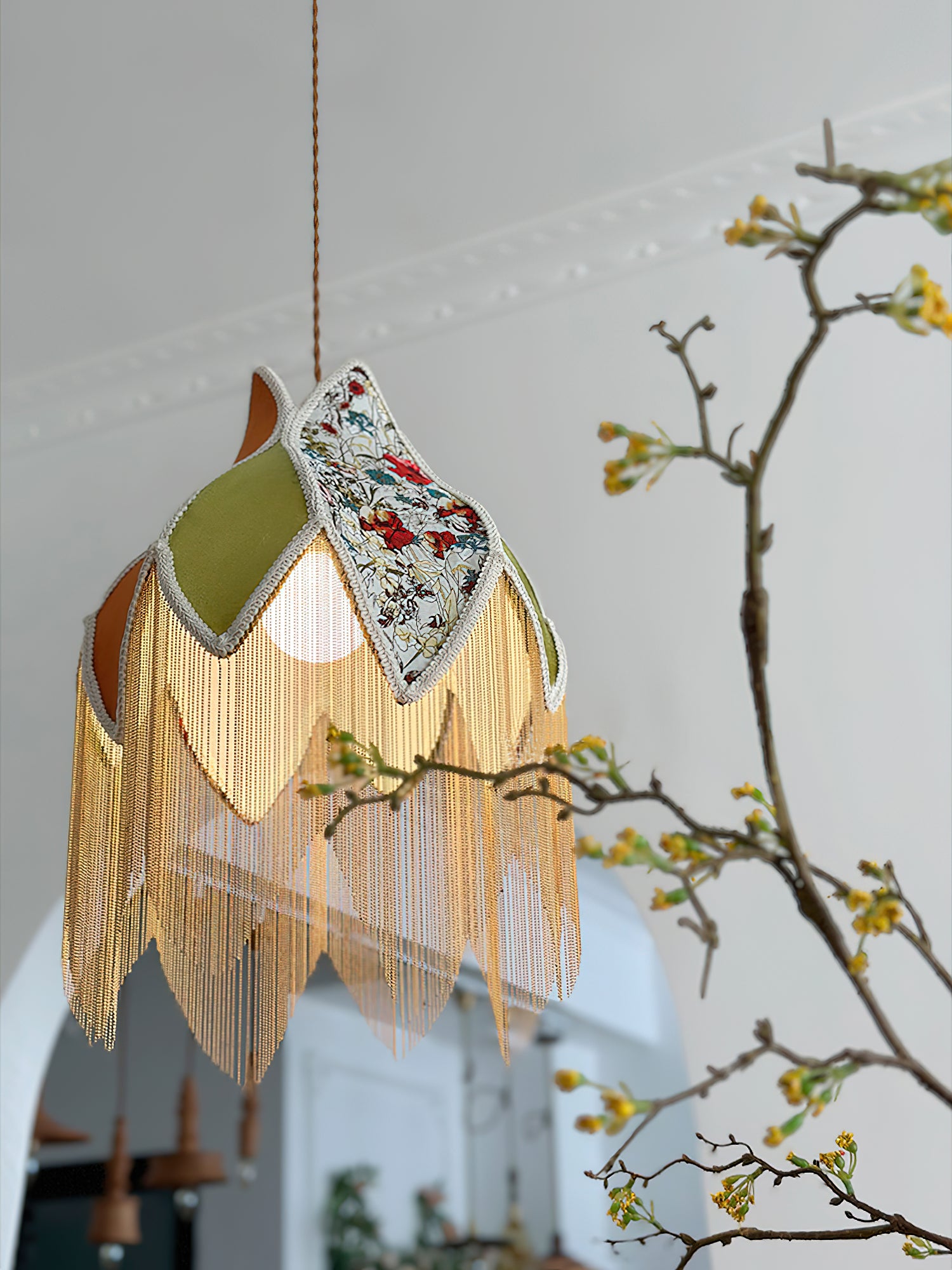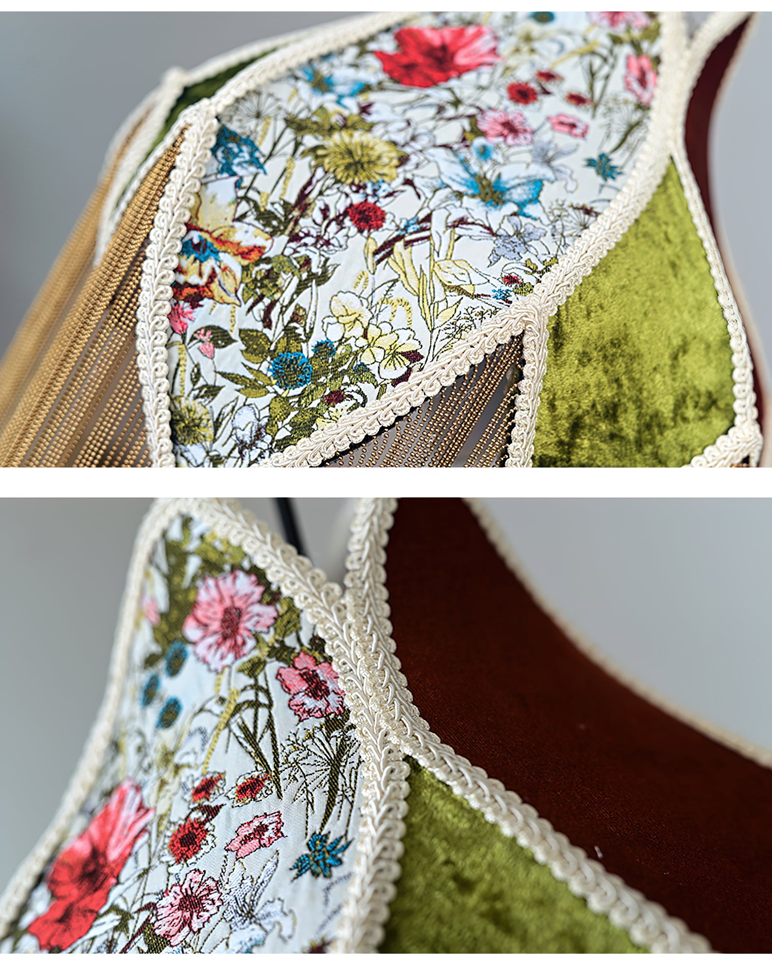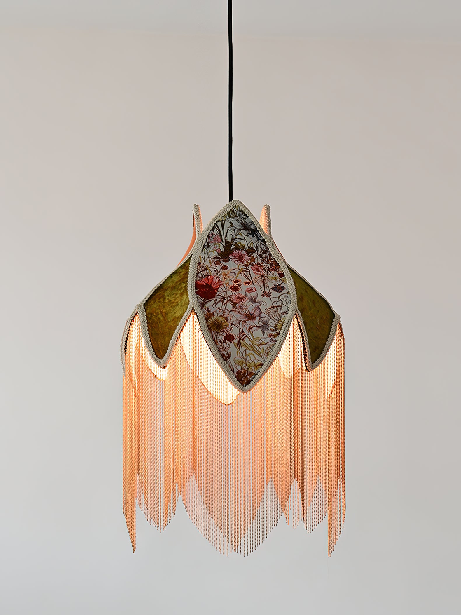 Täydelliset kaarevat ja ylelliset hapsut, jotka on verhoiltu huolellisesti ylellisellä sametillamme, sisältävät herkän kukkakuvion, jossa kukat kietoutuvat kiertelevästi ja salaperäisesti yhteen luoden viehättävän sisäilmapiirin.