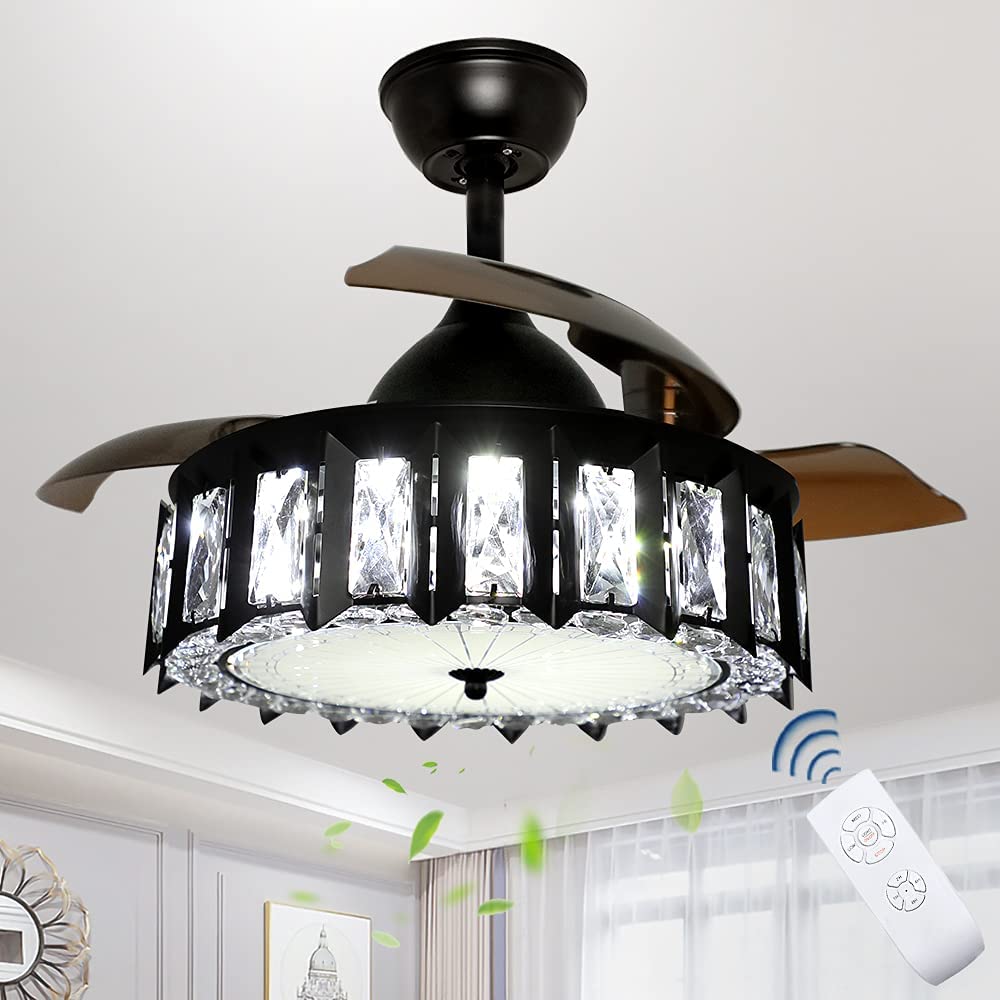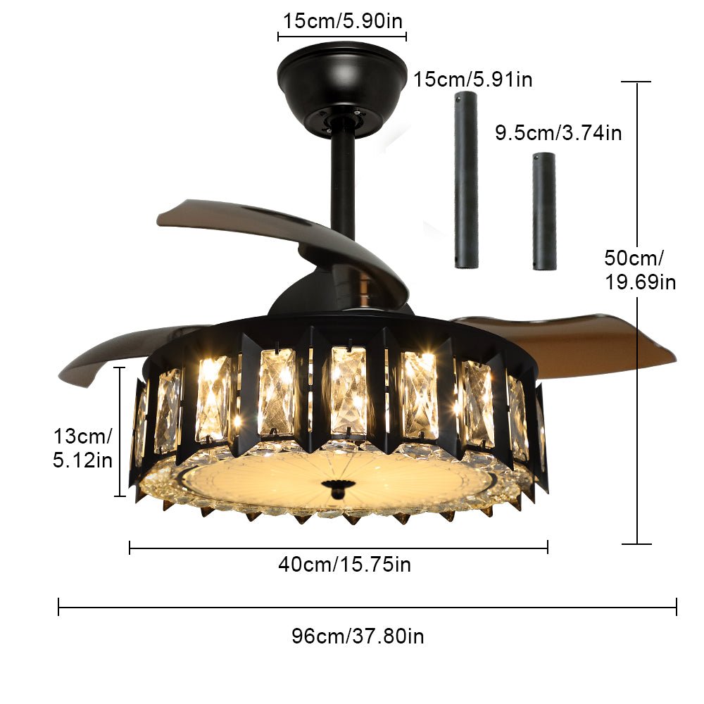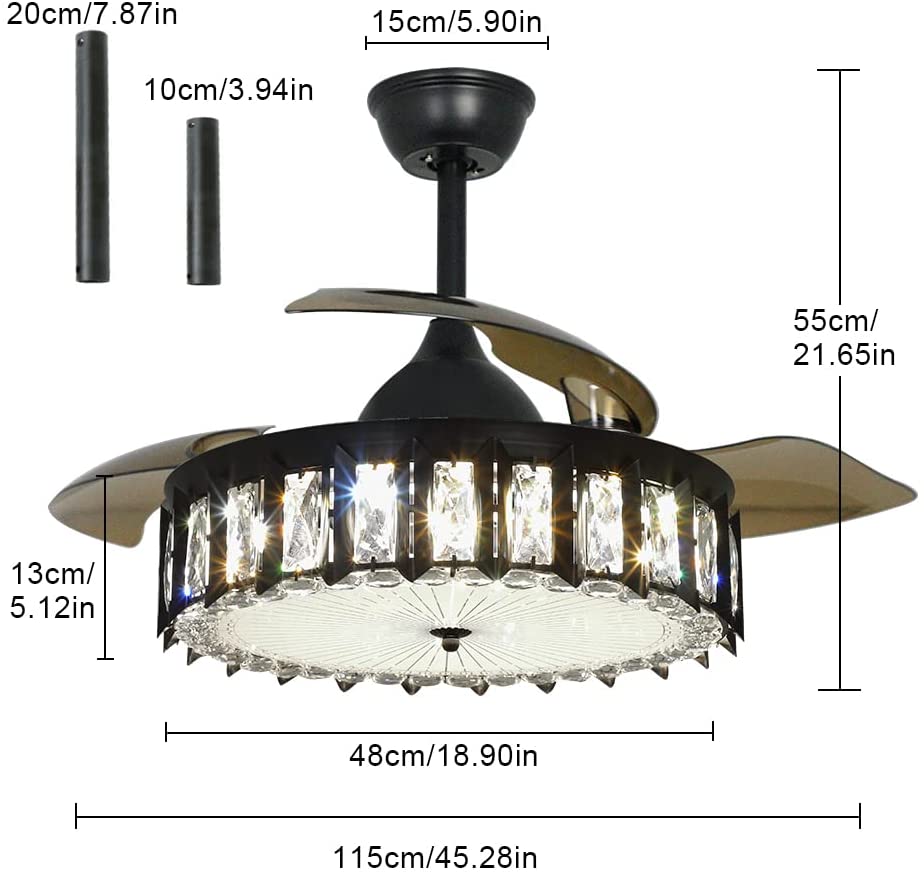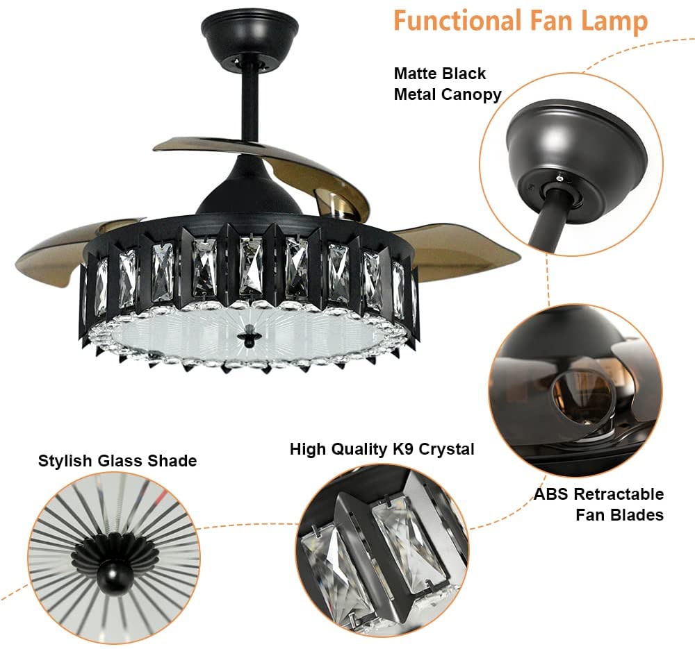 - Musta kattokruunu kattotuuletin on valmistettu mattamustasta metallista ja laadukkaasta K9-kristallista. Ja 3 ABS-tuulettimen siipeä ja vahva kuparimoottori tuovat sinulle viileän ja hiljaisen ympäristön.