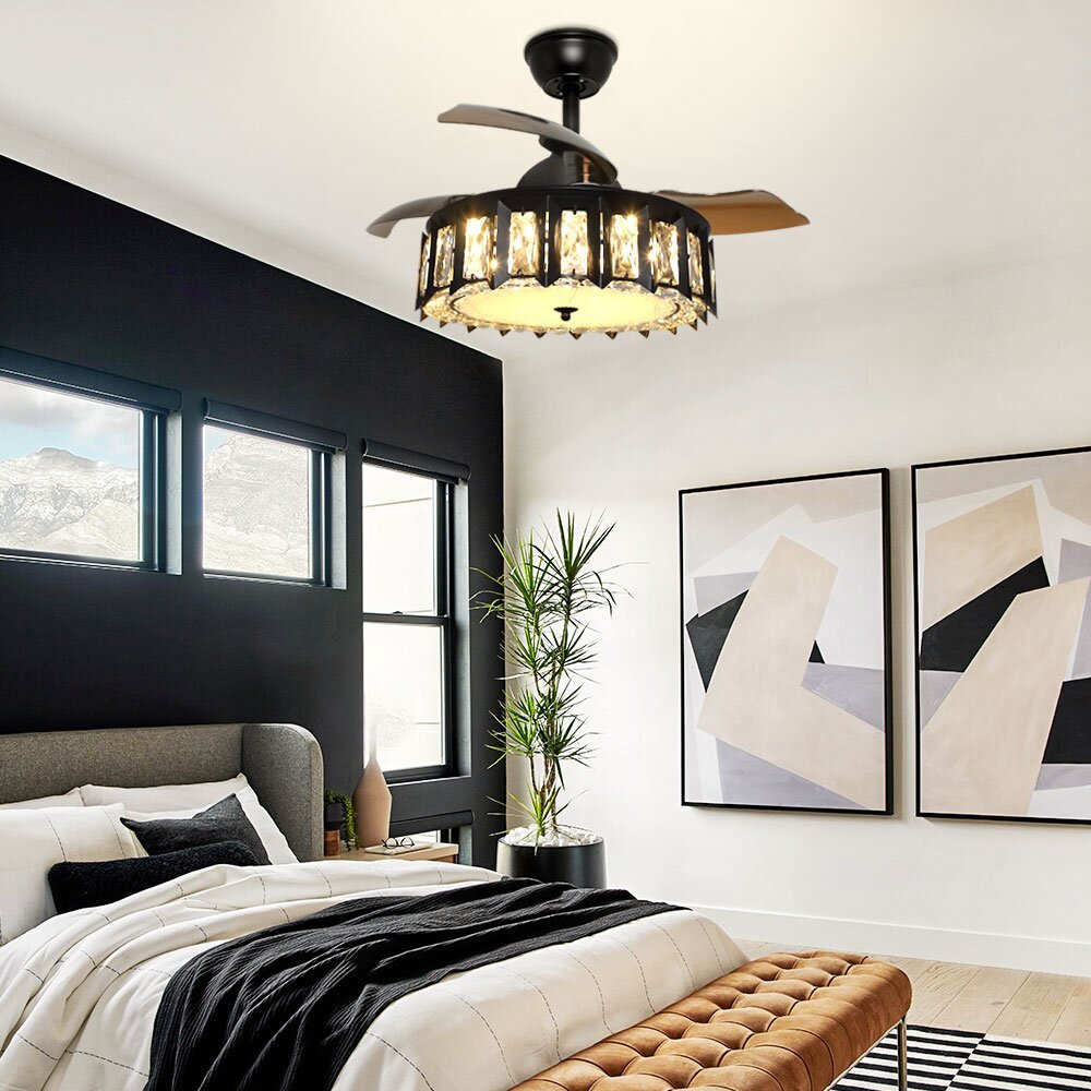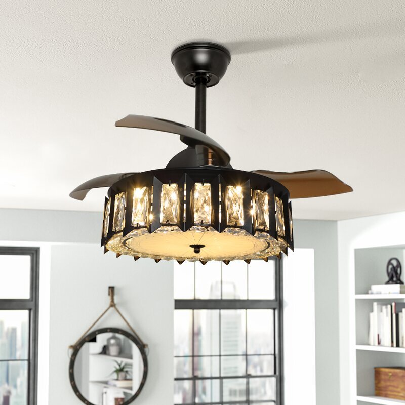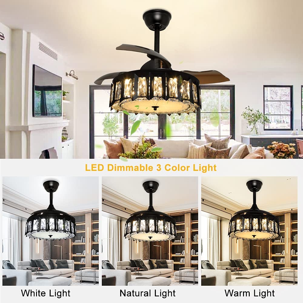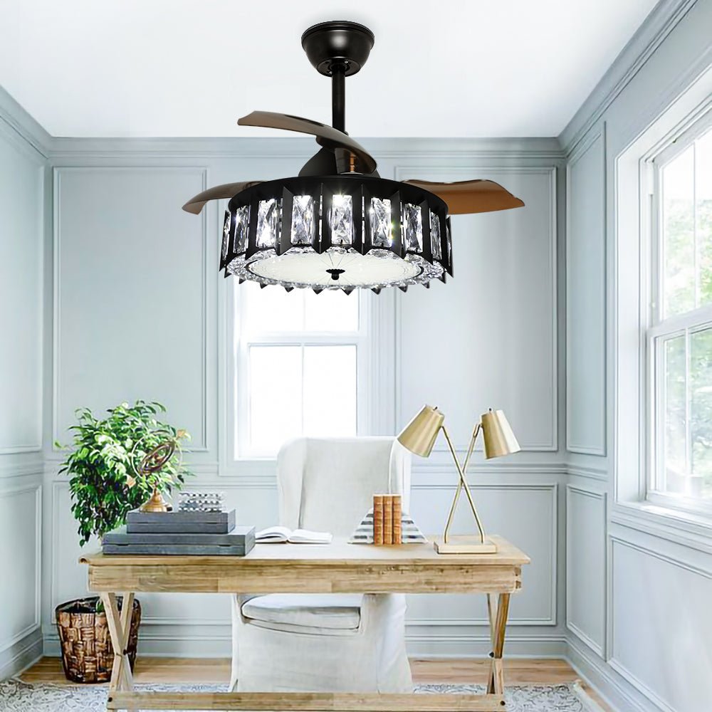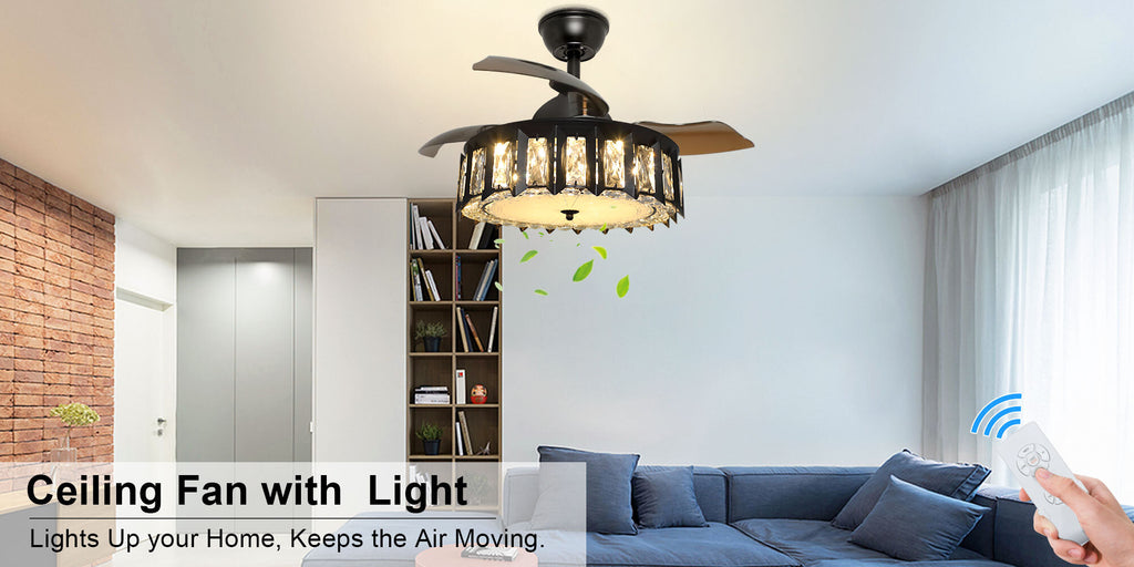 - Musta kattokruunu kattotuuletin on valmistettu mattamustasta metallista ja laadukkaasta K9-kristallista. Ja 3 ABS-tuulettimen siipeä ja vahva kuparimoottori tuovat sinulle viileän ja hiljaisen ympäristön.