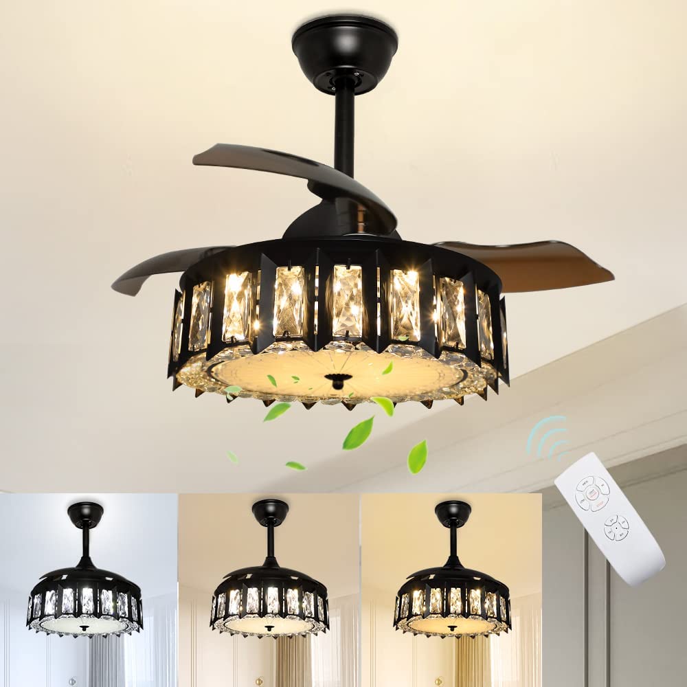 Depuley Crystal kattotuuletin valoilla, teollisuuskattotuuletin kaukosäätimellä, 27W/36W mustat kattotuulettimet, 3-lapainen sisäänvedettävä LED-tuulettimen kattokruunu olohuoneeseen, 3 väriä vaihdett