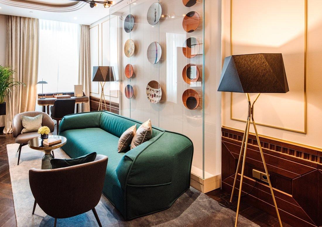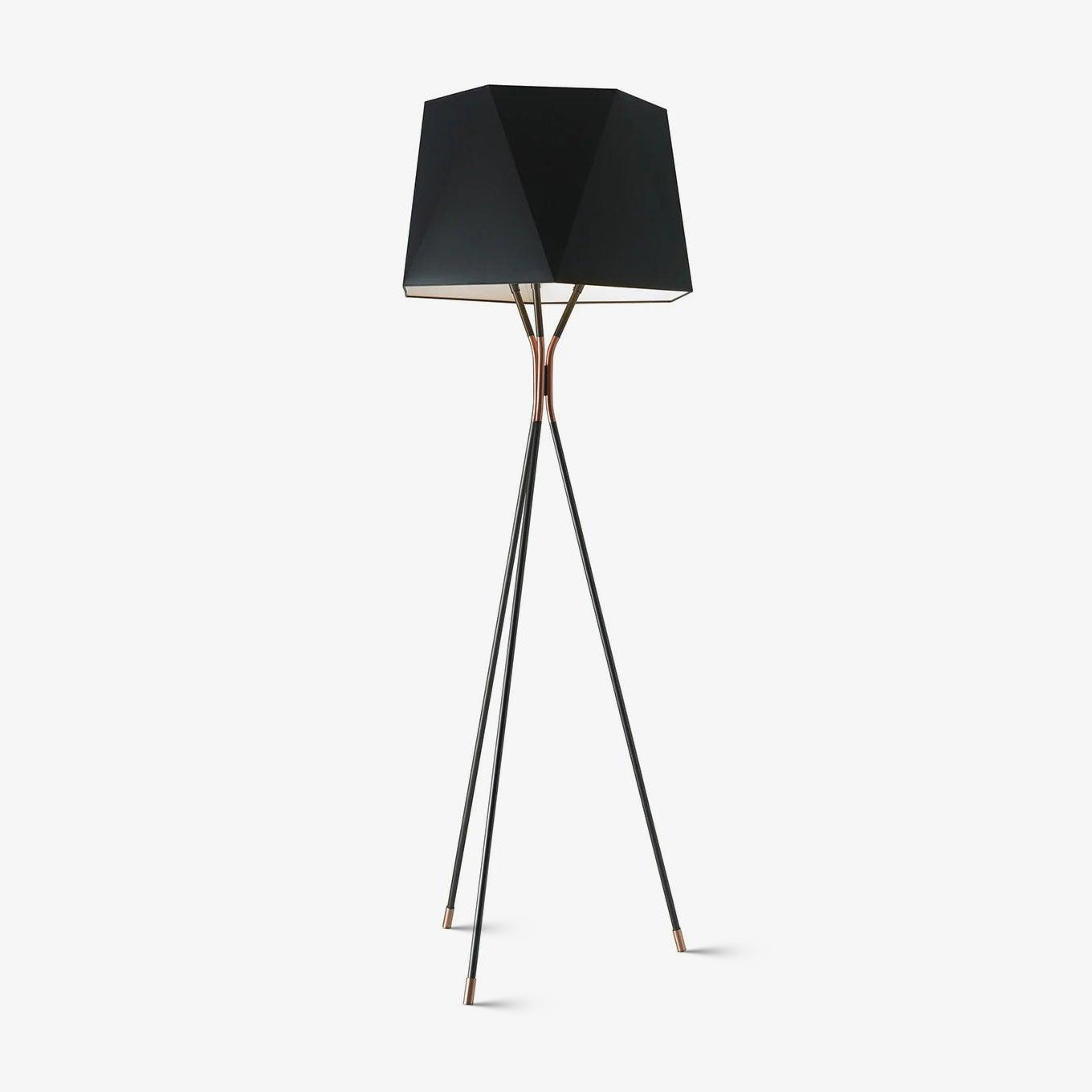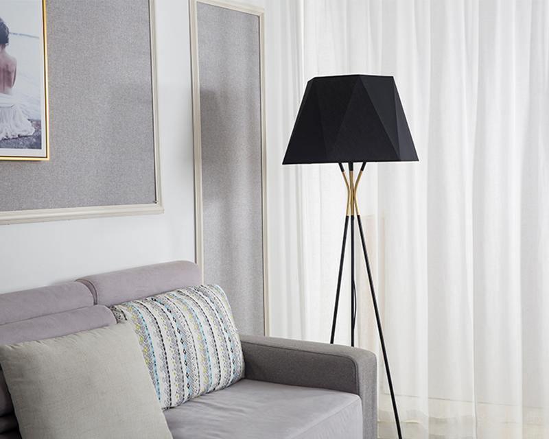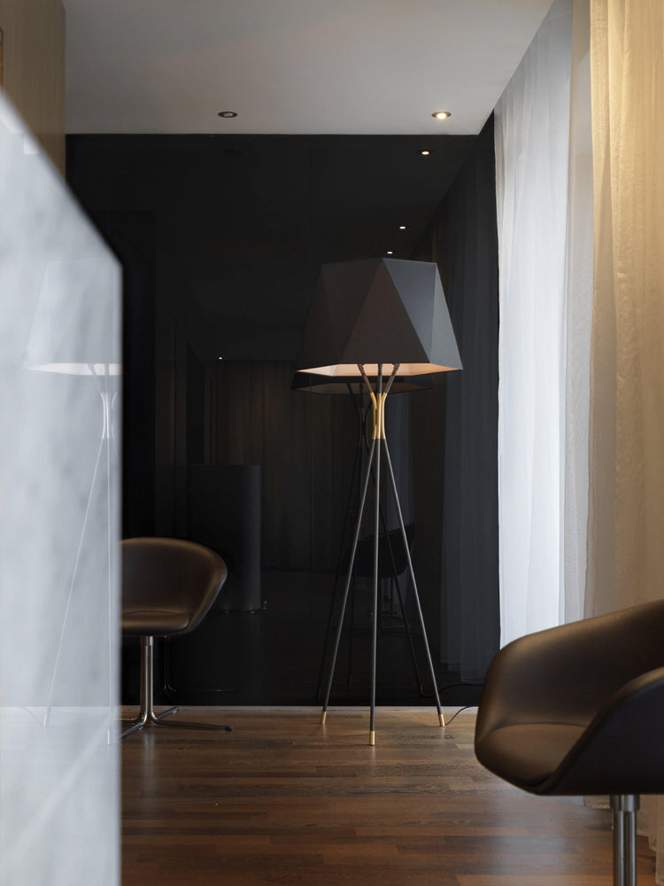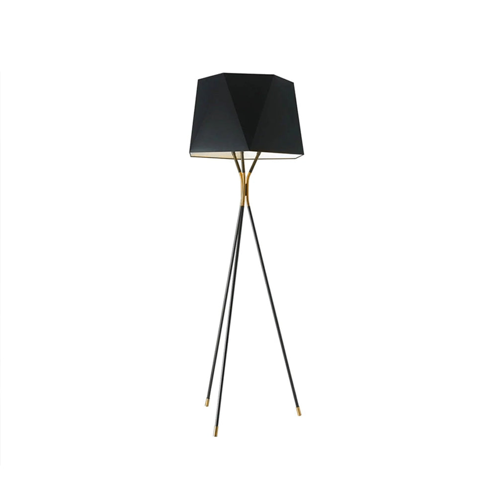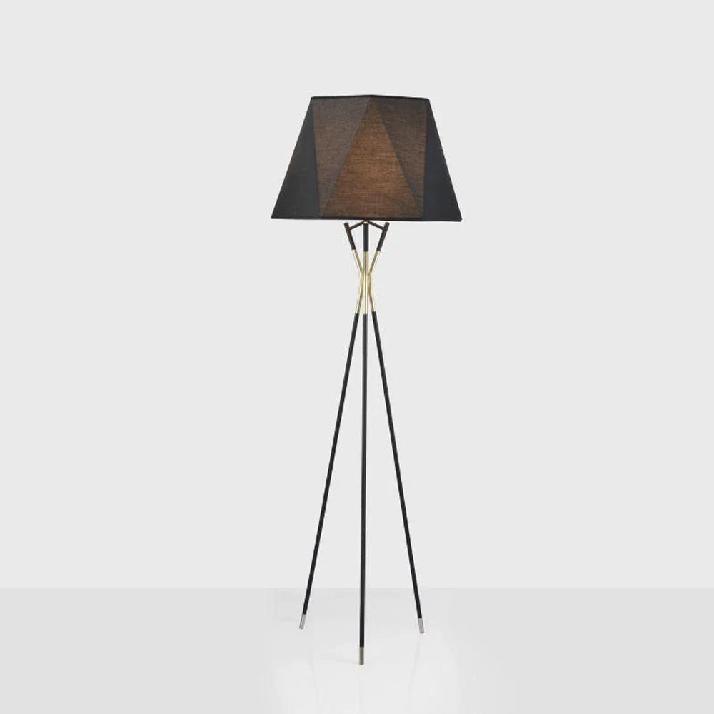 Tämä kolmijalkainen lattiavalaisin, jota on tehostettu viistetyllä varjostimella, on kaksisävyinen. Halutessasi räätälöitävissä oleva ainutlaatuinen kappale sopii tyylikkäästi valintasi viimeistelyyn. Kolmen messinkikärjeisen jalan ja mustan monikulmaisen kangasvarjostimen ansiosta lattiavalaisimen muotoilu on yksinkertainen mutta tyylikäs.