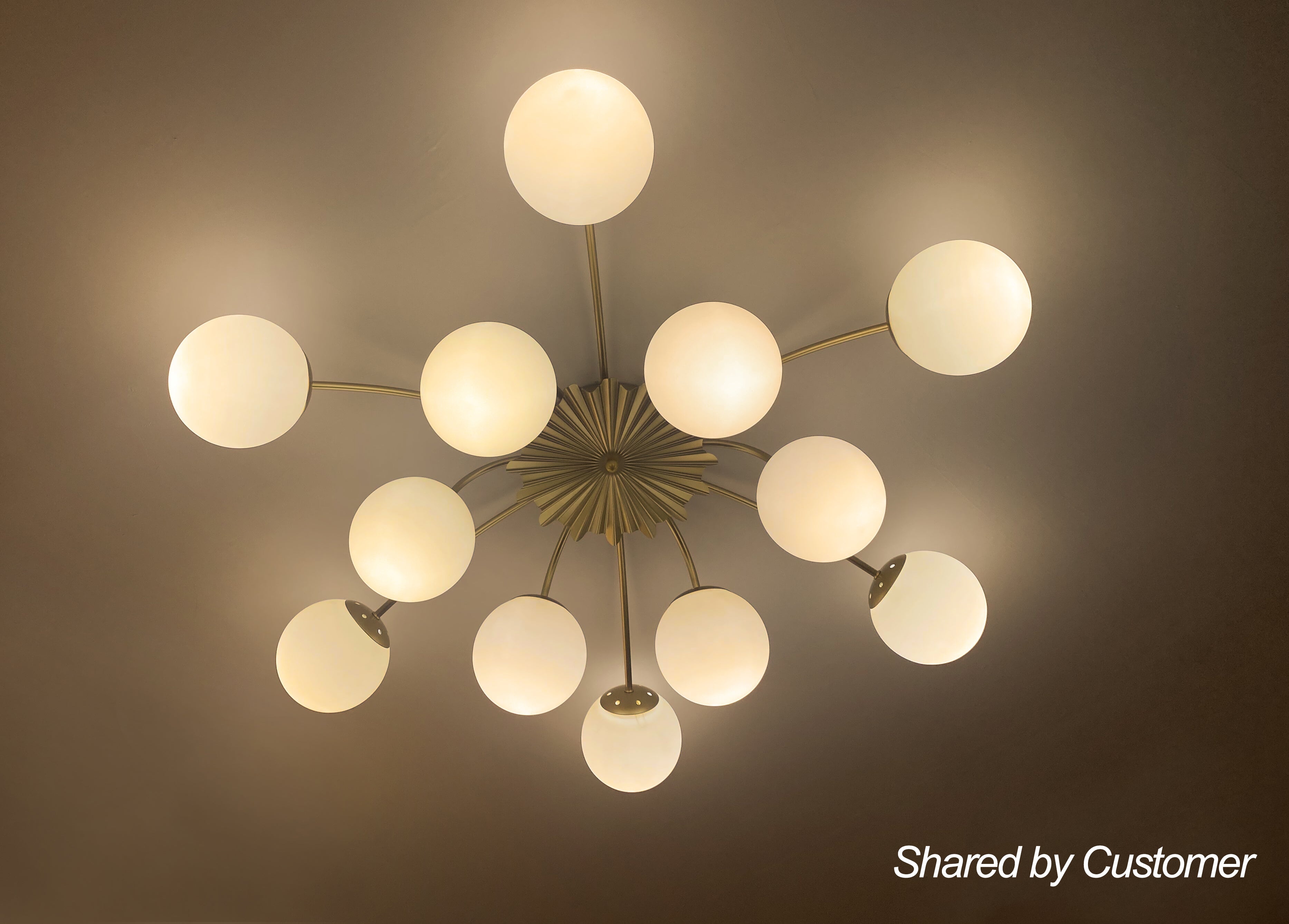 Kaksitoista valoa • Himmeä lasipallot • Kuplarakenne • Sputnik-kehys • Messinkiviimeistely • E26-pohjaiset polttimot (ei sisälly) • Kiinteä • UL-listattu