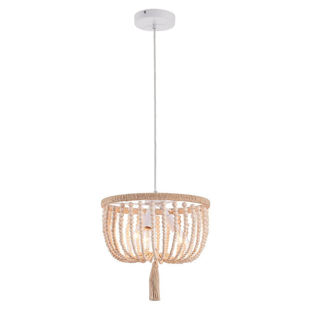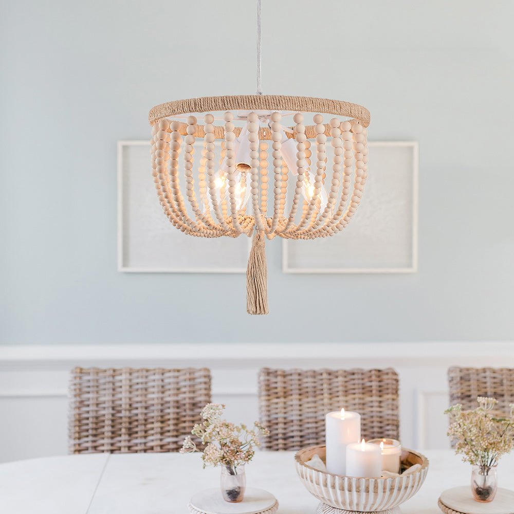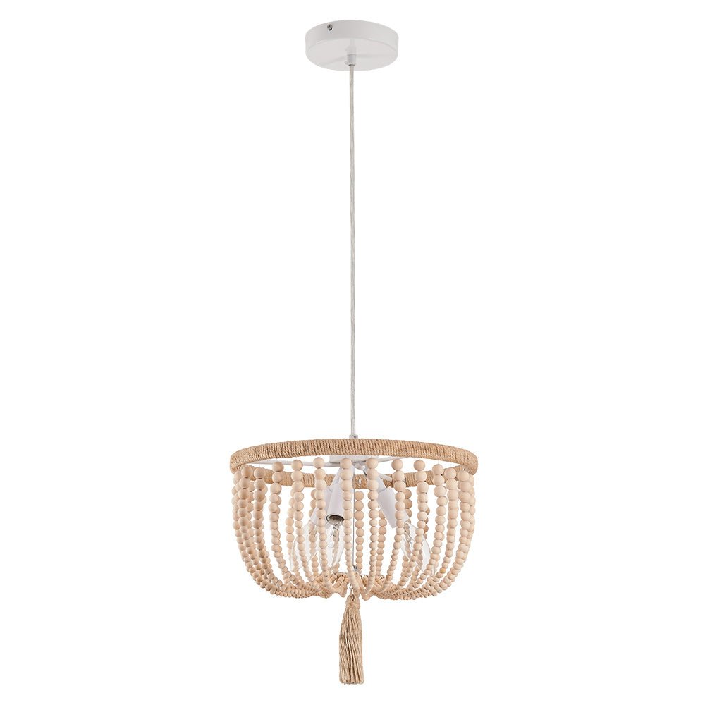 Rannikon viehätys maalaismaisella viehätysvoimalla laskeutuu maanläheiseksi taiteellisessa tunnelmassa tällä boheemilla puuhelmivalaisimilla. Luonnollisilla hamppuköydellä ja valkoisilla puuhelmikoristeilla suunniteltu Boho-helmiriippuvalaisin on tyylikäs rustiikkinen huvi sekä moderniin että maalaistaloon. Yhteensopiva kolmen E12/E14 kynttelikön polttimolla (ei sisälly toimitukseen), tämä boheemi kulhohelmillä varusteltu riippuvalaisin on upea valaisin loistella ruokasalissa, keittiössä, olohuoneessa, makuuhuoneessa ja eteisessä.Detail