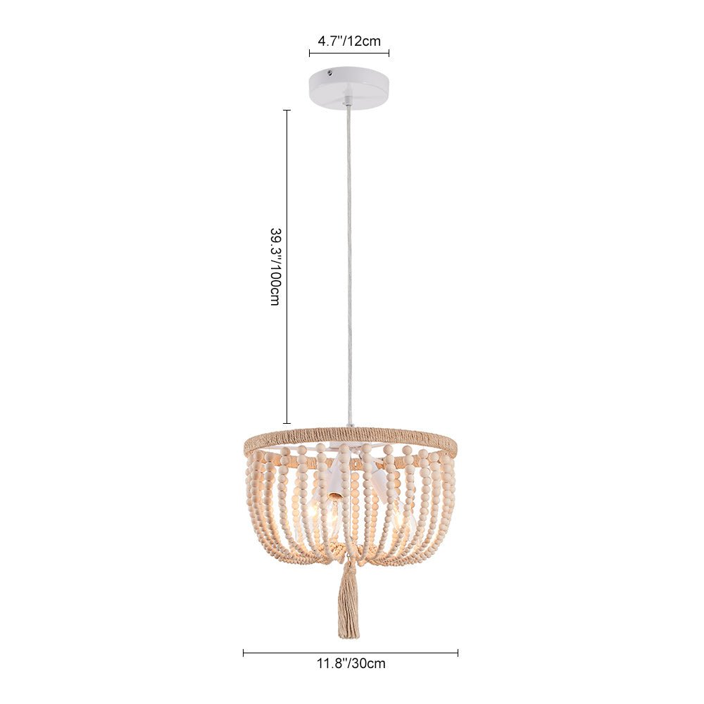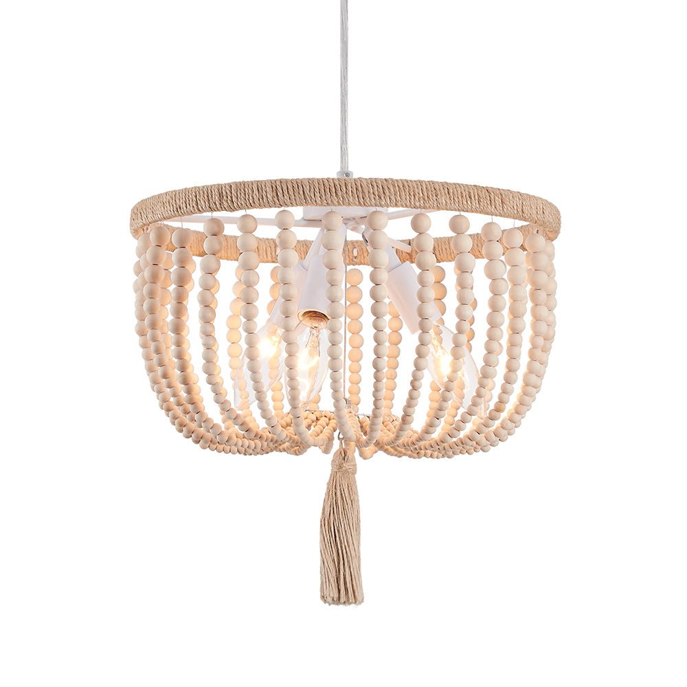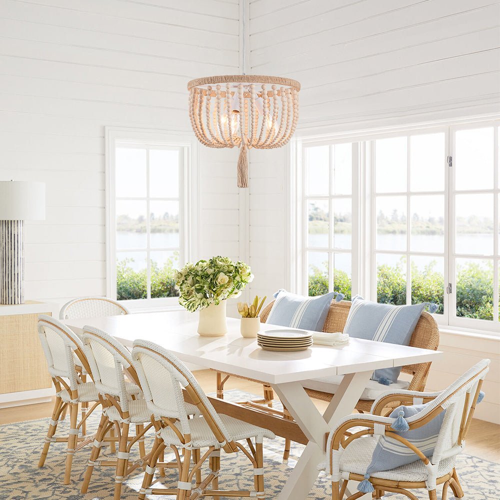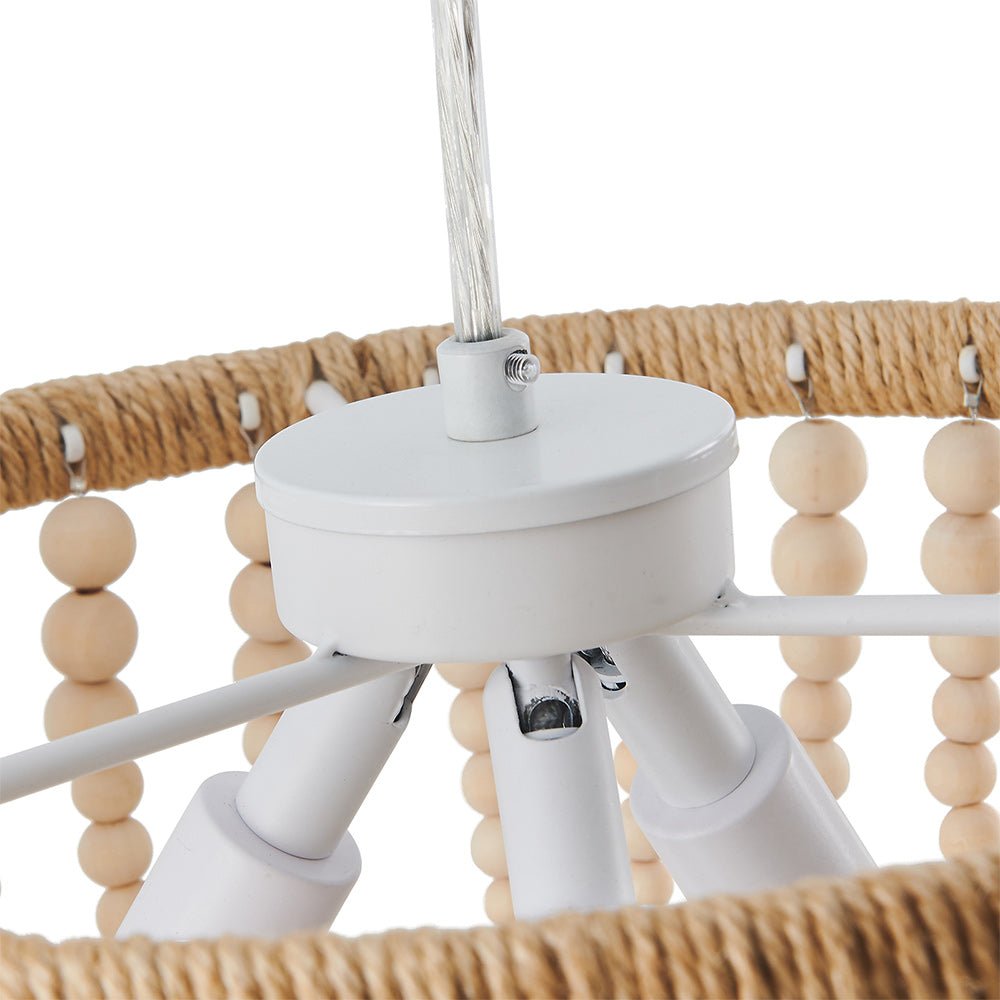 Rannikon viehätys maalaismaisella viehätysvoimalla laskeutuu maanläheiseksi taiteellisessa tunnelmassa tällä boheemilla puuhelmivalaisimilla. Luonnollisilla hamppuköydellä ja valkoisilla puuhelmikoristeilla suunniteltu Boho-helmiriippuvalaisin on tyylikäs rustiikkinen huvi sekä moderniin että maalaistaloon. Yhteensopiva kolmen E12/E14 kynttelikön polttimolla (ei sisälly toimitukseen), tämä boheemi kulhohelmillä varusteltu riippuvalaisin on upea valaisin loistella ruokasalissa, keittiössä, olohuoneessa, makuuhuoneessa ja eteisessä.Detail