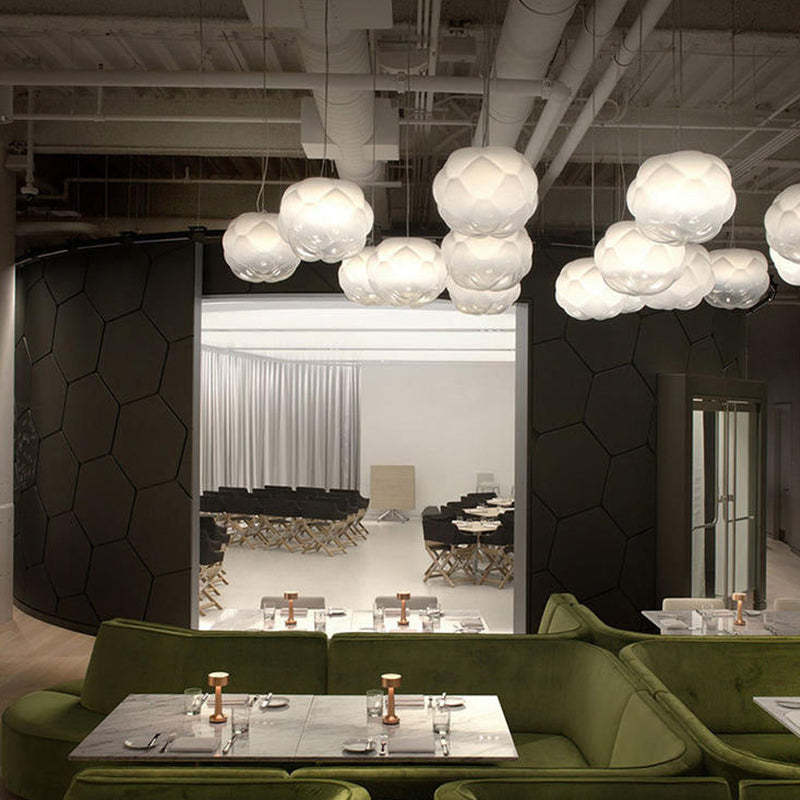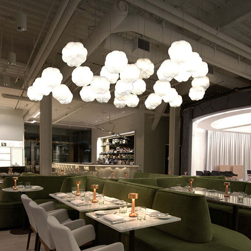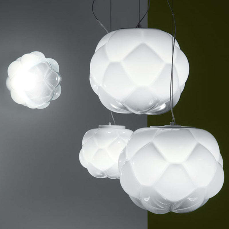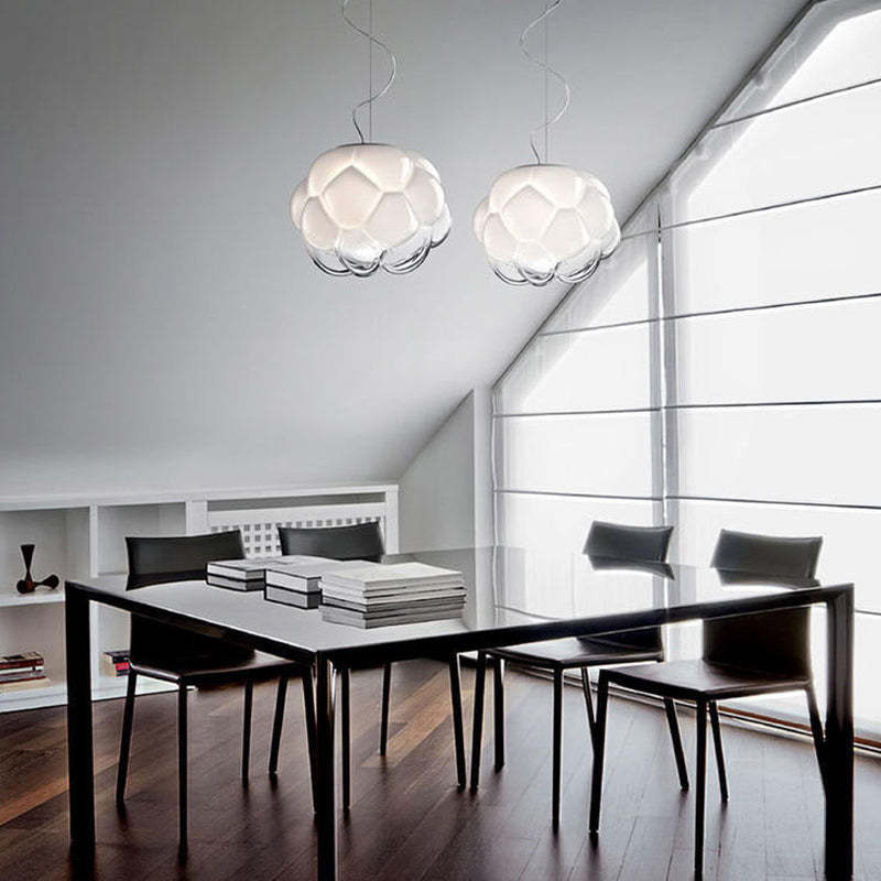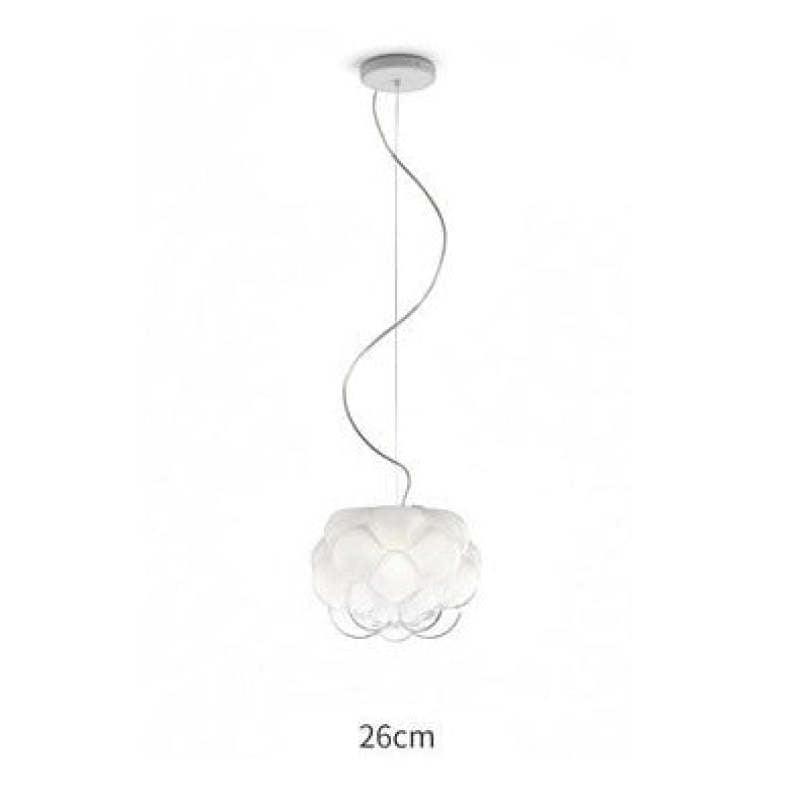- Tämän valkoisen lasiriippuvalaisimen moderni ja mielenkiintoinen pilvimuoto on myös hyvä valinta koristeeksi.