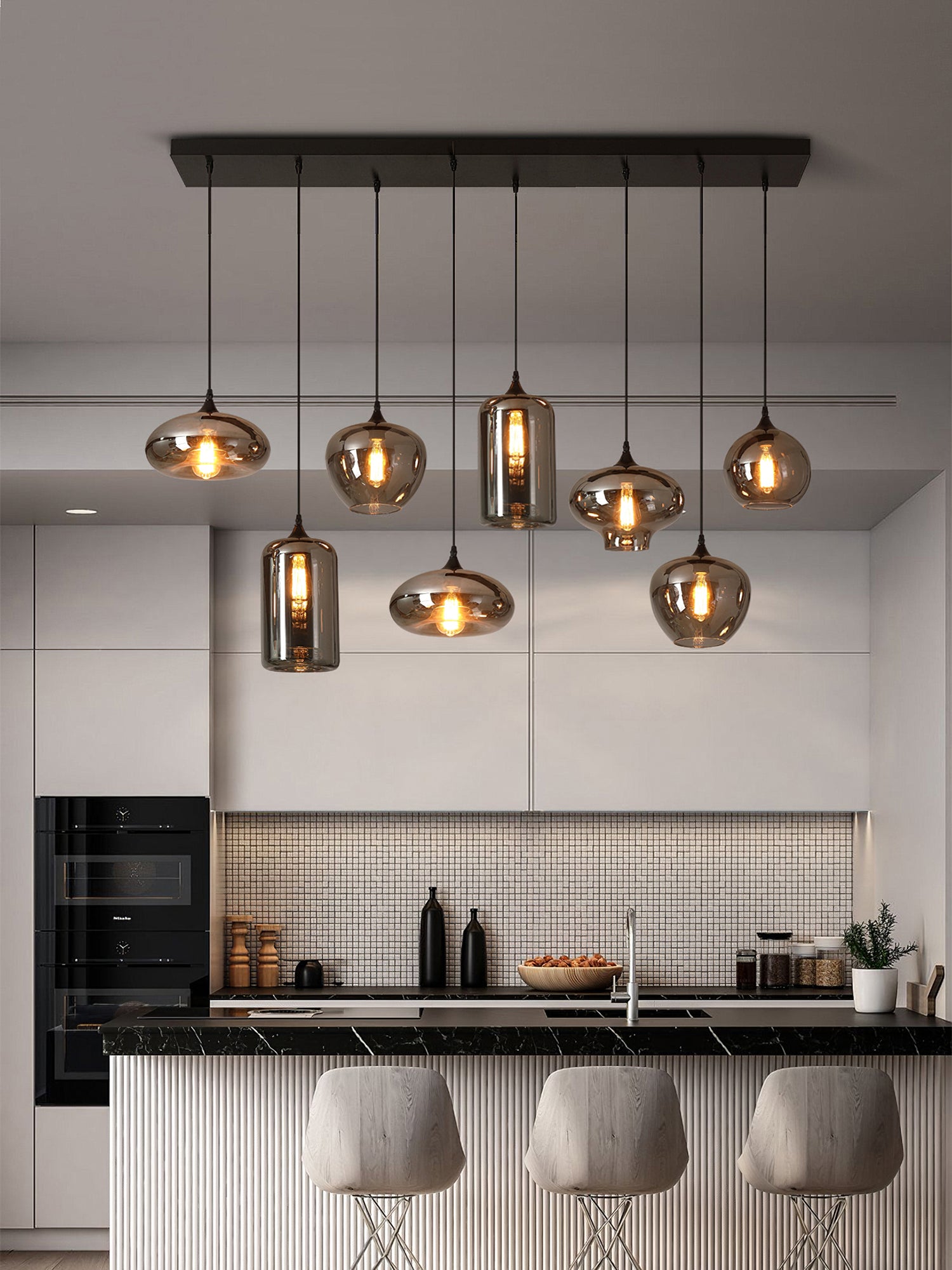 Ylellisen pullon lasiriippuvalaisin on suunniteltu säteilemään lämmintä ja kutsuvaa hehkua luoden hellävaraista valaistusta, joka lisää ripauksen viehättävyyttä mihin tahansa huoneeseen. Sen mustan värinen runko huokuu ylellisyyden tunnetta, kun taas savunharmaa lampunvarjostin lisää hienovaraista mutta selkeää viehätysvoimaa ympäröiden ympäristön pehmeällä, ympäröivällä valolla.