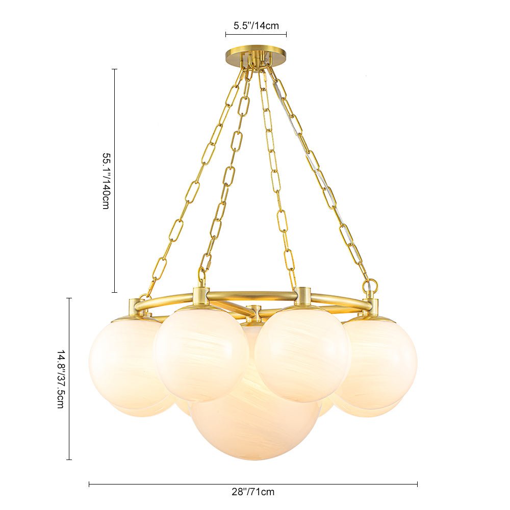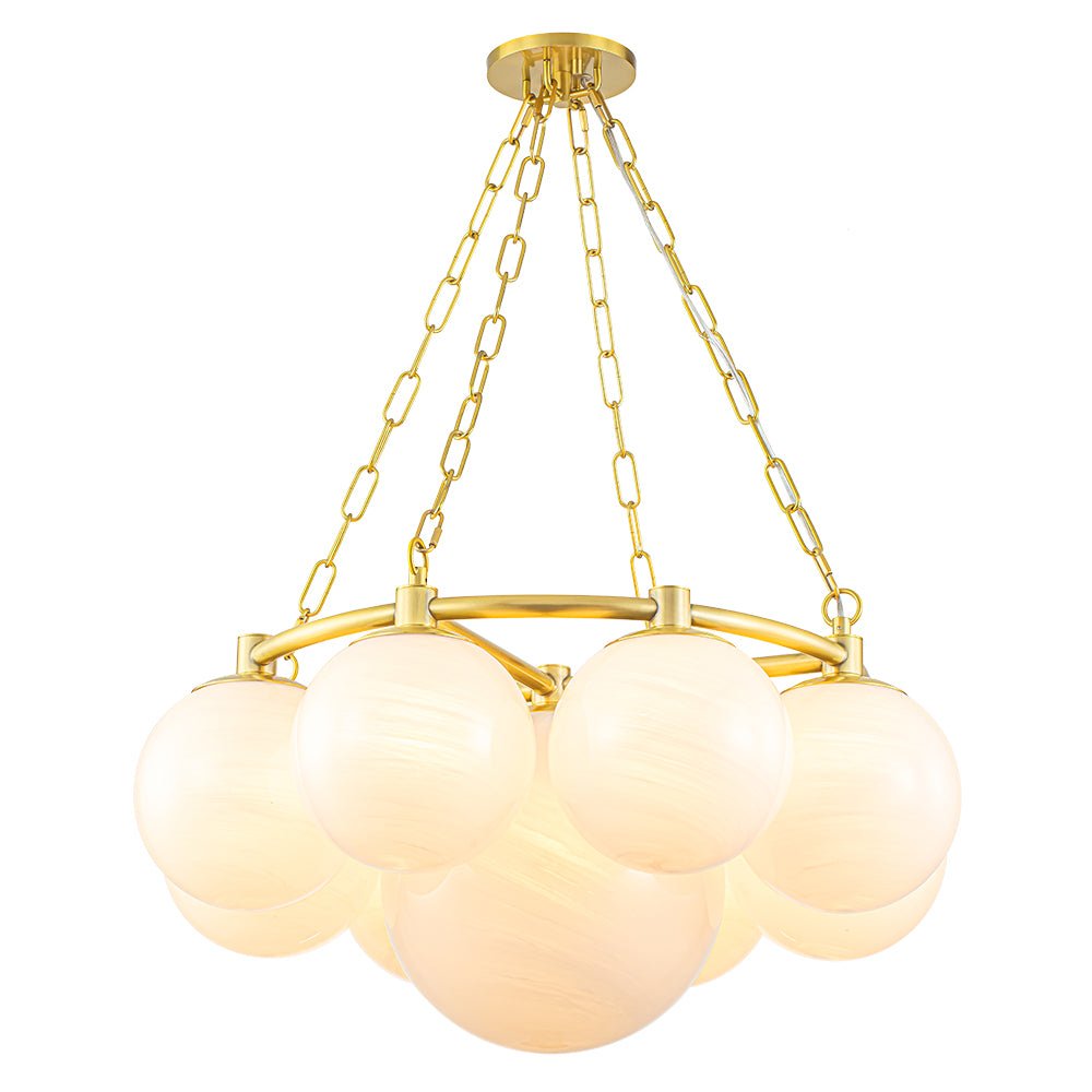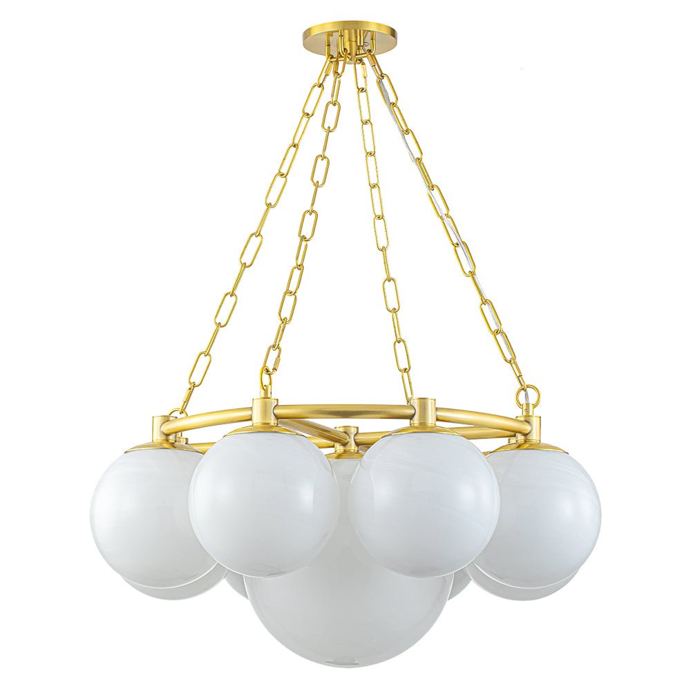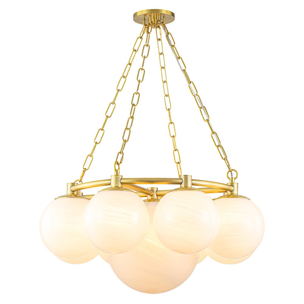 Yhdeksän valoa • Pyörän runko • Maitomainen kupla • Alabasterilasi • Messinkiviimeistely • E26-pohjaiset polttimot (ei sisälly) • Kiinteä • UL-listattu