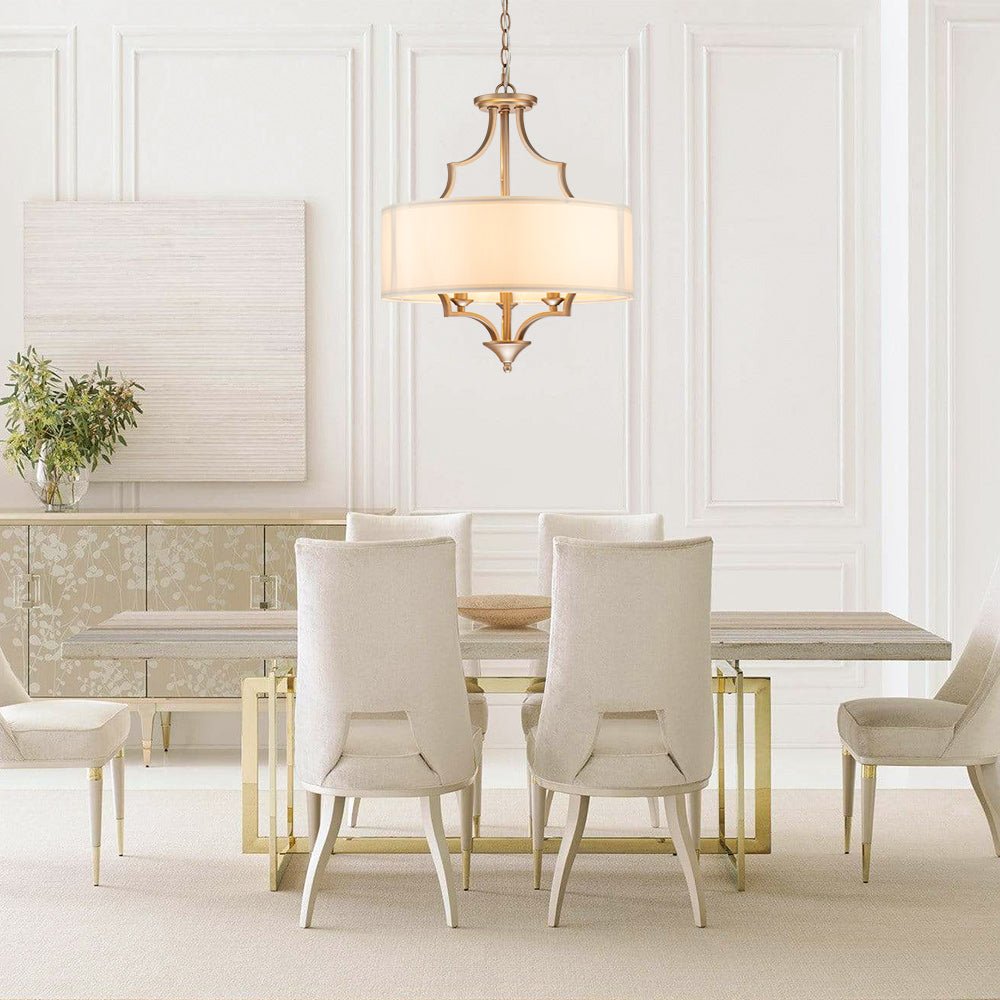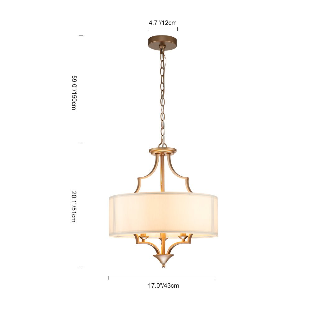 Modernissa vuosisadan puolivälin kangaskattokruunussa on messinkinen nelikantainen runko, jossa on 3 valon kynttilän muotoinen kanta, johon mahtuu E12/E14 kynttelikköpolttimot (ei sisällä). Valkoinen kankainen rumpuvarjostin ympäröi runkoa ja lisää kodikasta eleganttia kosketusta. Korkeussäädettävän ripustusketjun avulla voit asettaa tämän valkoisesta kankaasta valmistettu nelikantainen riipuksen puoliksi uppoasennettavaksi. Tämä messinkinen kynttilätyylinen rumpukankainen kattokruunu on upea päivitys sisäänkäynnin, makuuhuoneen ja olohuoneen tai ruokailutilan ja keittiön saaren sisustamiseen.Tiedot
