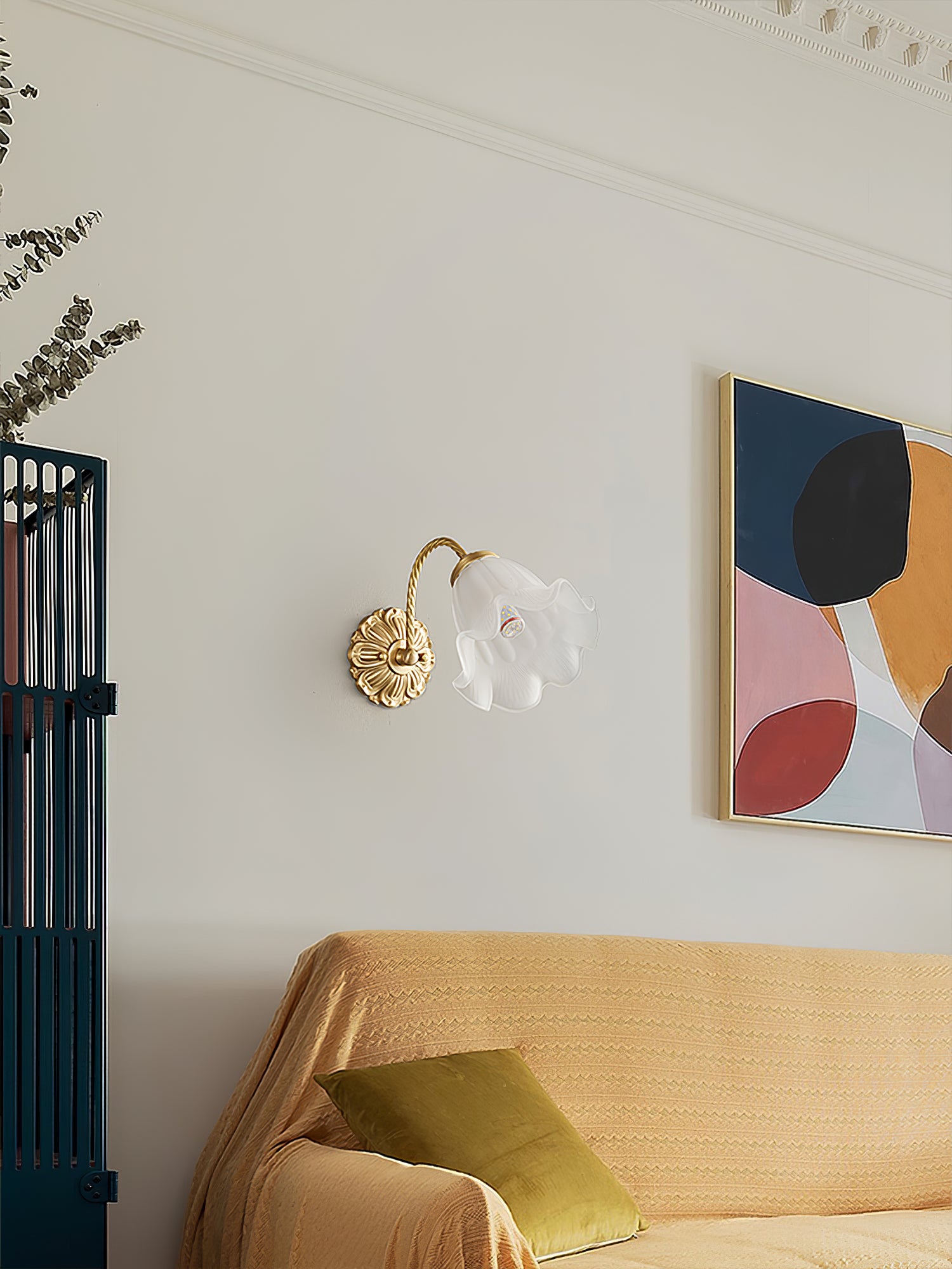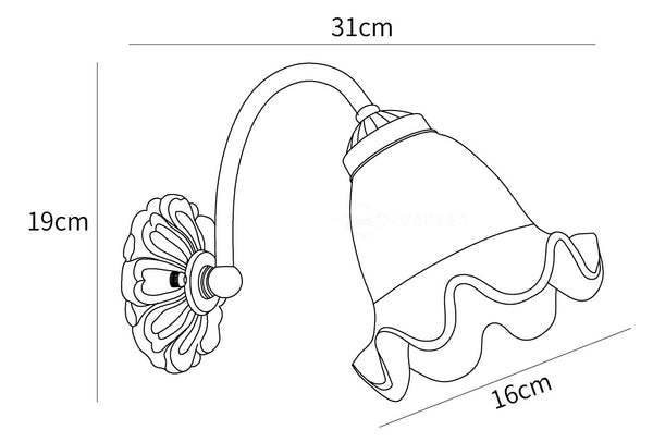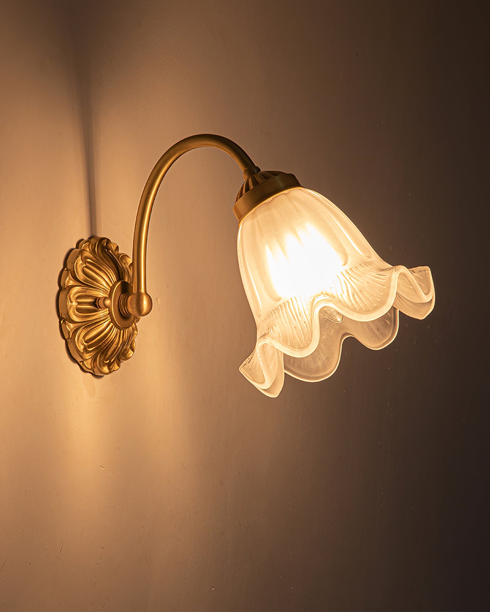 Tämä klassinen mutta nykyaikainen flared Glass Sconce on täydellinen jokaiseen kotiin. Messinkisen kukkakuvion ansiosta se antaa tilaan teollisen vaikutelman ja ajattoman vetovoiman.