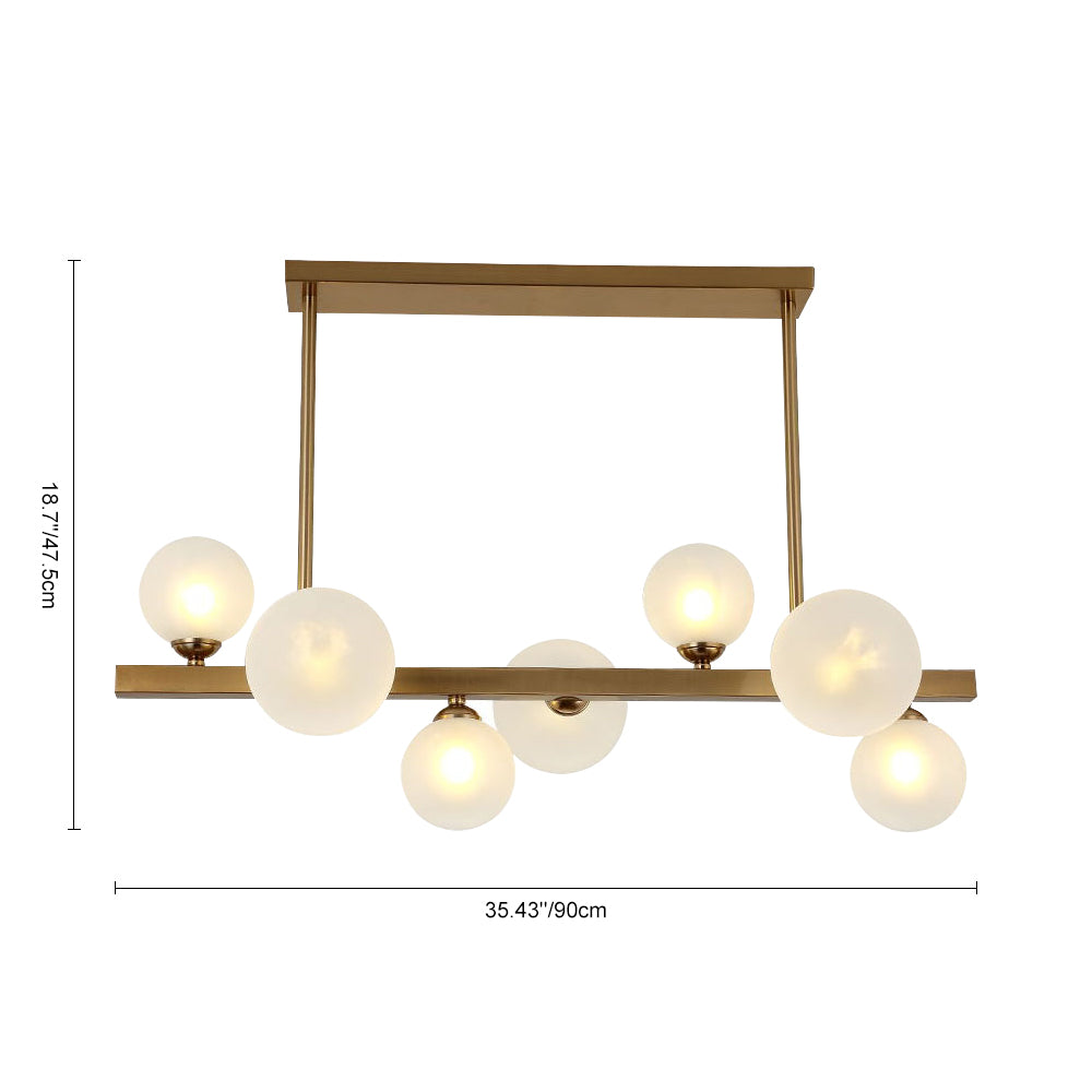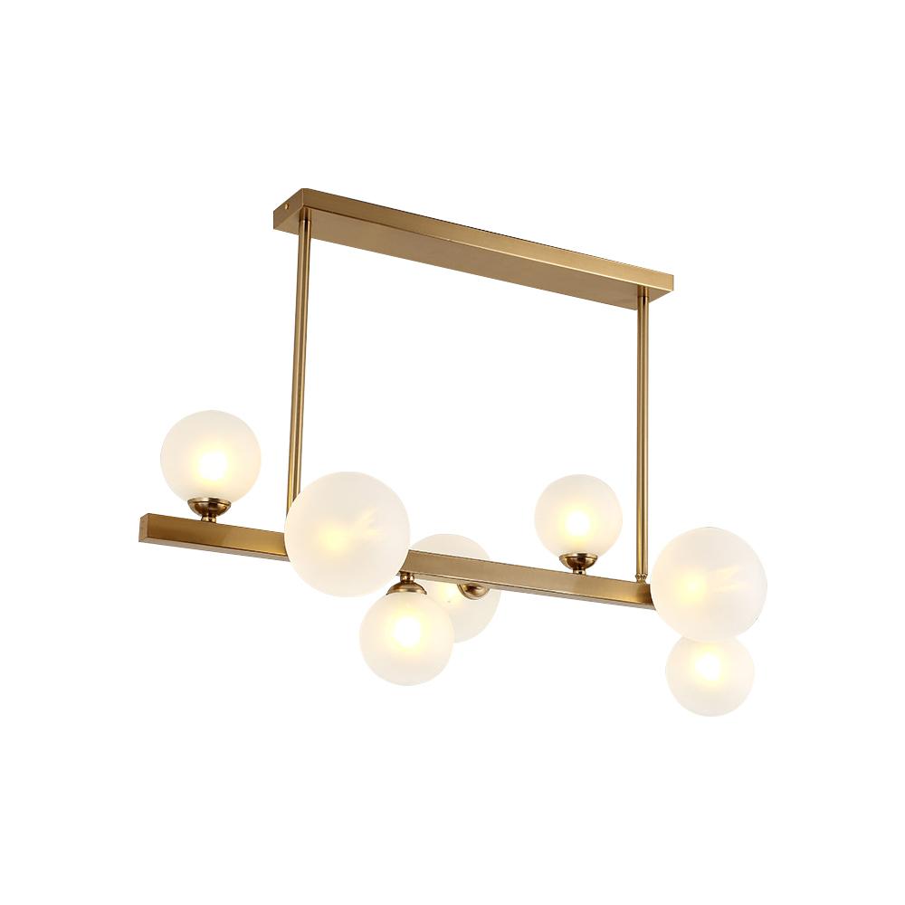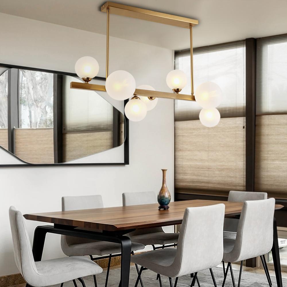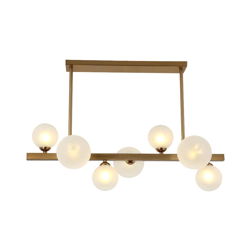 Tuo taiteellista eleganssia moderniin tilaan tällä saarivalaisimilla. Tukevan suorakaiteen muotoisen katoksen ja kahden kestävän pylvään varassa tässä lasipallon lineaarisessa kattokruunussa on seitsemän pallomaista sävyä, jotka on ryhmitelty neliömäisen kehyksen ympärille. Messinkiviimeistely lisää klassista ylellistä tunnelmaa. Tämä messinkinen lineaarinen kattokruunu, johon mahtuu seitsemän 5W G9-polttimoa, luo kodikkaan ja lämpimän valaistuksen sisustukseesi. Tämä messinkisaarekelasipallomainen lineaarinen kattokruunu tuo upeaa hienostuneisuutta avoimiin tiloihin, varsinkin kun se sijoitetaan keskeisten tilojen, kuten ruokapöytien, keittiösaarten, baarien ja muiden päälle.