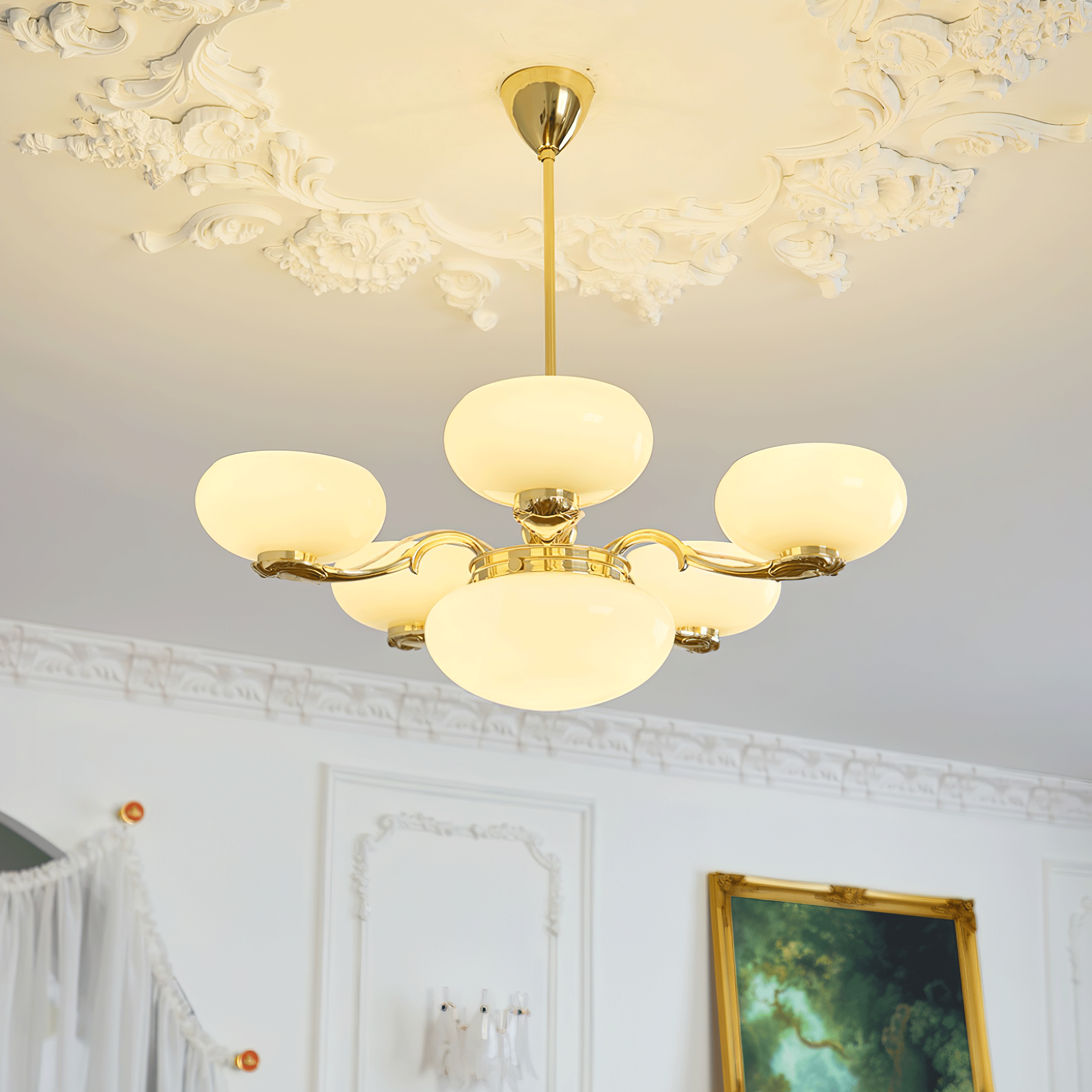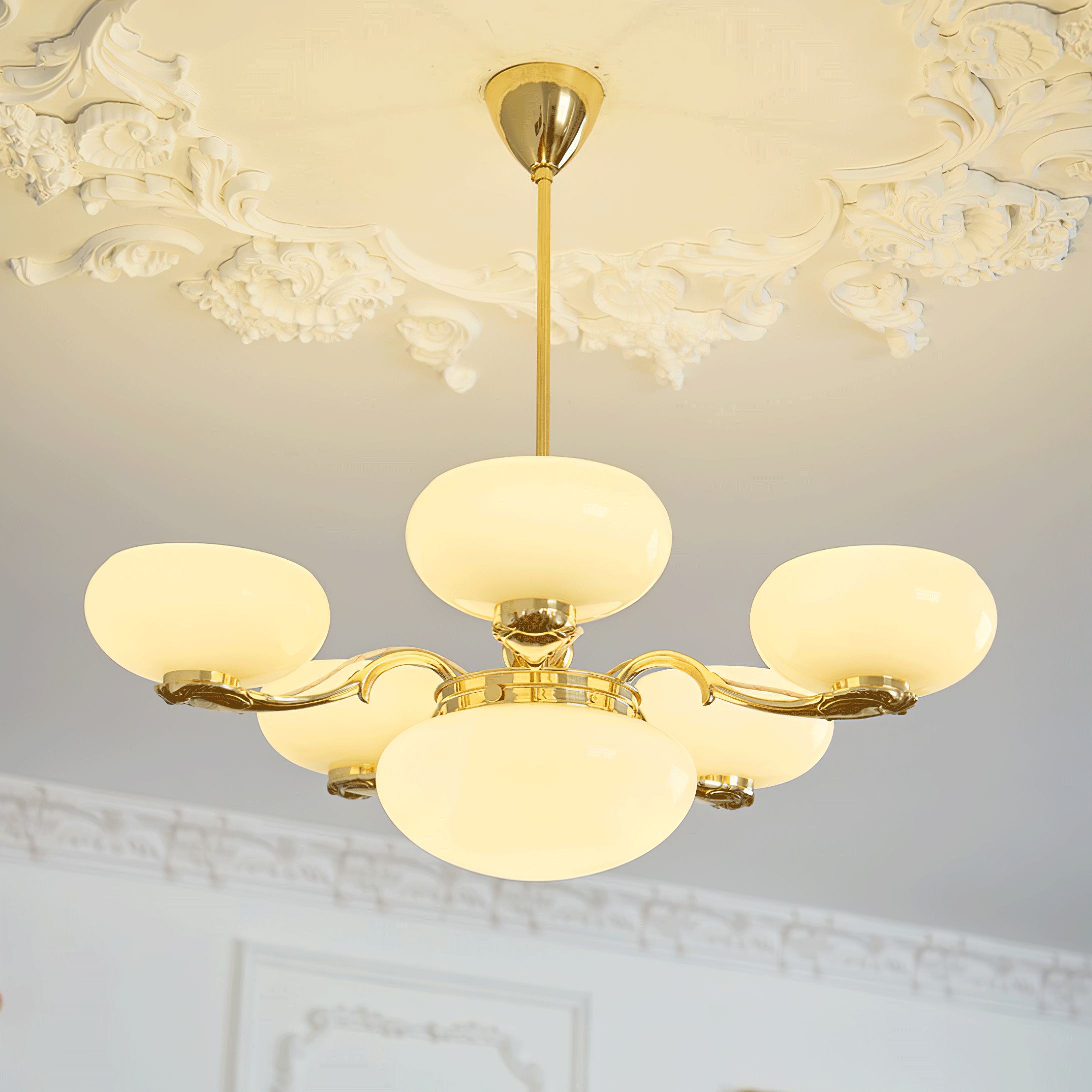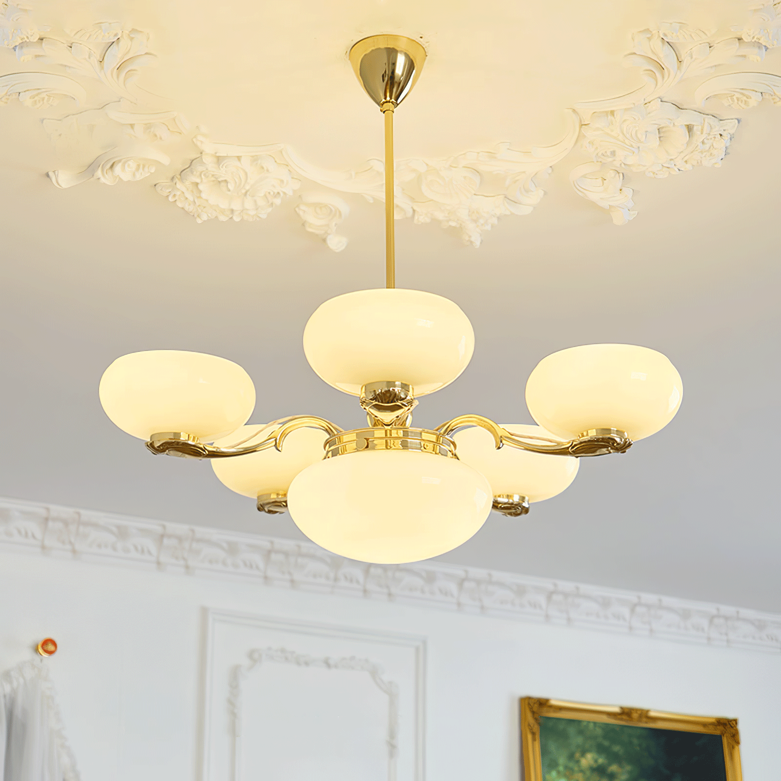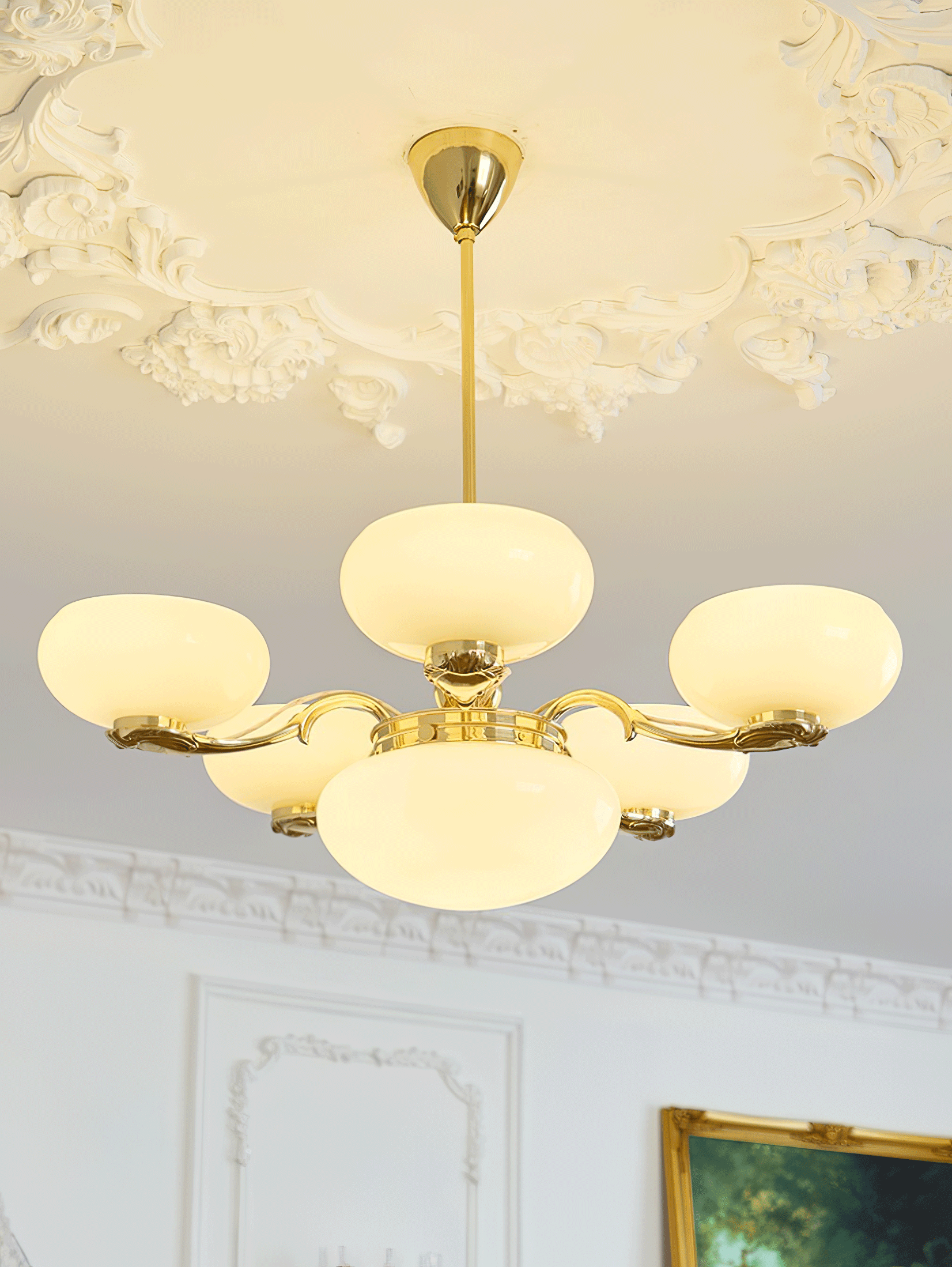 Brass Radiance Orb -kattokruunu, joka on suunniteltu yhdistämällä hienosti klassista messingistä charmia ja modernia muotoilua, on valmistettu korkealaatuisesta messingistä eleganssin ja kestävyyden takaamiseksi. Silmäänpistävä muotoilu sisältää viisi beigeä lasisävyä, jotka muodostavat yhtenäisen ja tasapainoisen kokonaisuuden. Beigen lämmin ja hajavalo luo kodikkaan ja elegantin tunnelman. Tyylikkäästi ripustettu Orb Chandelier erottuu harmonisesti missä tahansa huoneessa. Täydellinen niille, jotka arvostavat perinteisten materiaalien ja nykyaikaisen estetiikan yhdistelmää, messinki- ja beige-lasikruunu on enemmän kuin valonlähde; se on esitys hienosta mausta, joka huokuu lämpöä ja tyyneyttä.