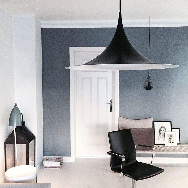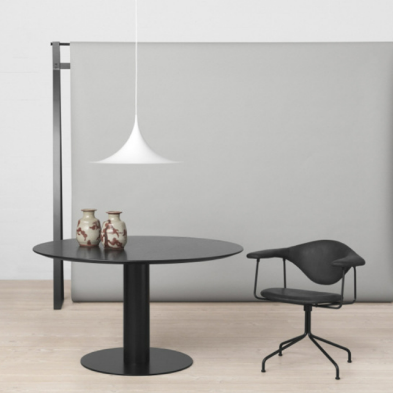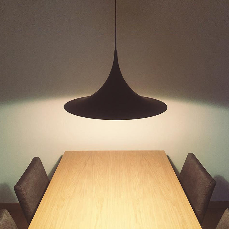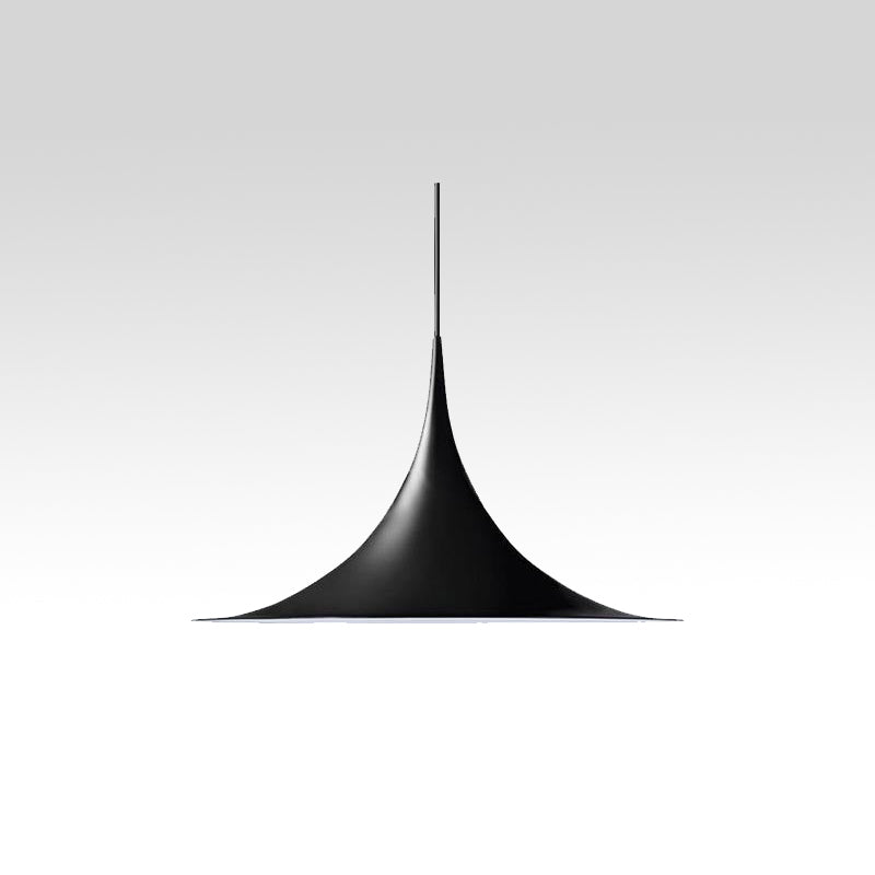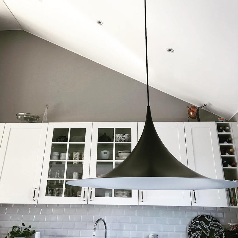 Tämä ainutlaatuinen riippuvalaisin perustuu kahteen neljäsosaympyrään, jotka on yhdistetty toisiinsa, selkä vastakkain. Erottuvan kaarevan muotoisen emaloidun metallivarjostimen, keveyden ja ainutlaatuisen, ajattoman muotoilunsa ansiosta se sopii ihanteellisesti ruokapöydän tai keittiön työtason päälle.