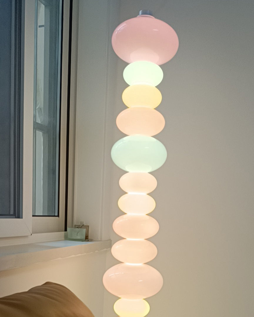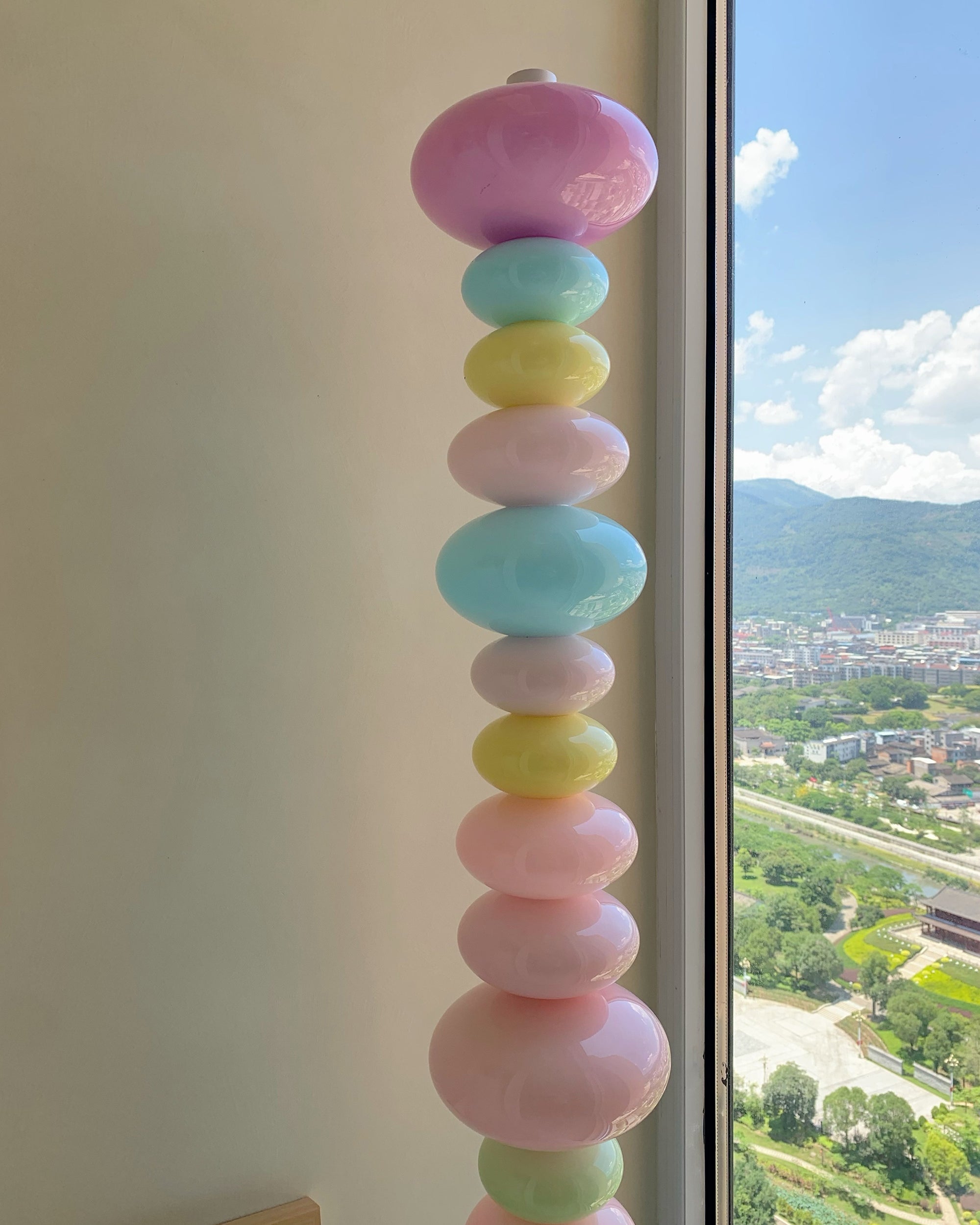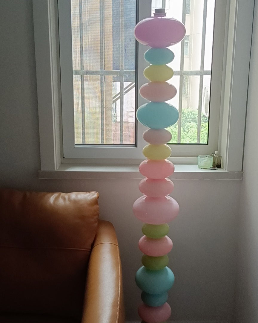 Värikas ja kaunis karkkilattiavalaisin, siinä on pyöreä ja herkkä lasi ja koko on taitavasti yhdistetty kauniiksi ja jatkuvaksi linjatyöksi, joka on yksinkertaisesti kaunista!
