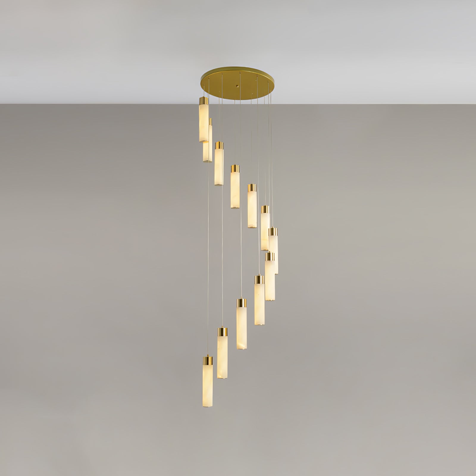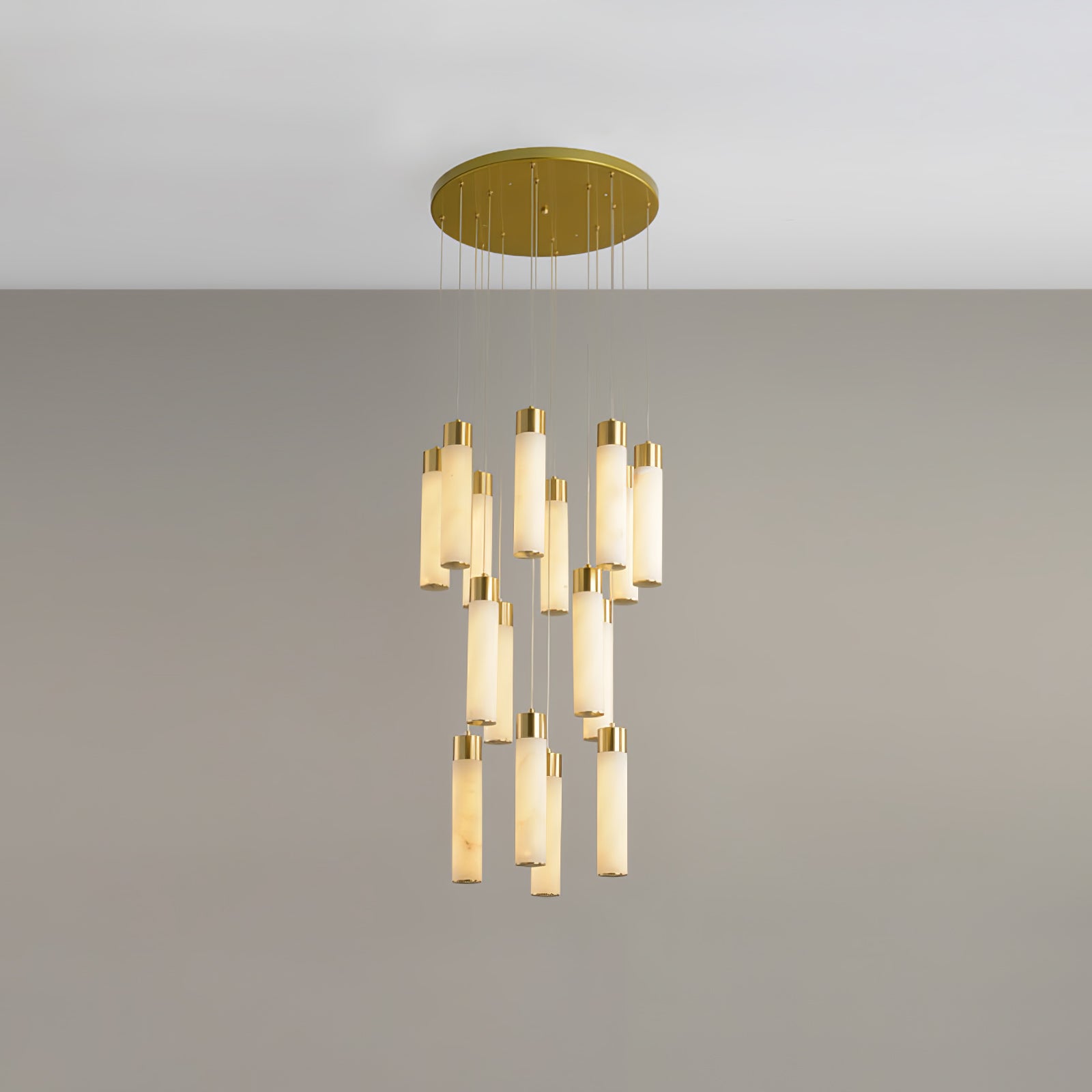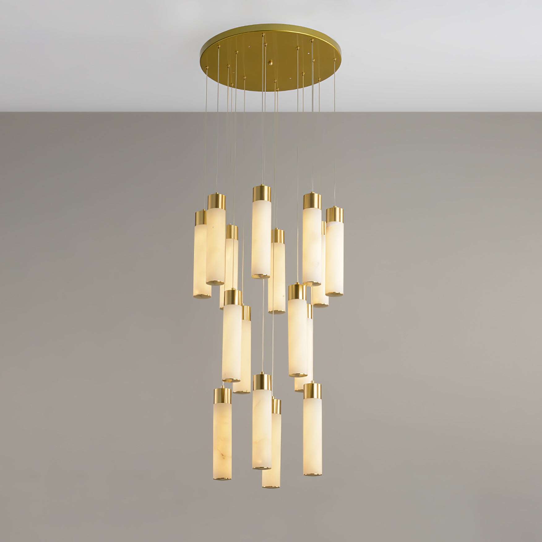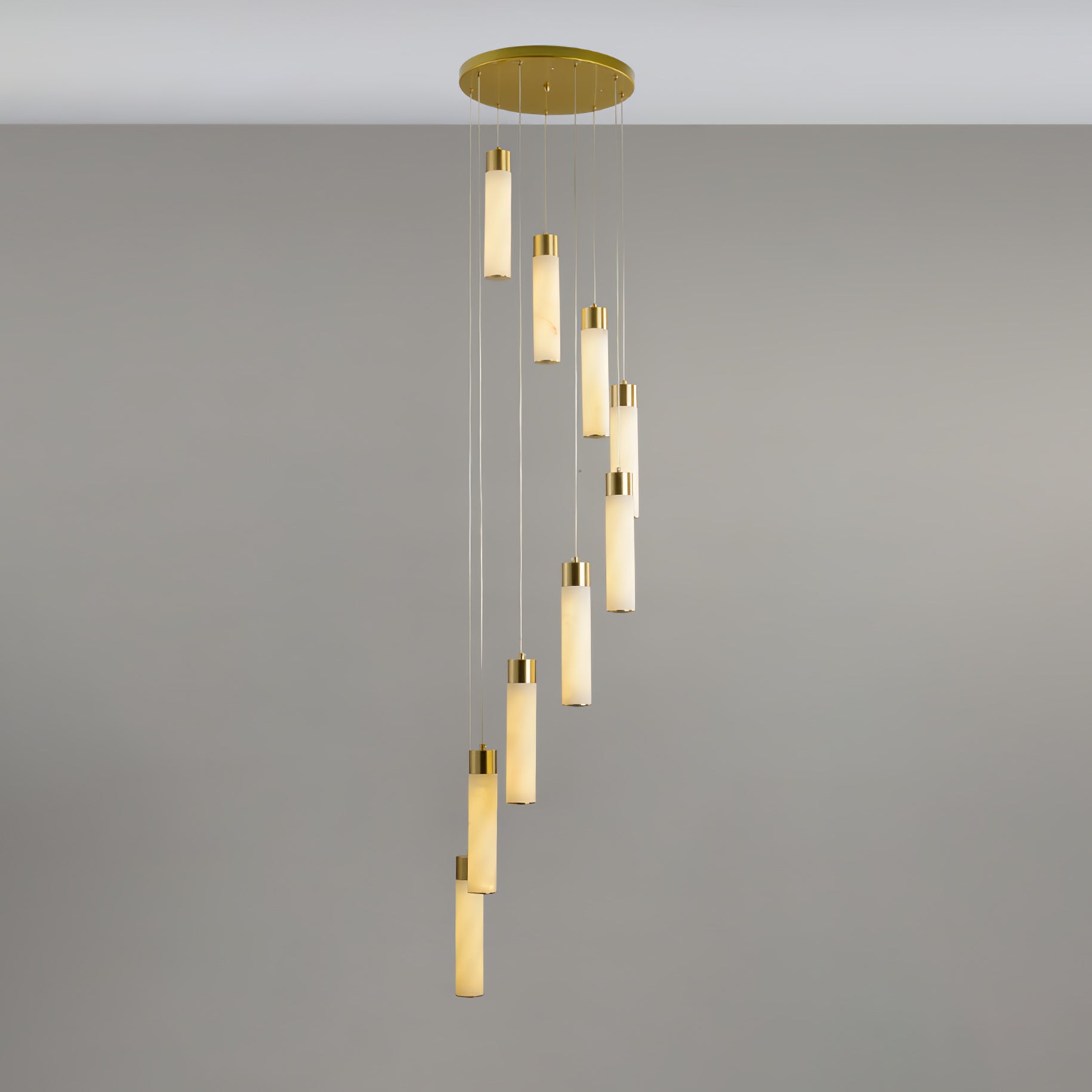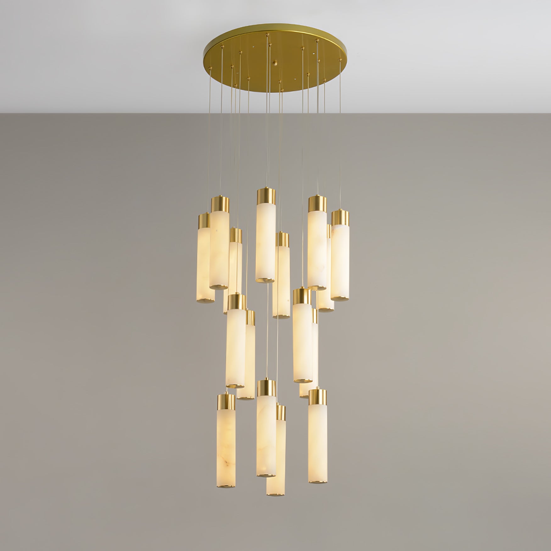 The Celestial Alabaster Cascade Chandelier on valon, muodon ja hienojen materiaalien sinfonia, joka on suunniteltu lisäämään hienostuneisuutta mihin tahansa tilaan. Tässä kattokruunussa on joukko sylinterimäisiä alabasterisävyjä, jotka on ripustettu eri korkeuksille, joista jokainen säteilee pehmeää, luonnollista hehkua, joka korostaa kiven ainutlaatuista suonistoa ja läpikuultavaa laatua.