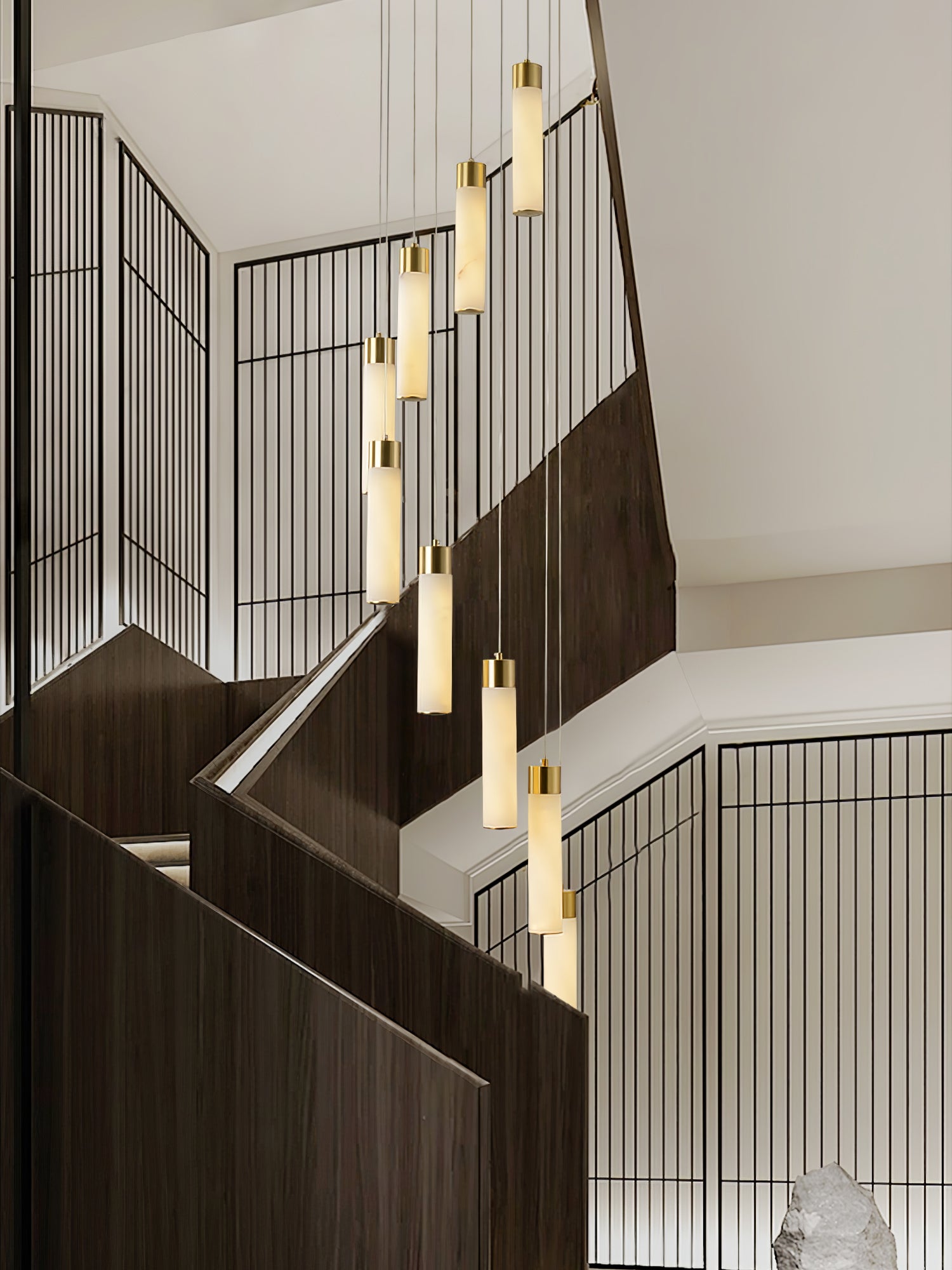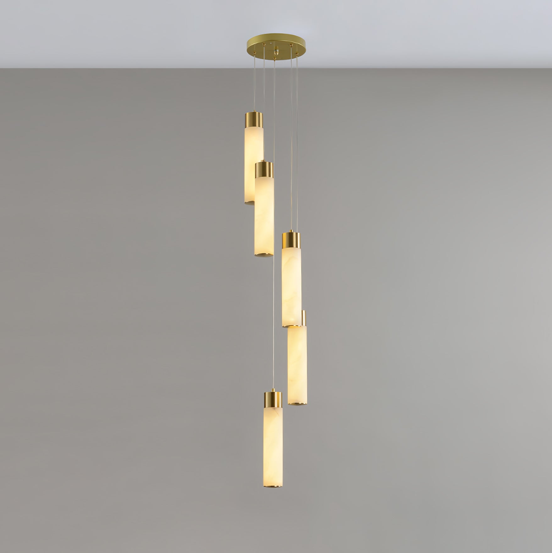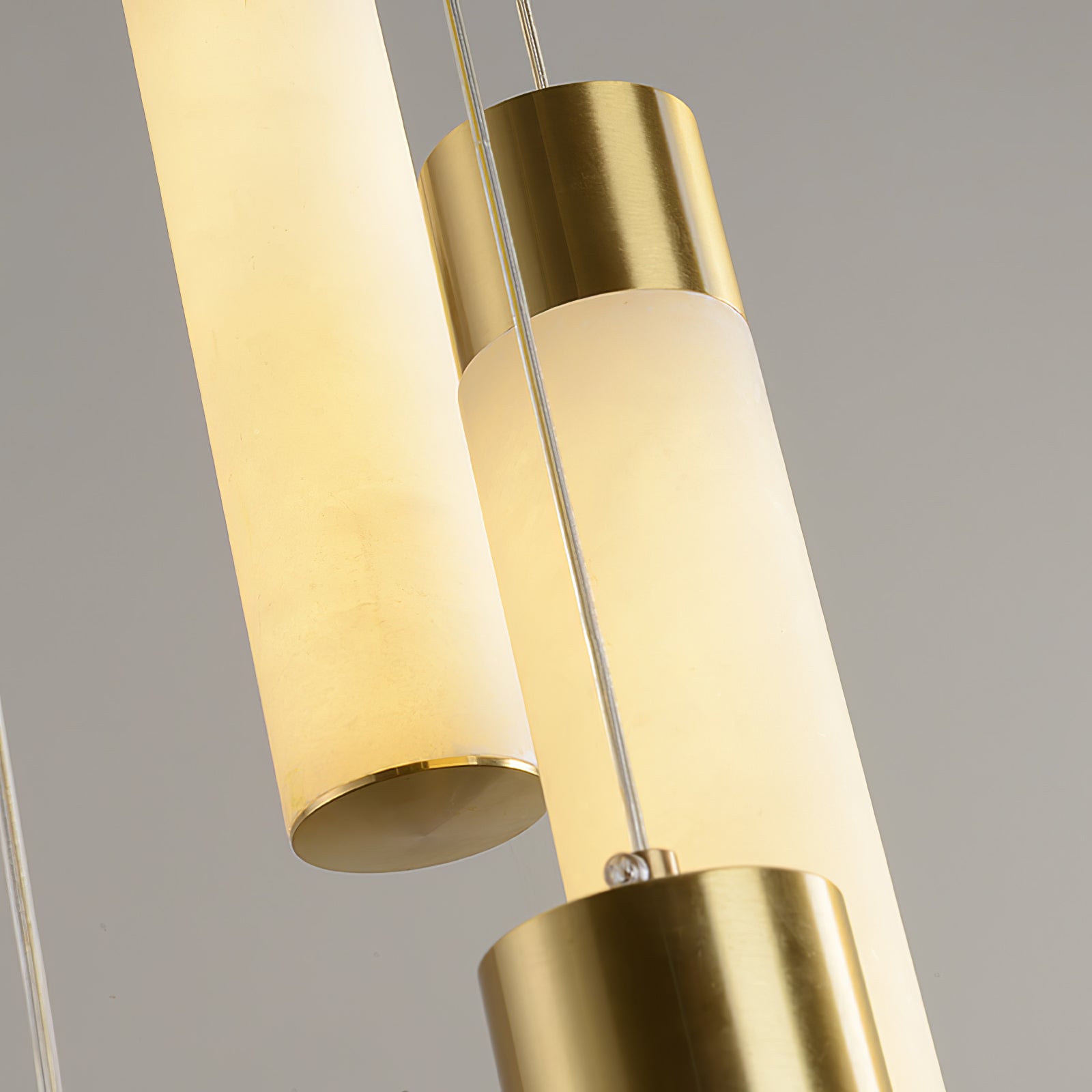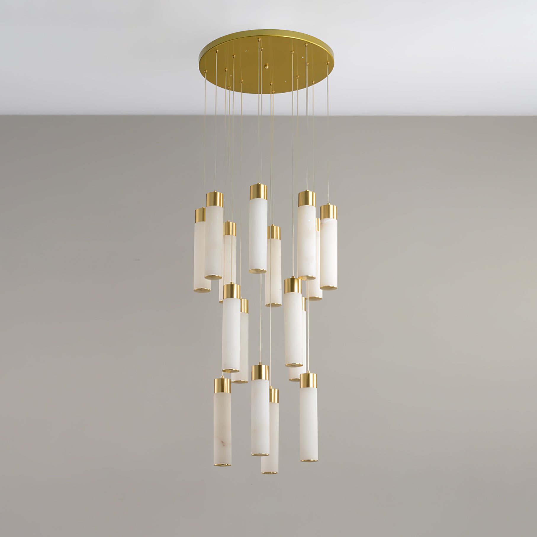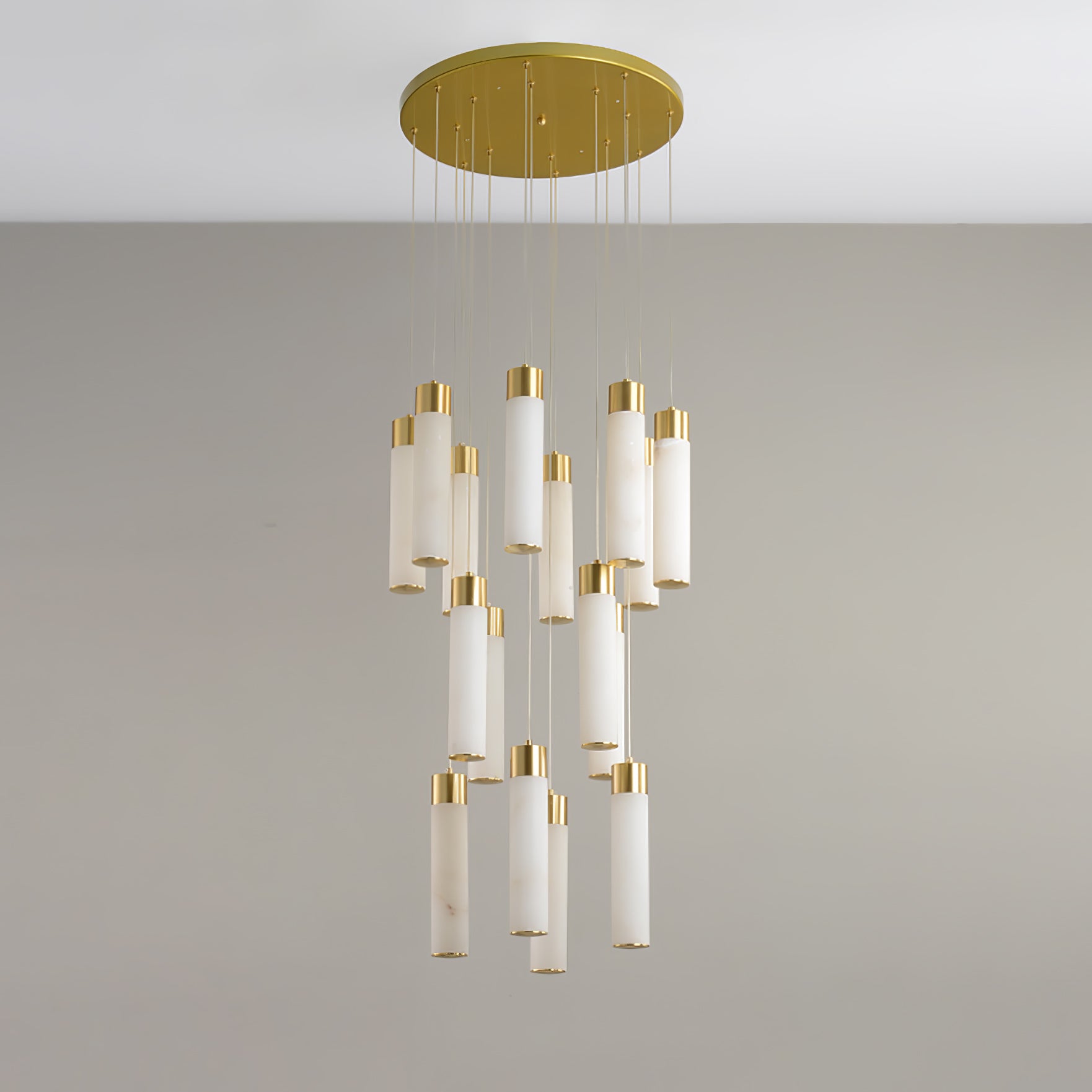 The Celestial Alabaster Cascade Chandelier on valon, muodon ja hienojen materiaalien sinfonia, joka on suunniteltu lisäämään hienostuneisuutta mihin tahansa tilaan. Tässä kattokruunussa on joukko sylinterimäisiä alabasterisävyjä, jotka on ripustettu eri korkeuksille, joista jokainen säteilee pehmeää, luonnollista hehkua, joka korostaa kiven ainutlaatuista suonistoa ja läpikuultavaa laatua.