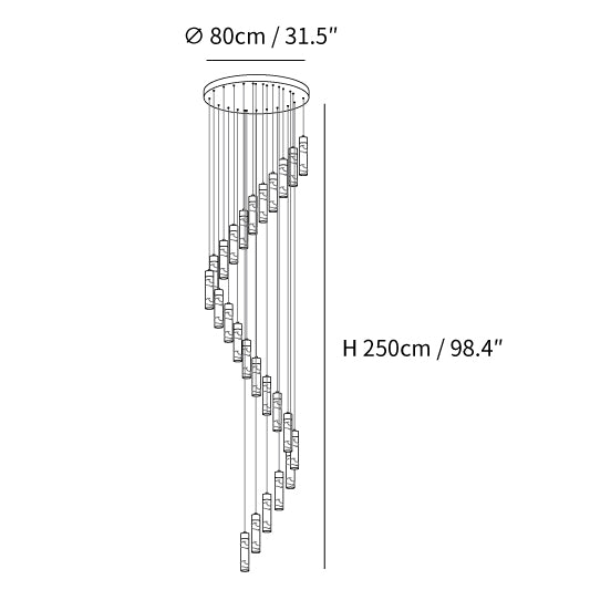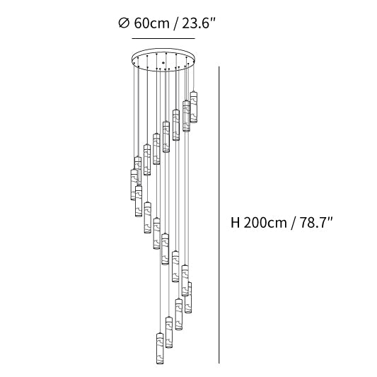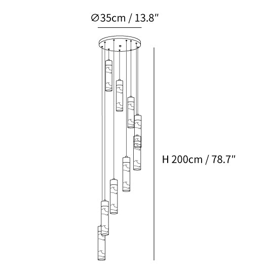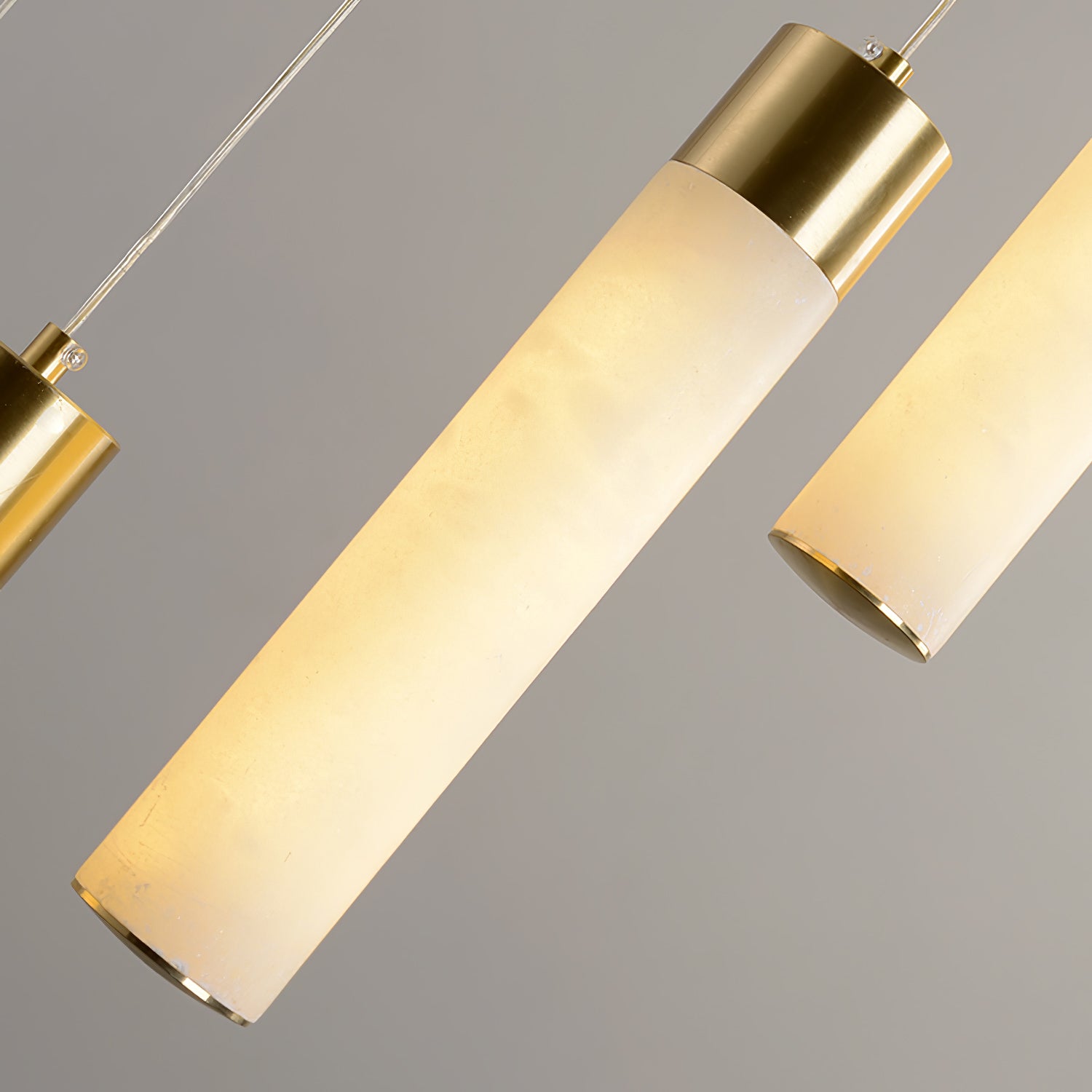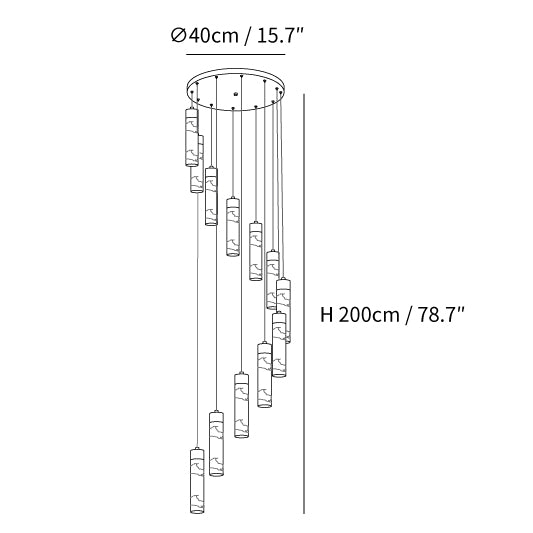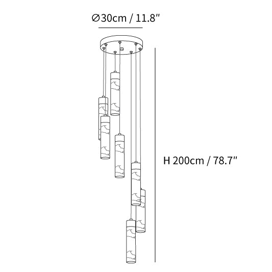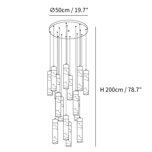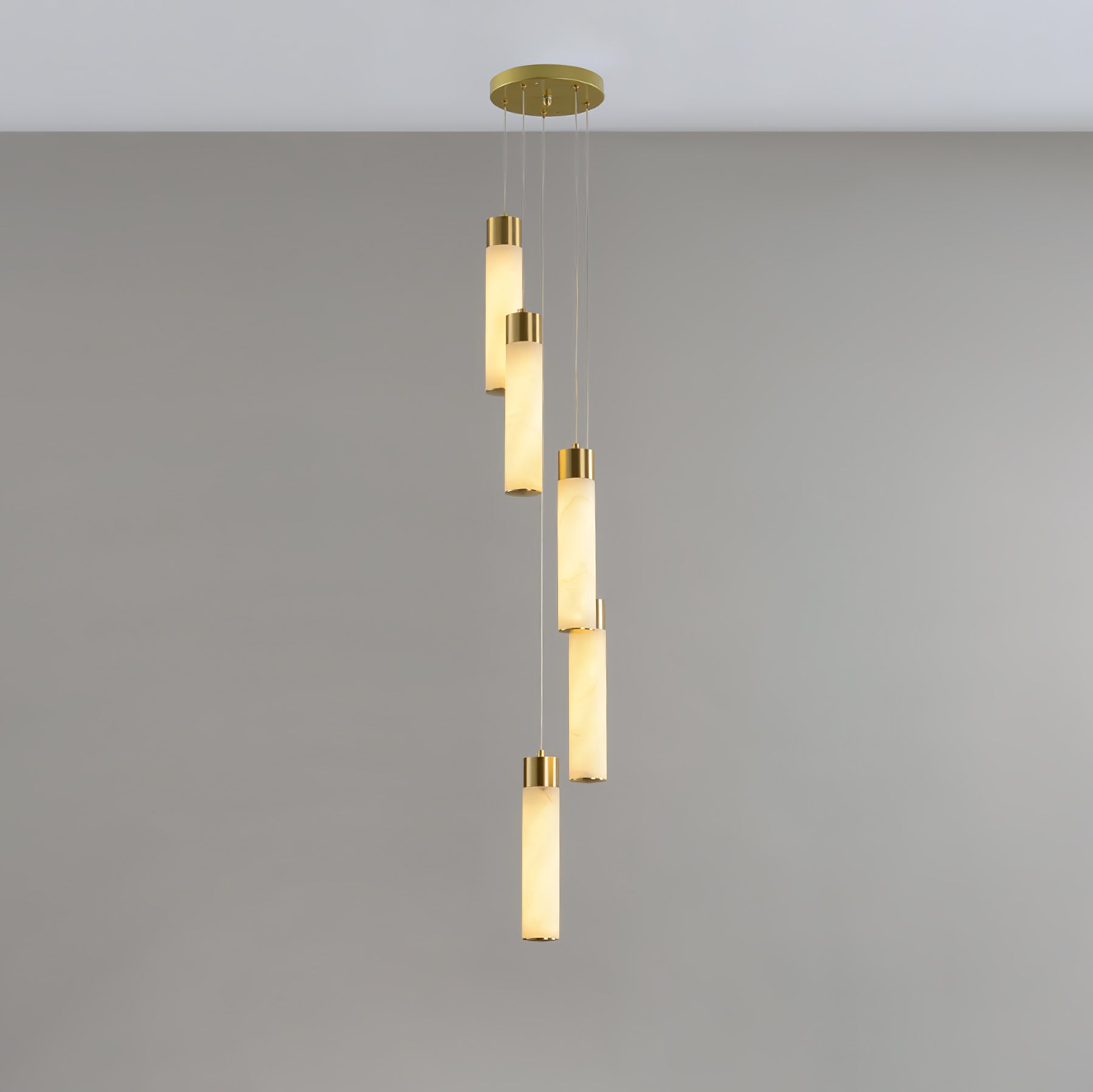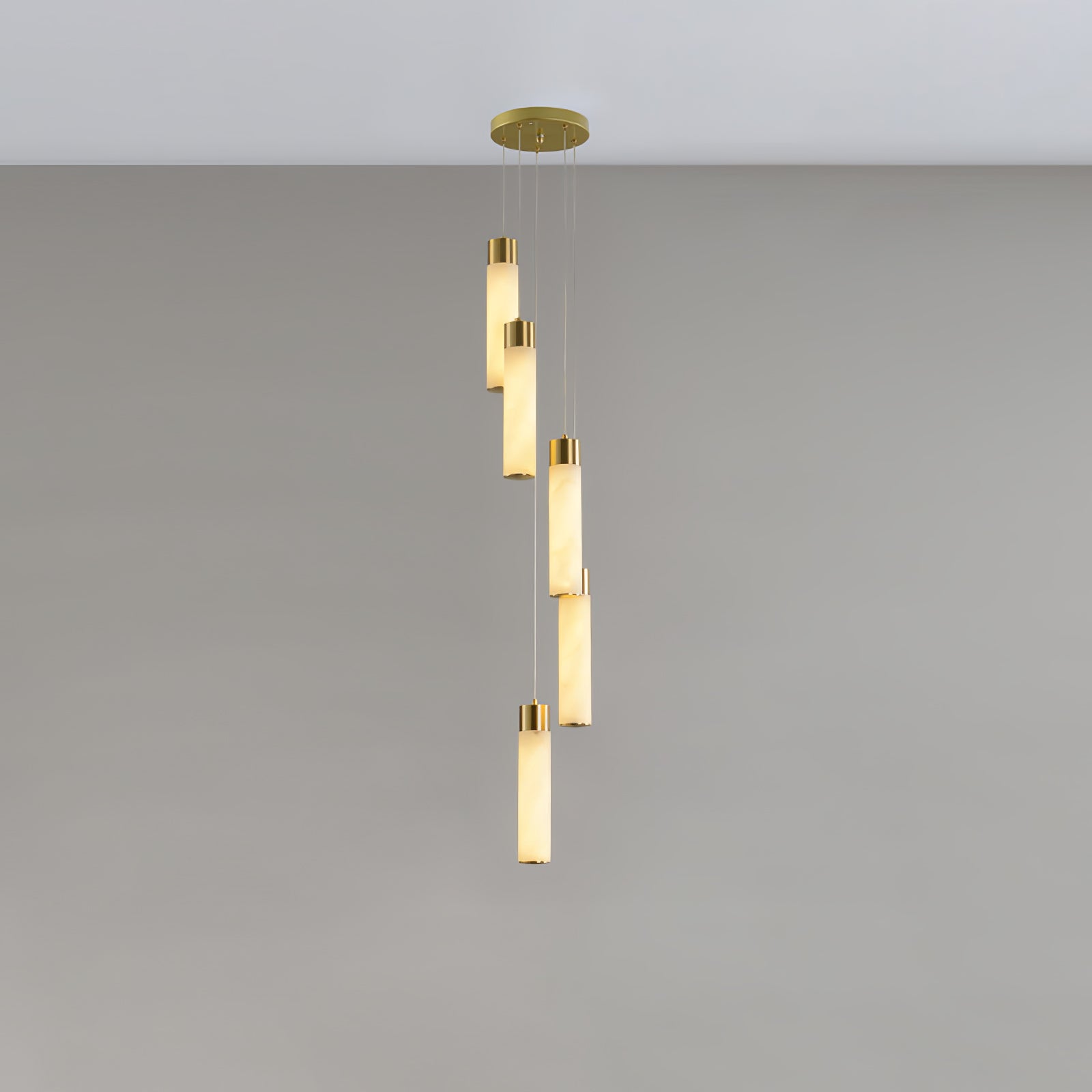 The Celestial Alabaster Cascade Chandelier on valon, muodon ja hienojen materiaalien sinfonia, joka on suunniteltu lisäämään hienostuneisuutta mihin tahansa tilaan. Tässä kattokruunussa on joukko sylinterimäisiä alabasterisävyjä, jotka on ripustettu eri korkeuksille, joista jokainen säteilee pehmeää, luonnollista hehkua, joka korostaa kiven ainutlaatuista suonistoa ja läpikuultavaa laatua.