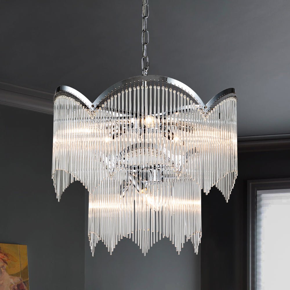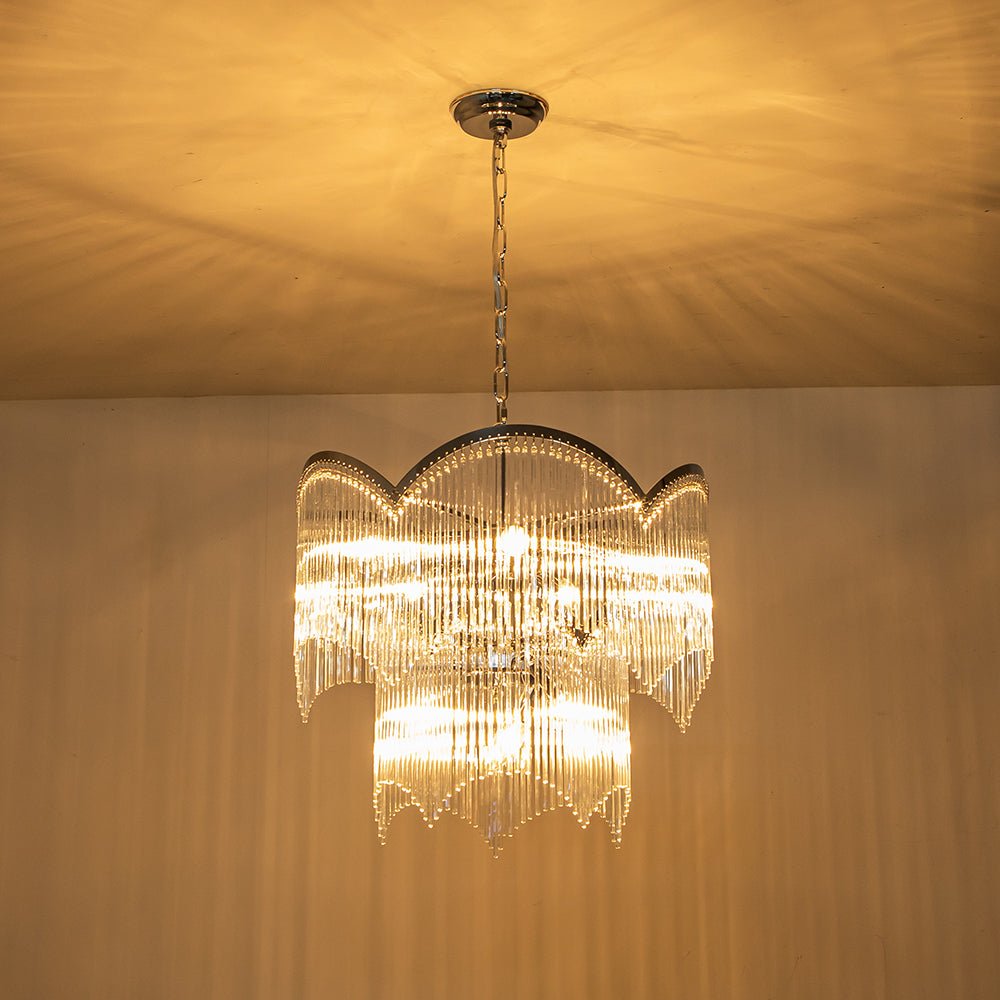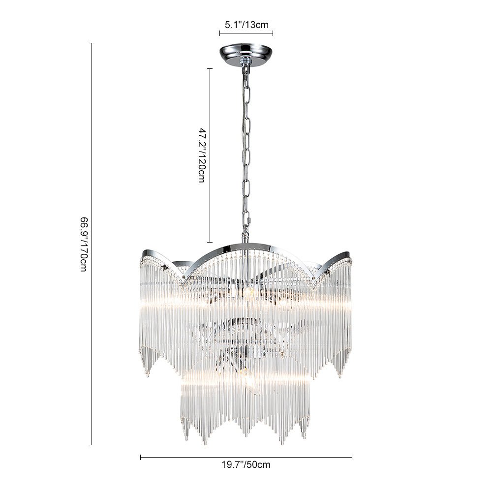 Kauniisti yksityiskohtainen ja hieno, tämä 8 valon kristalliriippuvalaisin on upea lisä moderniin tilaan. Upeat sirot kristallitangot luovat 2-kerroksisen vesiverhon kaltaisen ilmeen, joka on täynnä dynaamista eleganssia ja hienostunutta estetiikkaa. Kiillotettu kromiviimeistely korostaa tämän tupsukristallikruunun kimaltelevaa kosketusta. Tee häikäisevän ylellinen ensivaikutelma ruokasalissa, olohuoneessa, makuuhuoneessa tai eteisessä tällä kromilla 2-kerroksisella kristallikruunulla.Tiedot