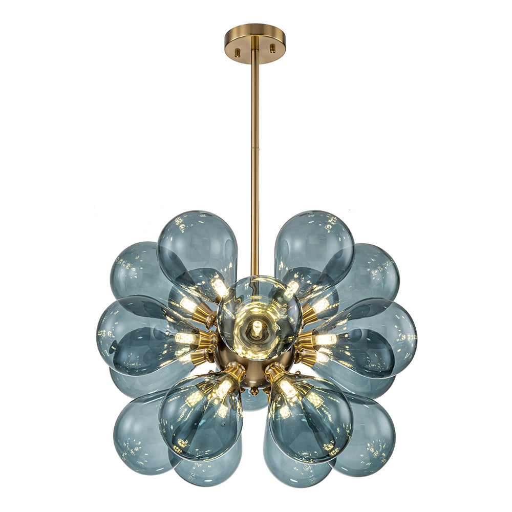 Ulkoasultaan hupaisa ja fantasia, sininen kuplakruunumme on ilmeikäs kotisi sisustukseen. Kultainen sputnik-tyyppinen keskus toimii kuplakoneena puhaltaen ulos 18 läpinäkyvää sinistä kuplaa valokannoista. Tämä G9-polttimoiden (ei sisälly toimitukseen) mahtuva maapallokruunu valaisee upeaa tunnelmaa, kun se kytketään päälle. Voit myös käyttää himmennettäviä lamppuja ja himmentimen kytkintä valaistuksen säätämiseen. Suosittelemme ripustamaan tämän lasikuplakattokruunun tyylikkääksi olohuoneeseen, ruokailutilaan, eteiseen, eteiseen tai aulaan.Detail