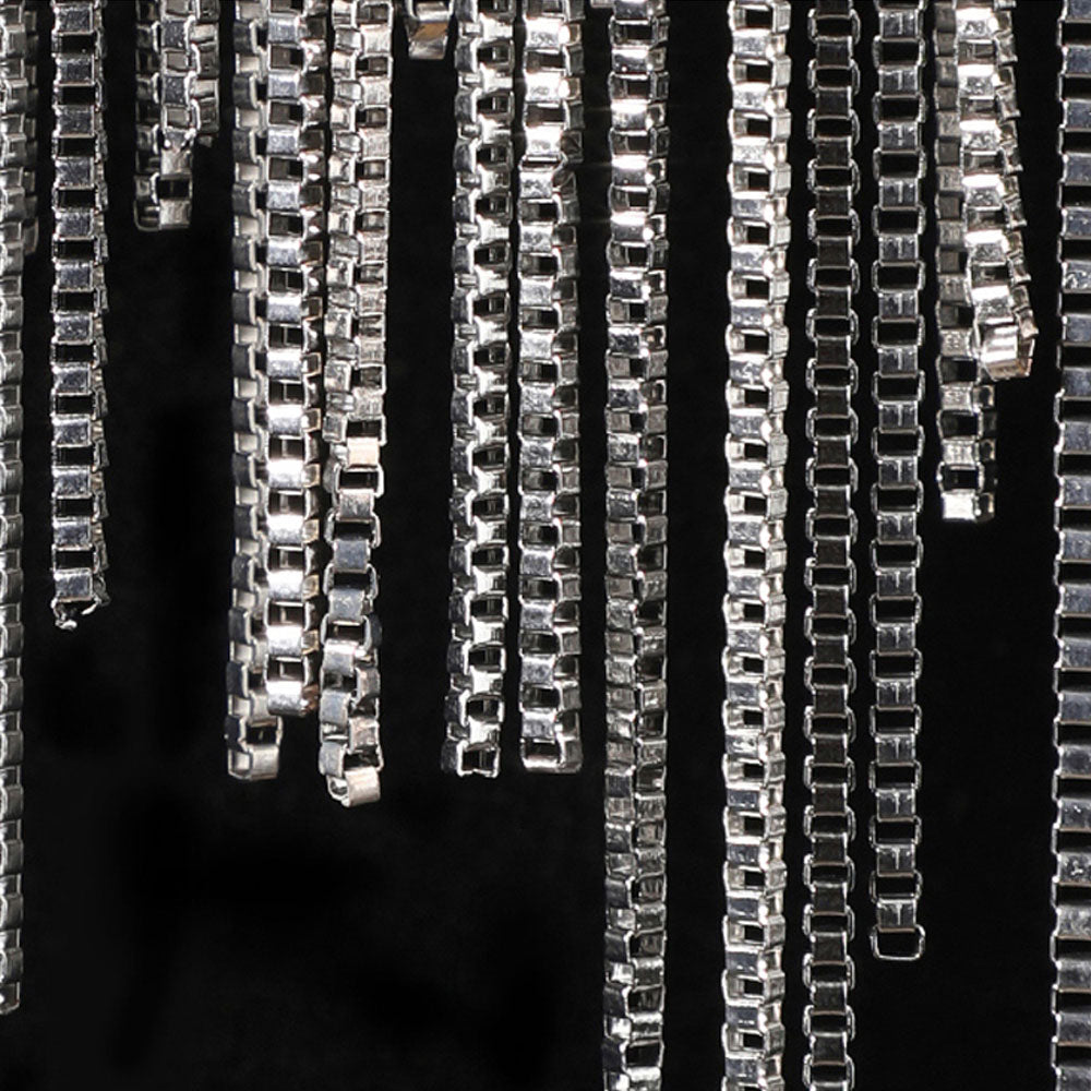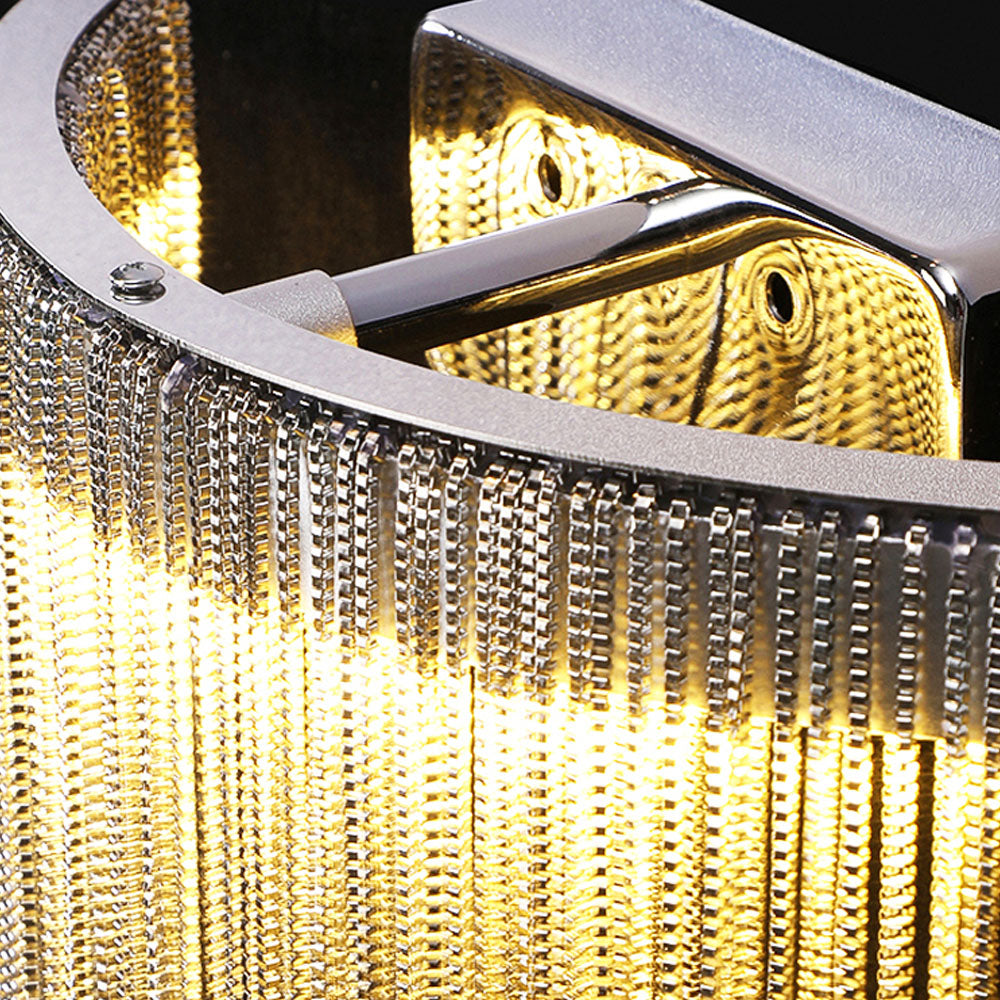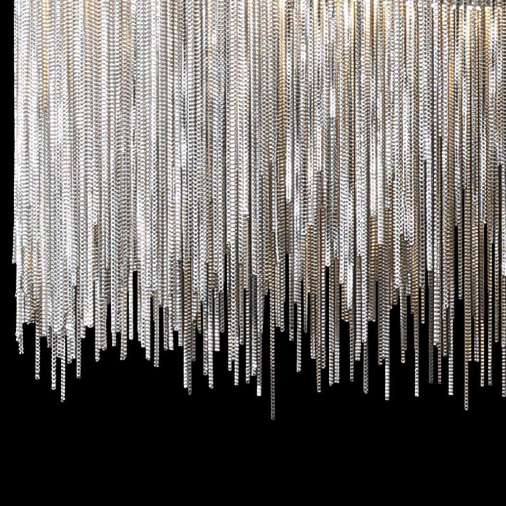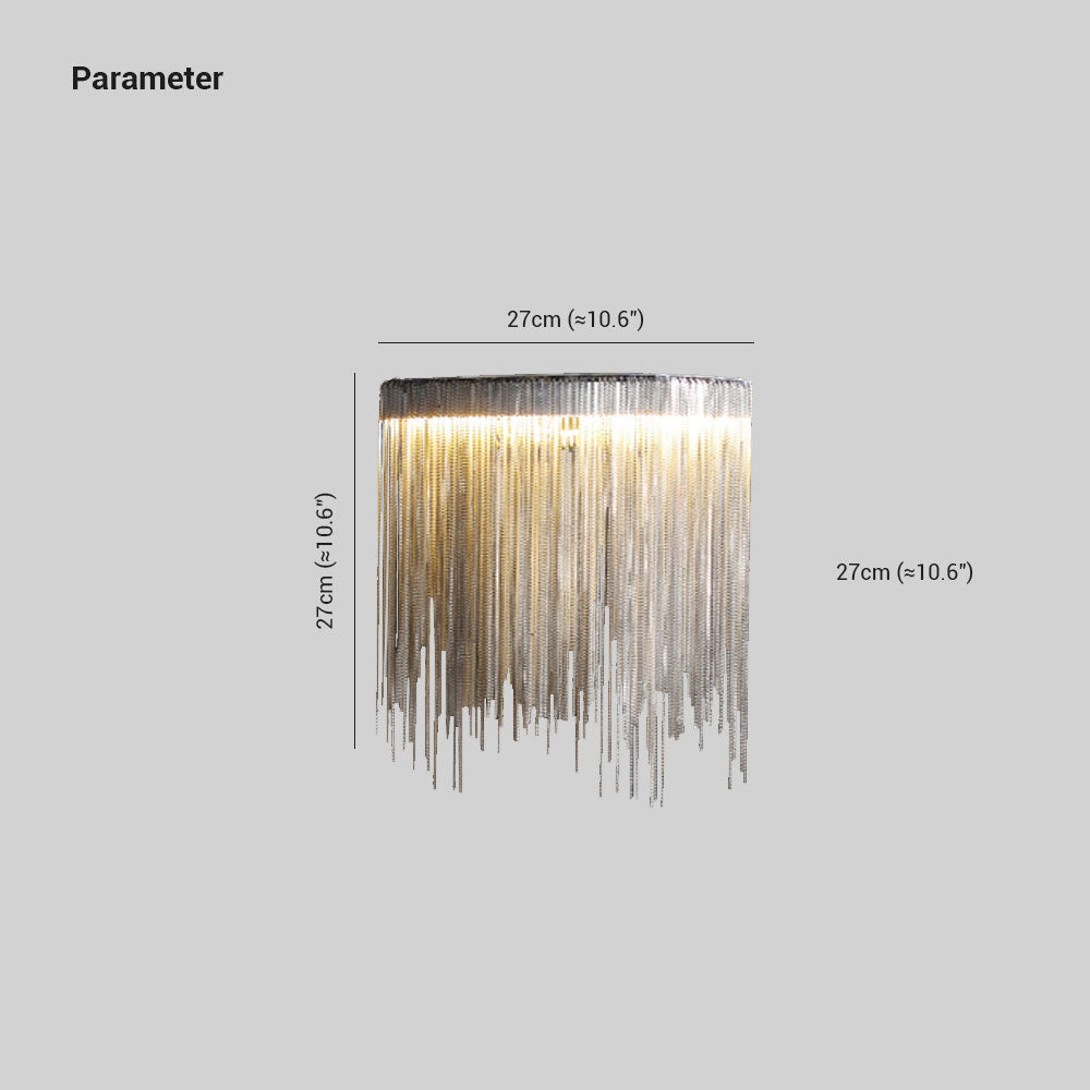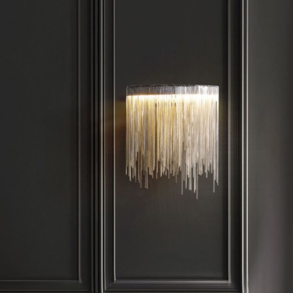 - Tämä seinävalaisin koostuu lukemattomista hopeaketjuista, joiden pituus vaihtelee, kuten tupsu, tämä käsittely neutraloi metallin raskaan tunteen ja näyttää kevyemmältä ja dynaamisemmalta.