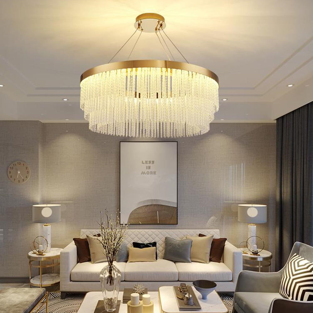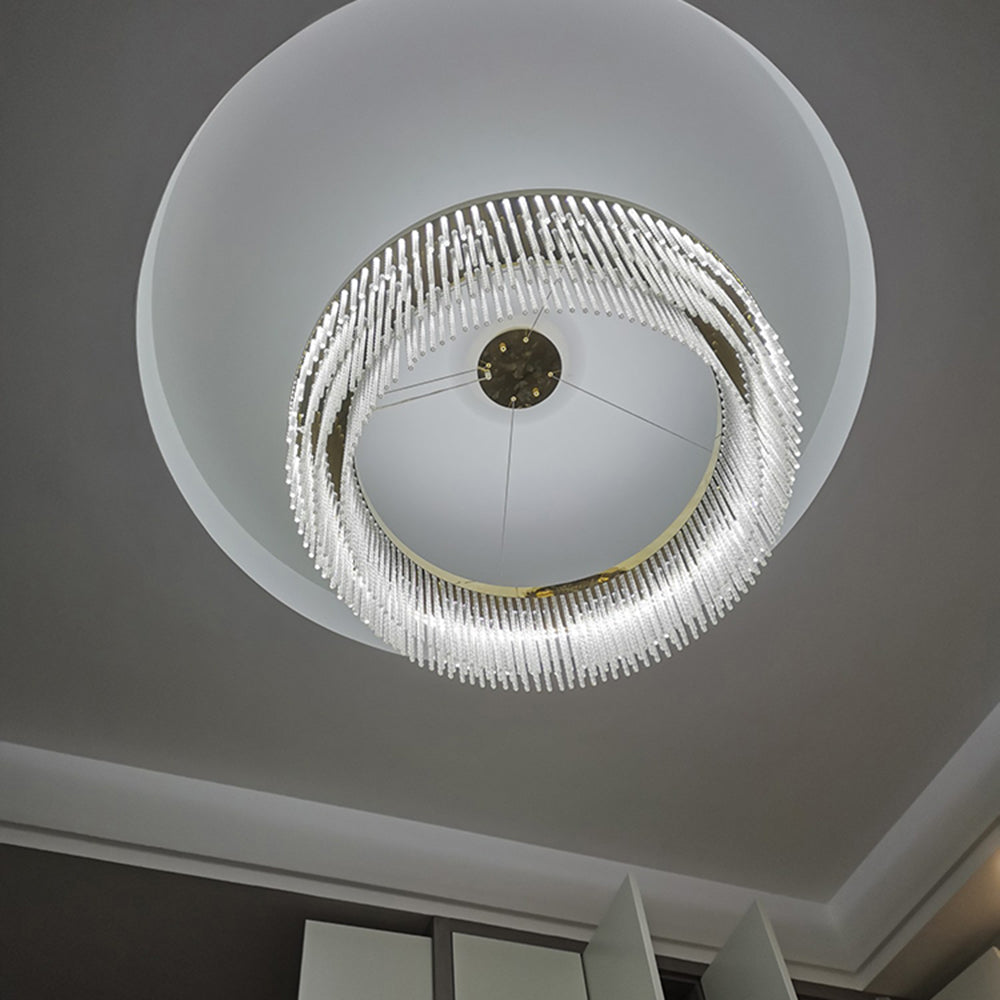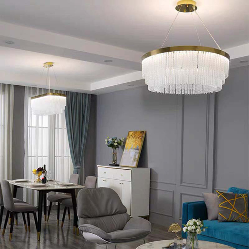 - Riippuvalaisimessa on rengasmuotoilu, joka on yhdistetty kristallitupsuihin, jotta se luo yksinkertaisen ja hienon esteettisen ilmeen, joka on täynnä designia ja tarjoaa mukavan ja tyylikkään valaistusympäristön.