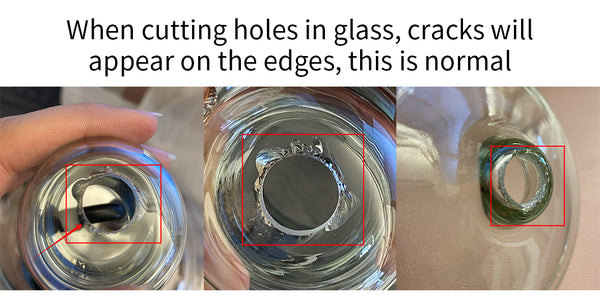 Huomautus: Lasin käsityössä on tärkeää ymmärtää, että lasin luonne tekee siitä luonnostaan hauraan. Kun lasiin leikataan reikiä, on tavallista, että reunoissa on hallitsemattomia halkeamia. On tärkeää huomata, että tämä tapahtuma ei ole merkki laatuongelmasta. Lasi, koska se on herkkä materiaali, voi joskus reagoida arvaamattomalla tavalla leikkausprosessien aikana.