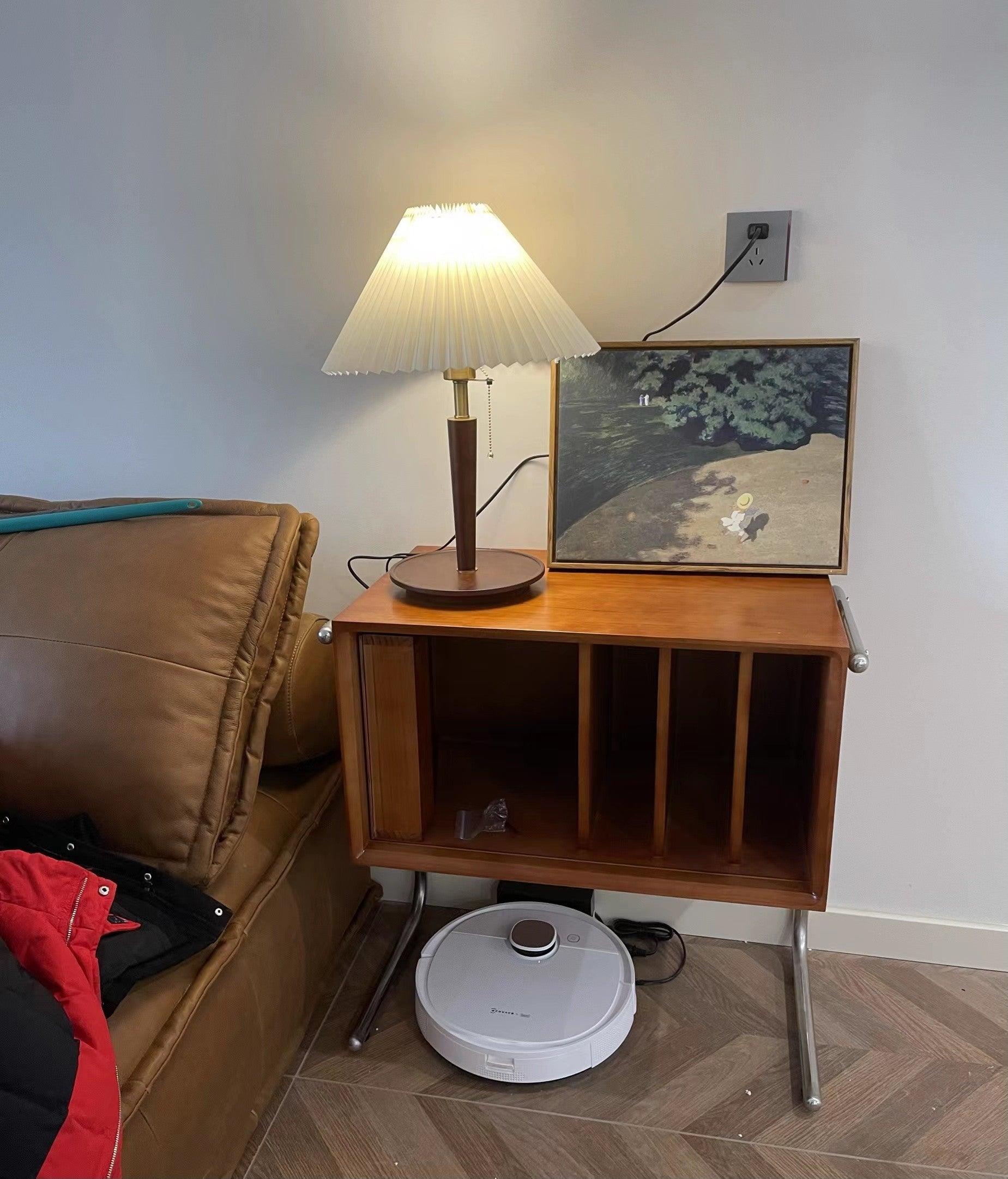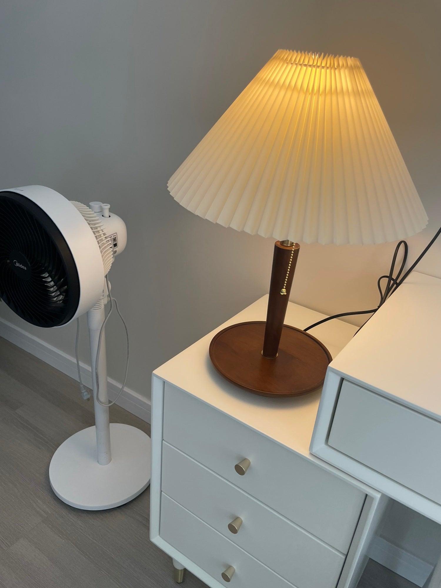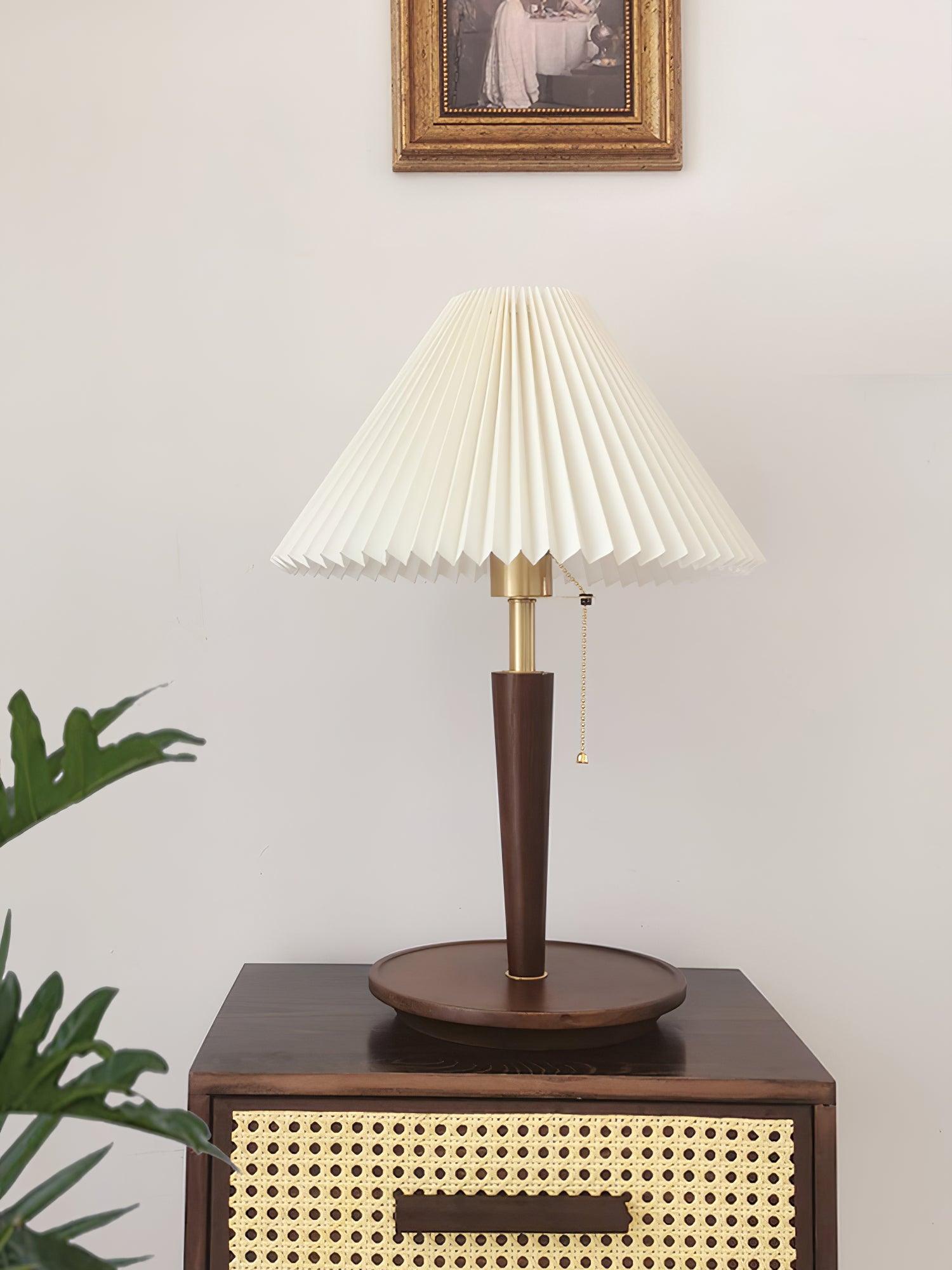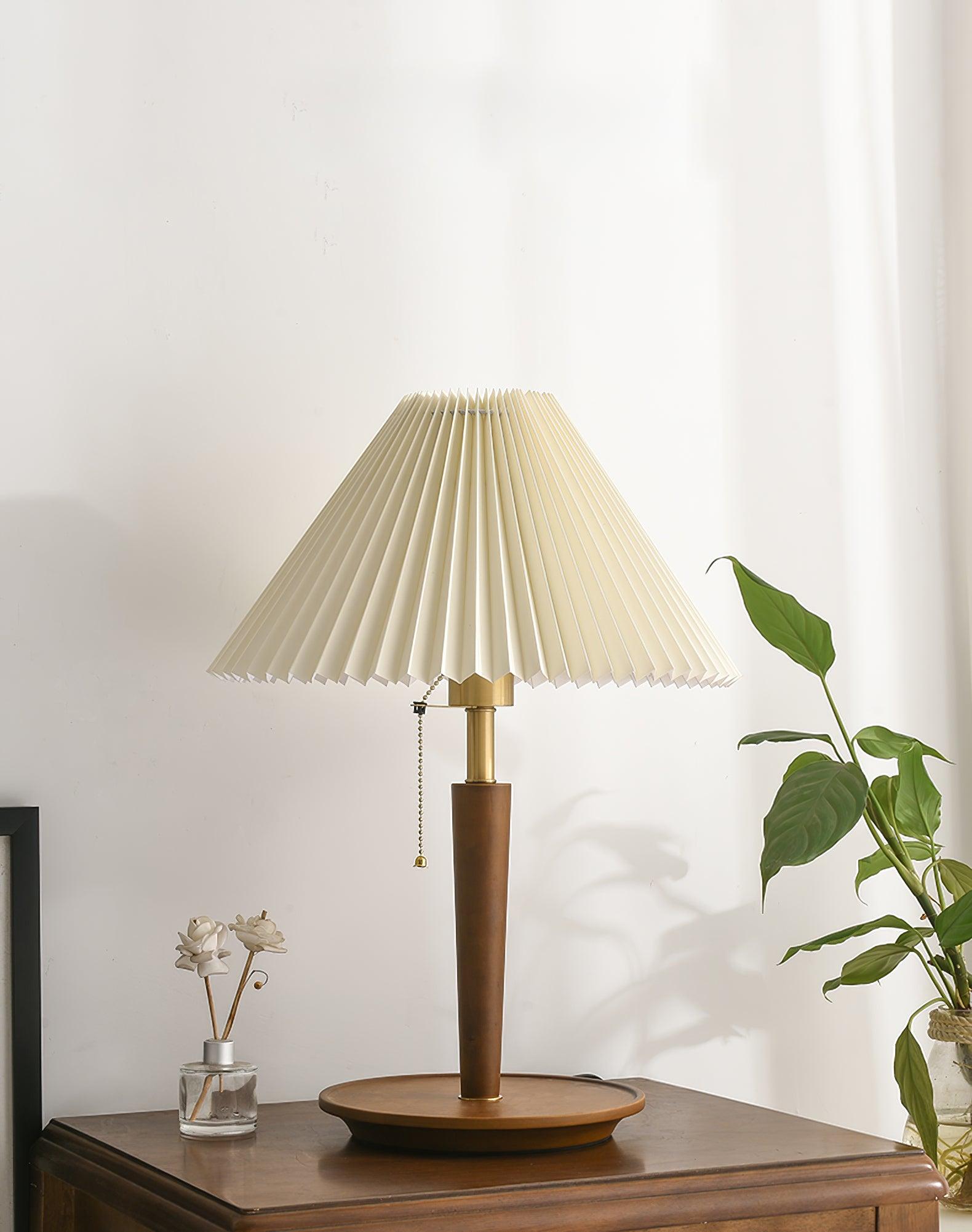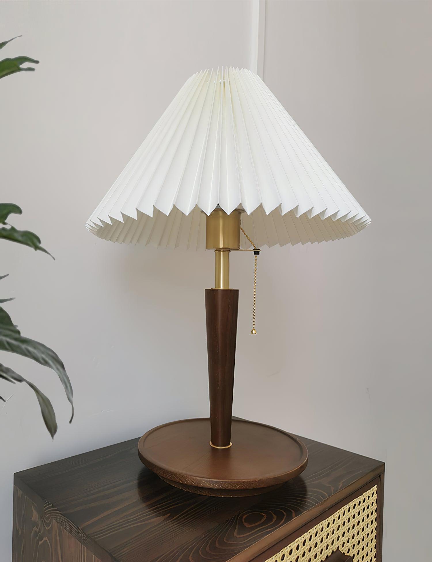 Kartiolaskostettu kangaspöytävalaisin myymäläämme. massiivipuusta valmistettu pohja, jossa on uusi valkoinen teksturoitu pellava kartiomainen varjostin. Valaisimen runko on koristeltu kultaisella messingillä. Erittäin minimalistinen estetiikka.