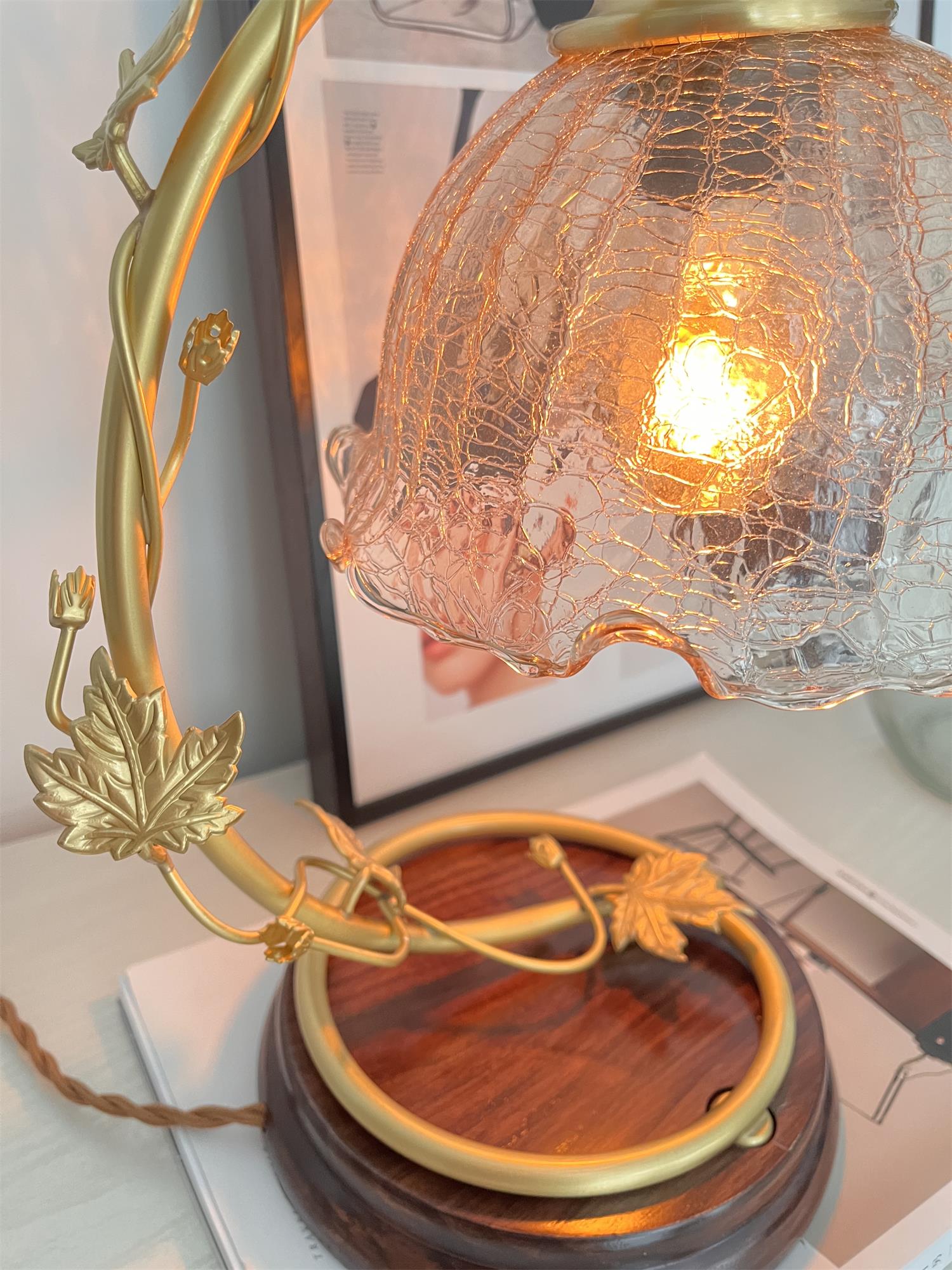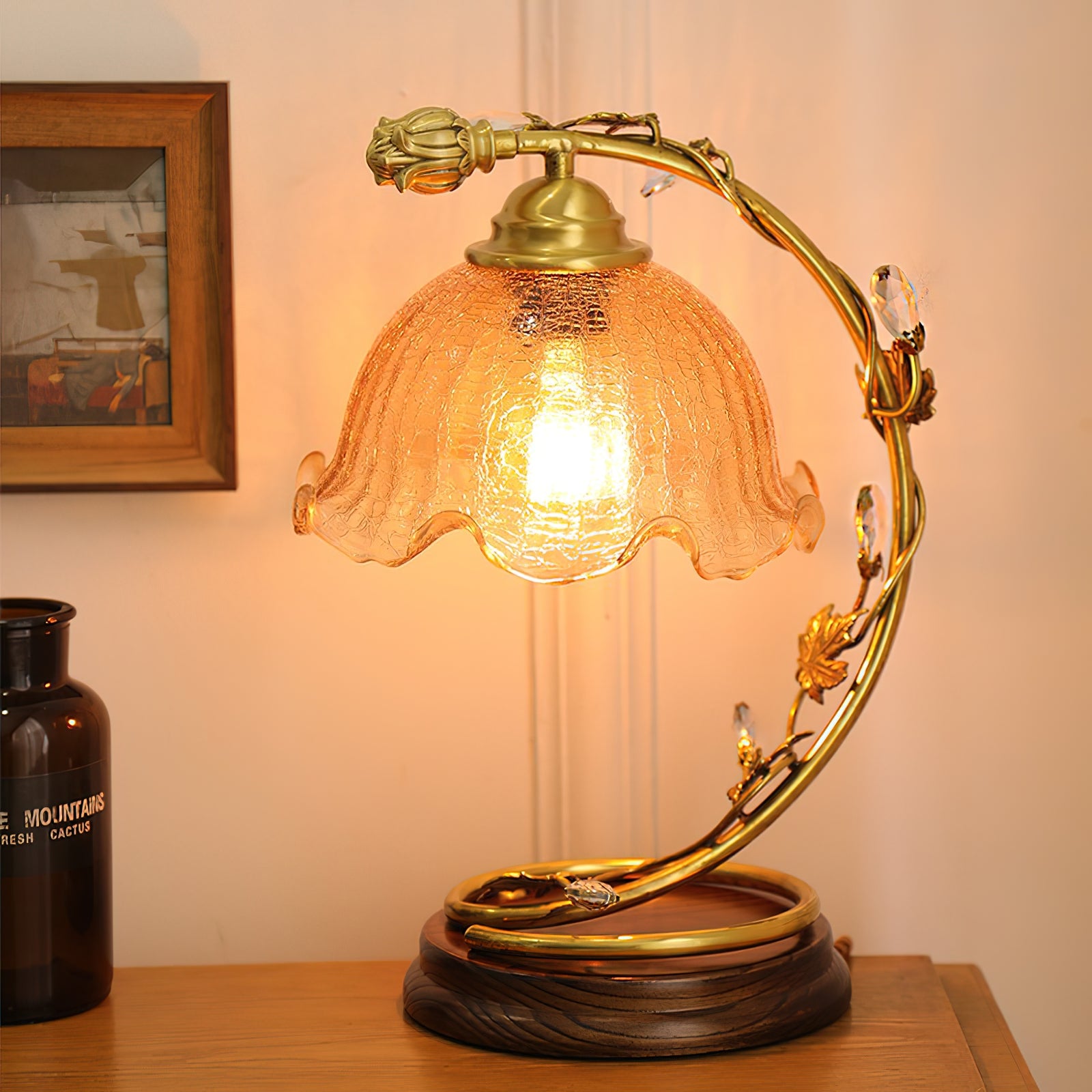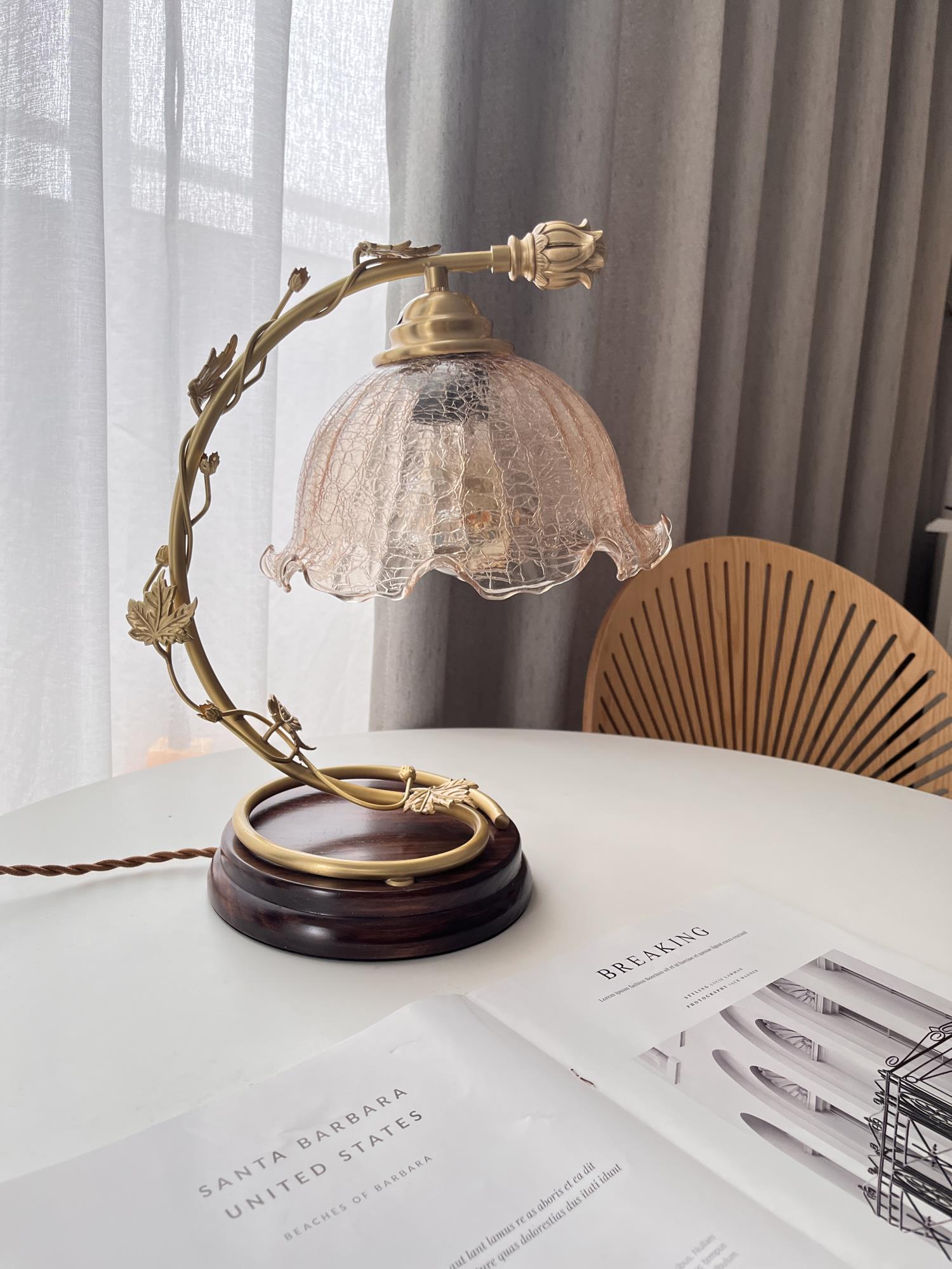 Kauniisti muotoiltu säröillyn lasin messinkipöytävalaisin lisää ripauksen eleganssia mihin tahansa huoneeseen. Valmistettu korkealaatuisesta lasista, messingistä ja saarnipuusta, tämä valaisin huokuu sekä tyyliä että kestävyyttä. Sen ruskea lampunvarjostin täydentää halkeilevaa lasia luoden lämpimän ja kutsuvan tunnelman.