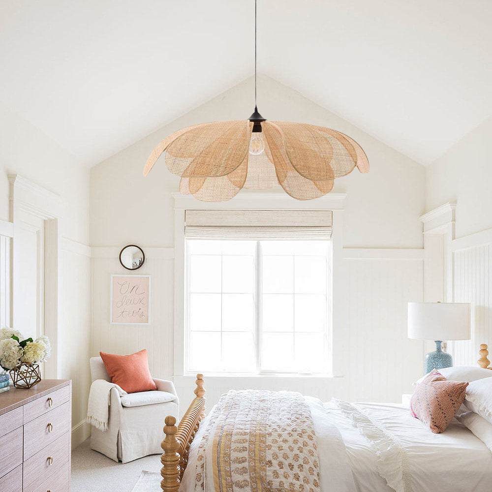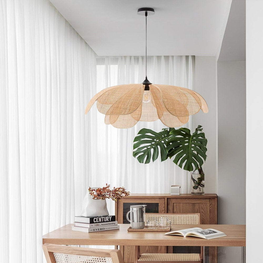 Upota tilasi Creative Wabi Sabi Rattan Petal Flush Mount kattovalaisimen taiteelliseen viehätysvoimaan. Tämä ainutlaatuinen valaisin yhdistää saumattomasti luovuuden ja Wabi Sabi -estetiikan maalaismaisen viehätyksen. Terälehden muotoinen rottinkimuotoilu luo kiehtovan visuaalisen vaikutelman ja luo lämpimän ja kutsuvan tunnelman mihin tahansa huoneeseen.