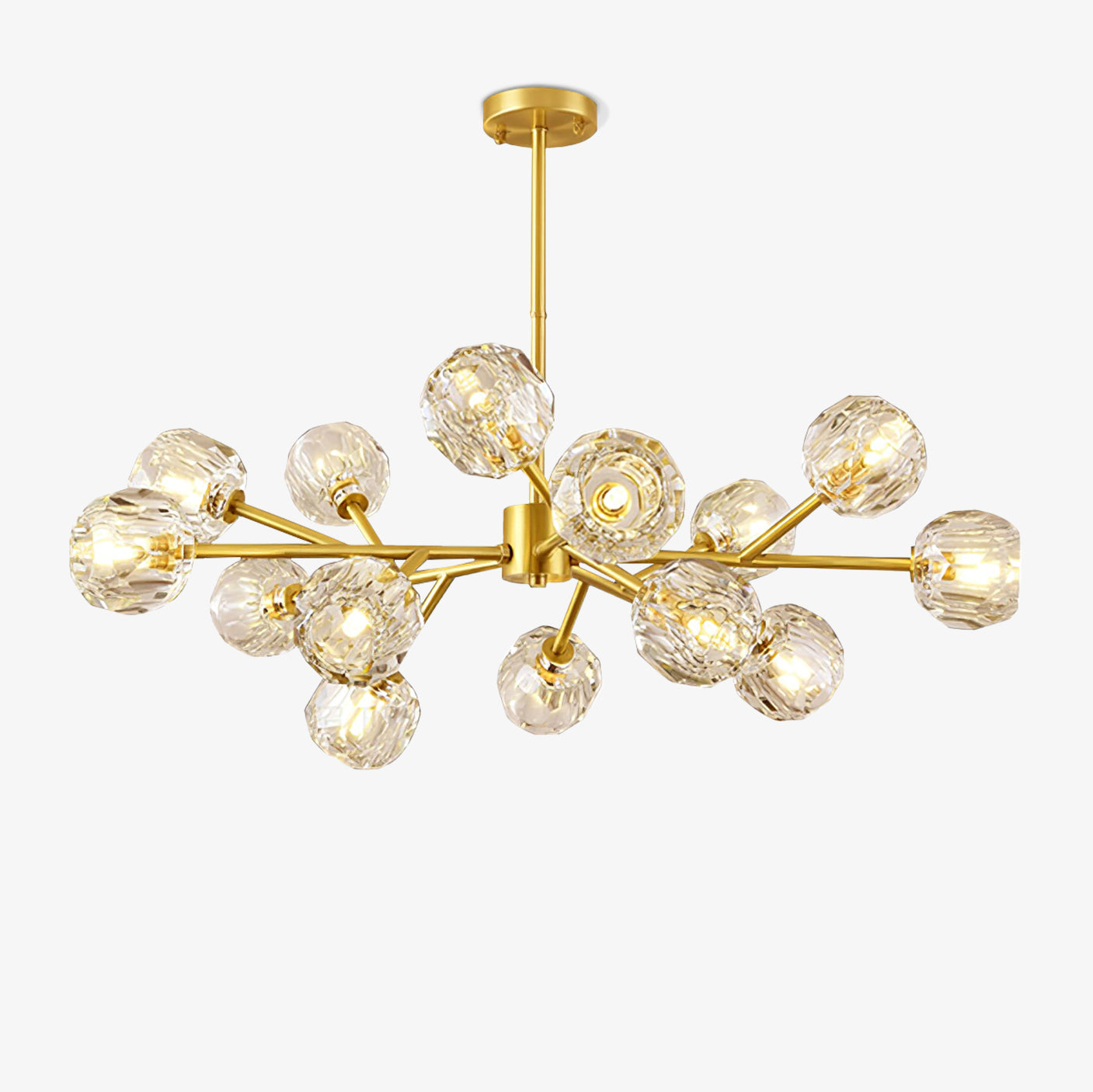 Kiinteästä messingistä ja kristallilasista valmistettu veistosteline on osoitus intohimosta ylellisiä materiaaleja ja ylivertaista käsityötä kohtaan. 1960-luvun muotoilun minimalistista henkeä herättävä jokainen hienojakoinen pallo on hiottu ja kiillotettu käsin heijastamaan ja taittamaan valoa. Valaise sisätilaasi tällä modernilla kattokruunulla.