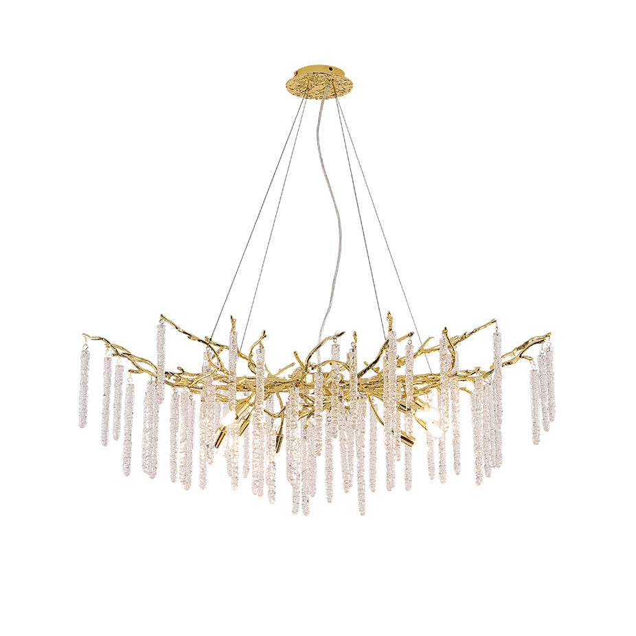 Kauniisti messingistä valmistettu Crystal Icicles Branch -messinkikruunu lisää ripauksen eleganssia jokaiseen kotiin. Laskevat jääpuikot ja oksat luovat upean esityksen ja luovat ainutlaatuisen ilmeen, joka tekee varmasti vaikutuksen. Hienovaraisesti kristalleilla koristeltu se luo lämpimän ja kutsuvan tunnelman mihin tahansa huoneeseen.