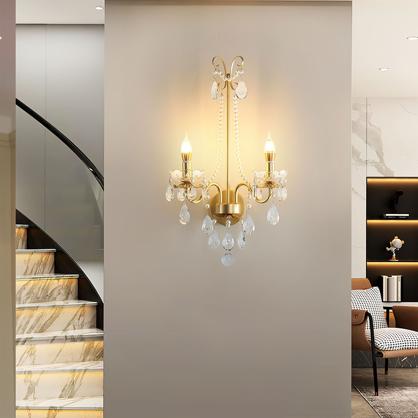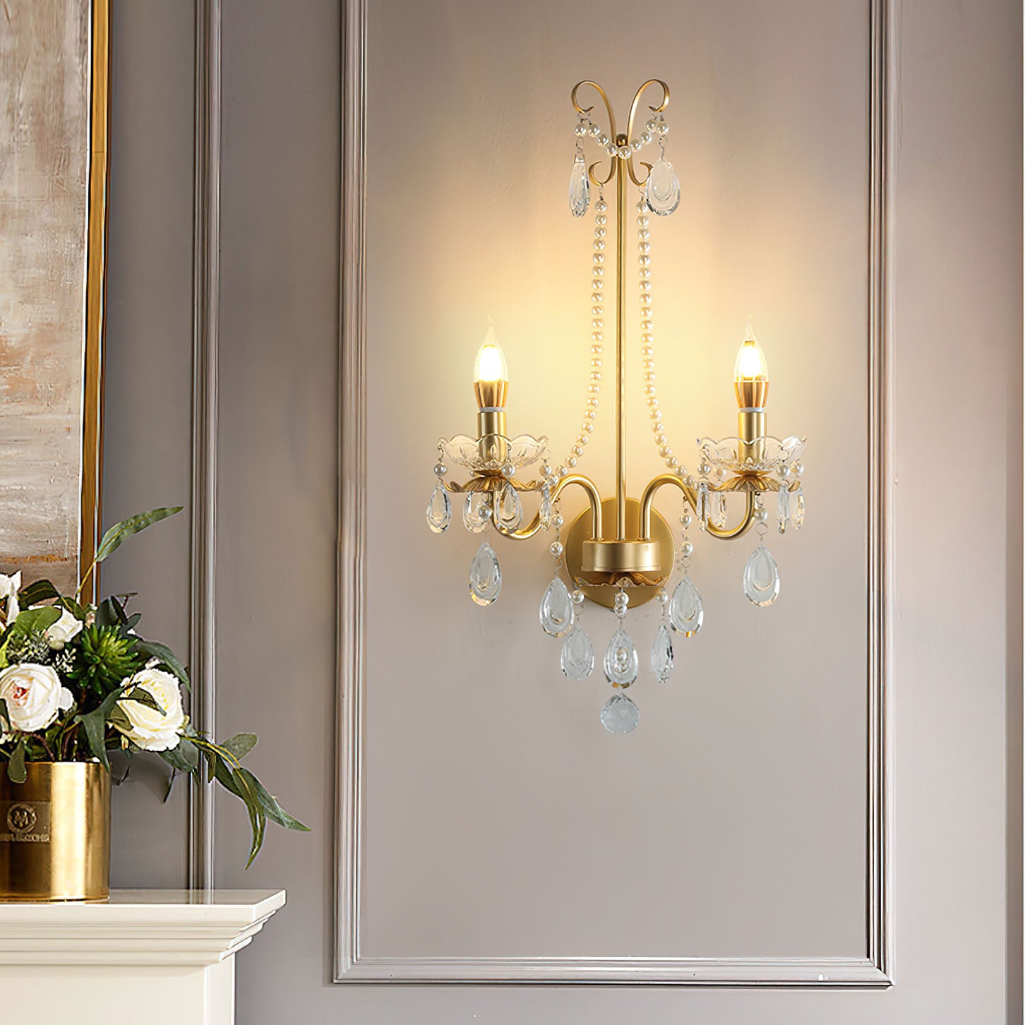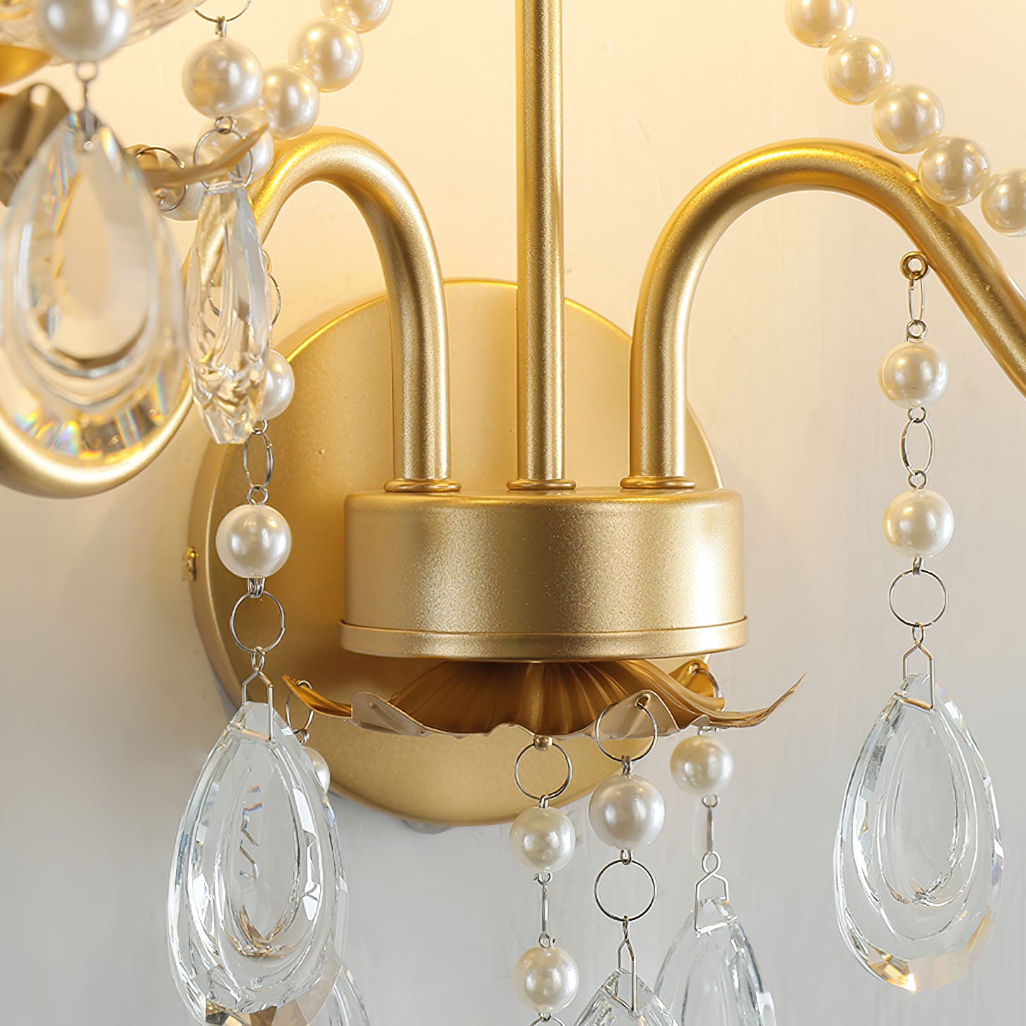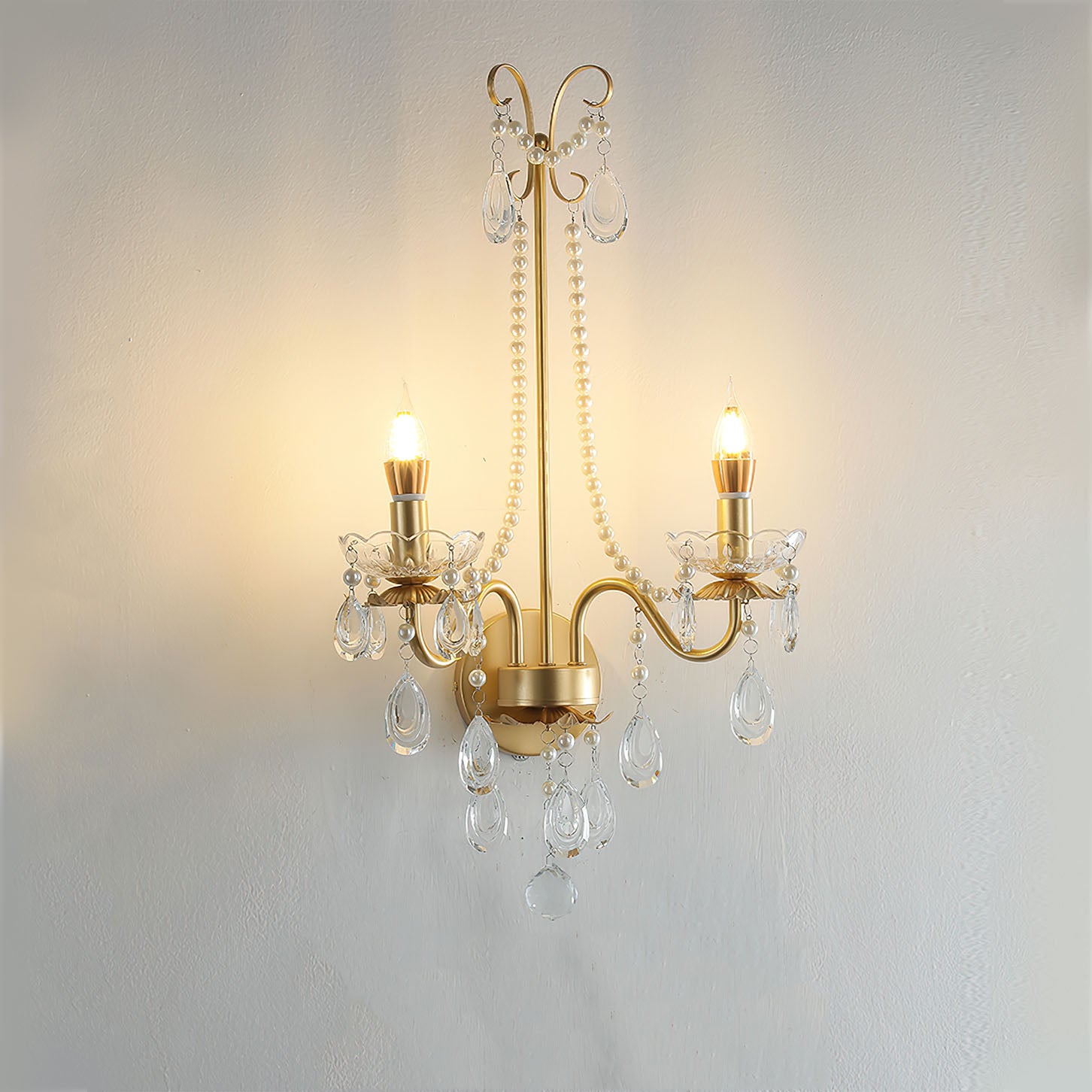 Tämä Crystal Pearl Chain Wall -valaisin huokuu klassista ranskalaista tunnelmaa hienostuneine yksityiskohtineen. Ylellisen kristallimateriaalin ansiosta se sopii täydellisesti eteiseen, makuuhuoneeseen, olohuoneeseen tai portaikkoon.