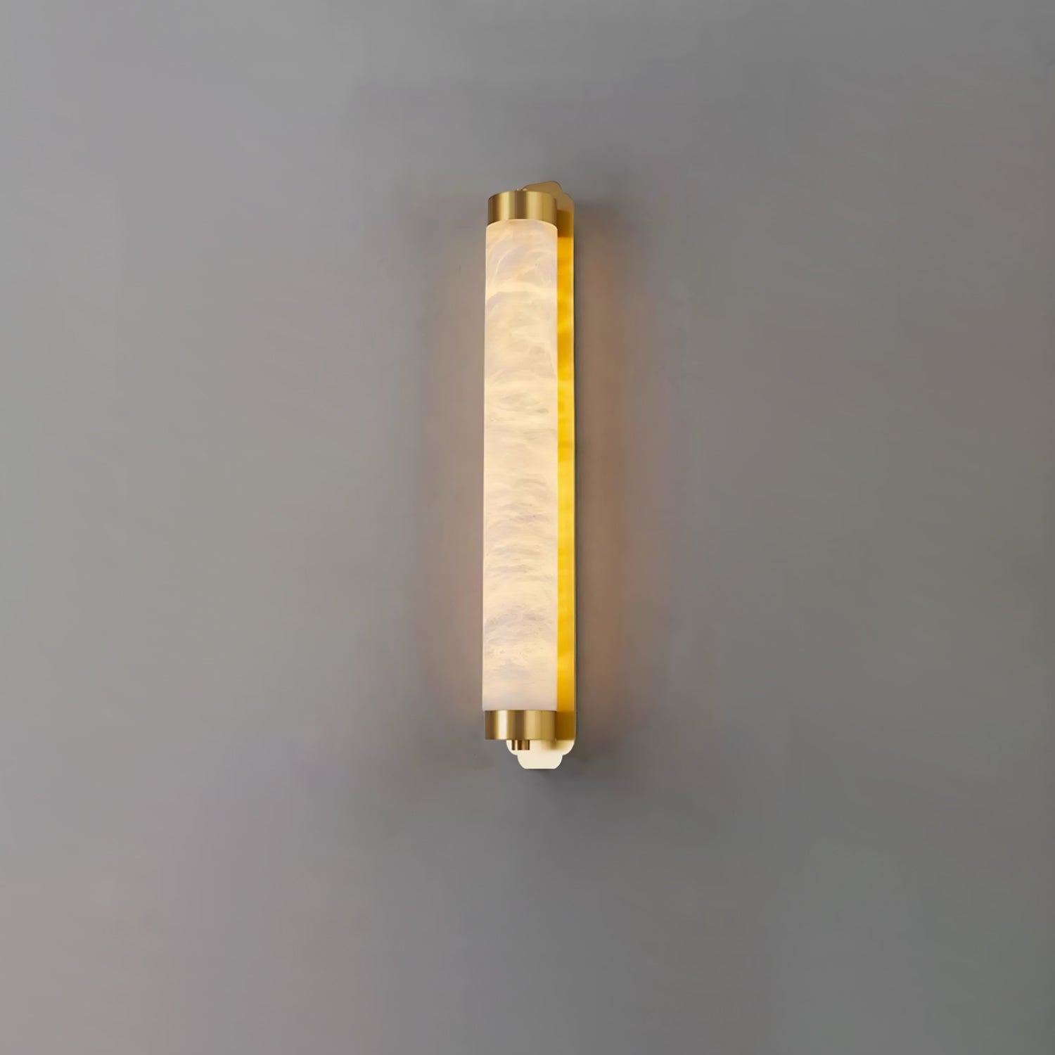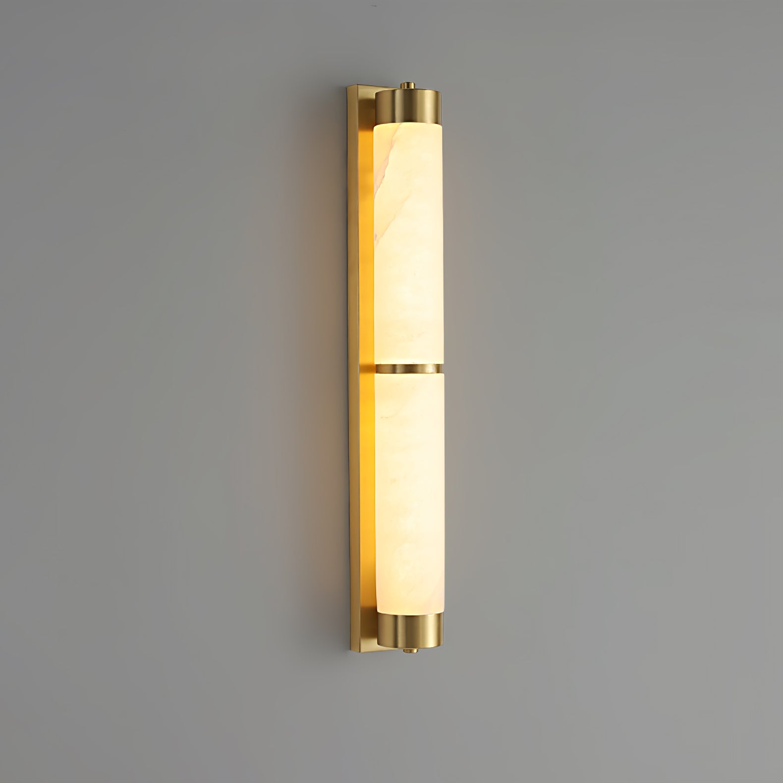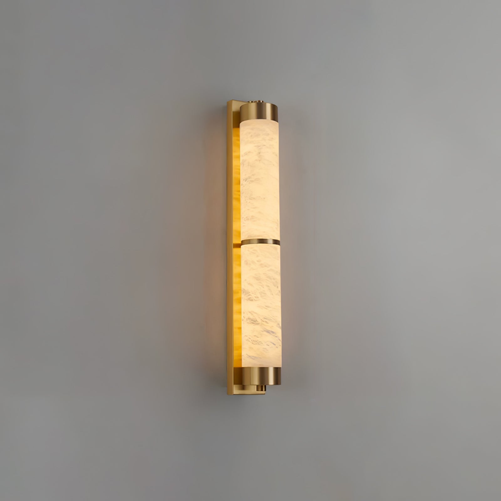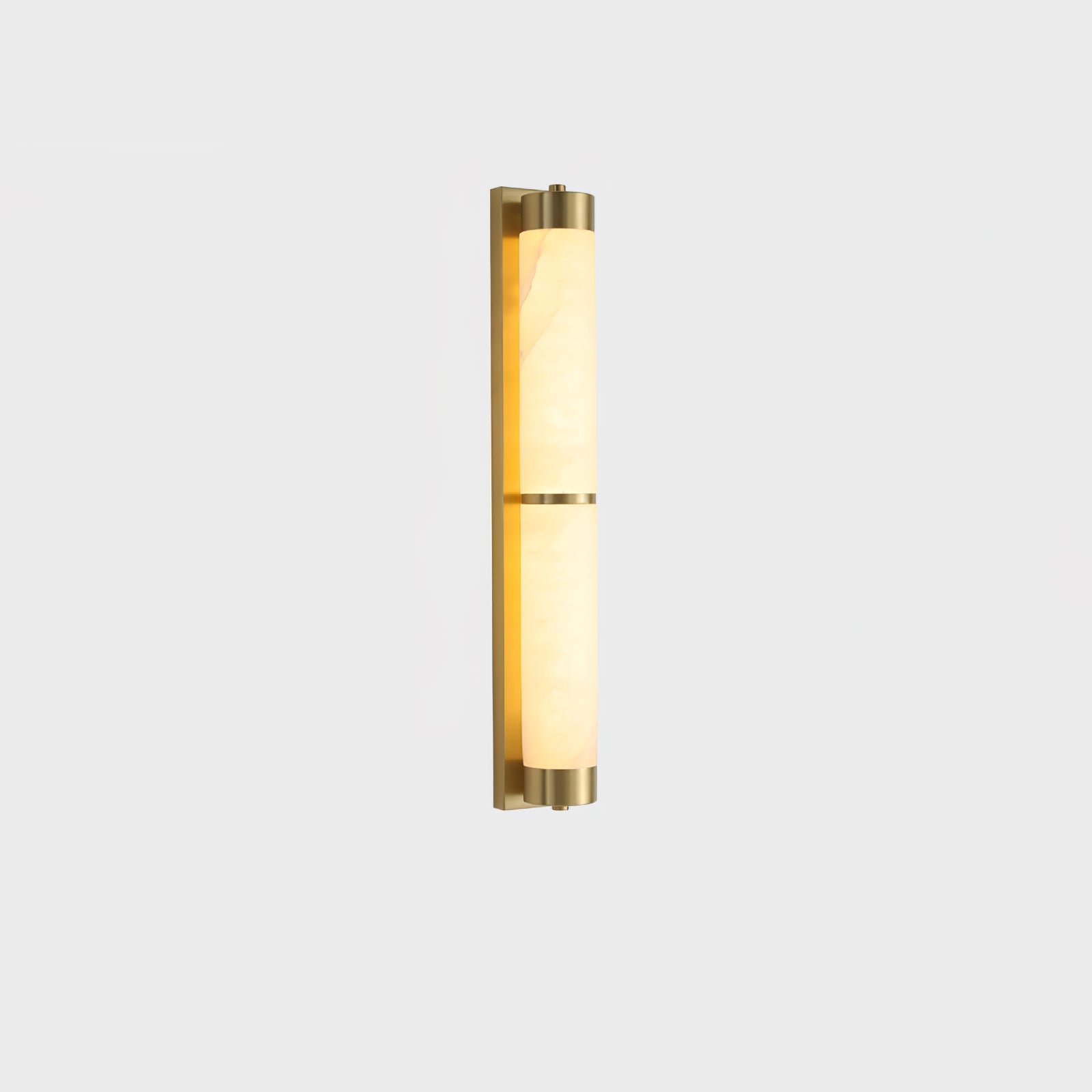 Cylindra Alabaster Brass Wall Light on osoitus yksinkertaisuuden eleganssista ja luonnonmateriaalien kauneudesta. Hienoimmasta messingistä valmistettu ja sylinterimäisellä alabasterivarjostimella koristeltu seinävalaisin huokuu lämmintä, tunnelmallista hehkua, joka korostaa alabasterin ainutlaatuista suonistoa ja kermaista rakennetta.